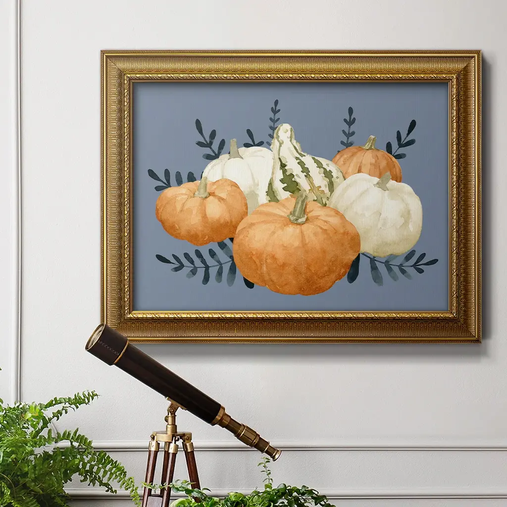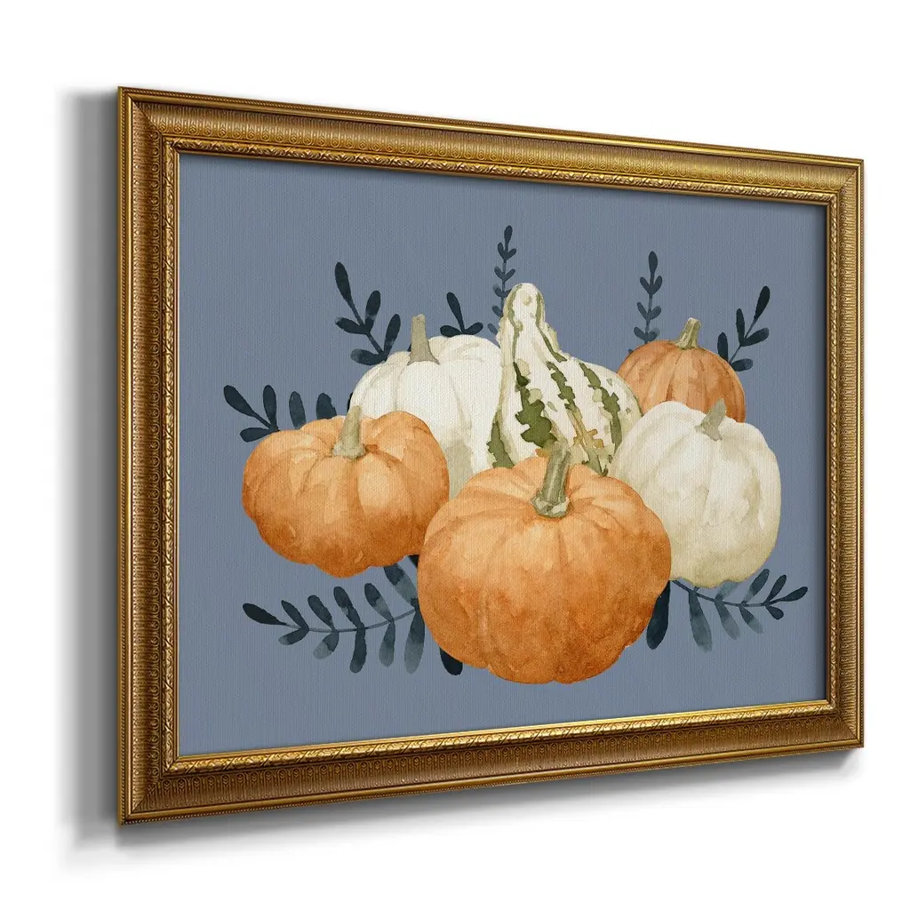 Autumn Orange & Blues II Premium Framed Canvas- Ready to Hang A Premium Framed Canvas created to last. Framed in distressed wood and available in an array of sizes and colors Featuring a beveled a solid wood stretcher bar, each piece comes ready to hand 3 SIZES AVAILABLE 16''X20'' - Overall Size 18'X27'' - Overall Size 24''x36'' - Overall Size Each piece is made to order. Each piece comes with hanging hardware. Made in the USA Ready to Hang Giclee Paper Print Acrylic Glass Beveled Matt Board
