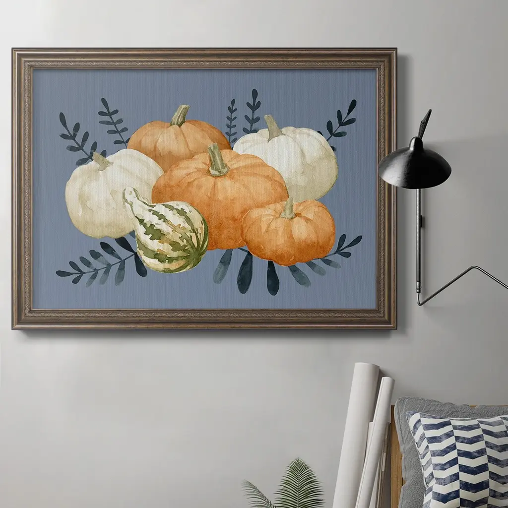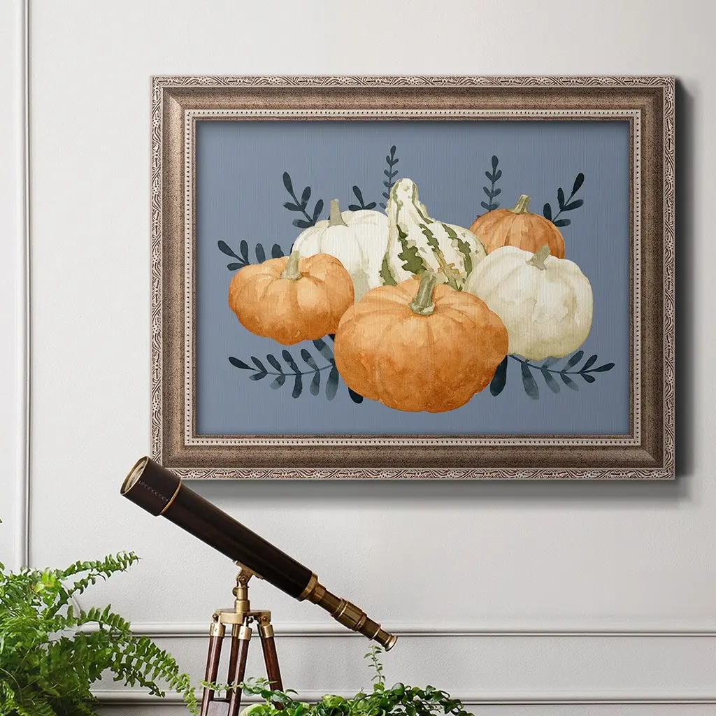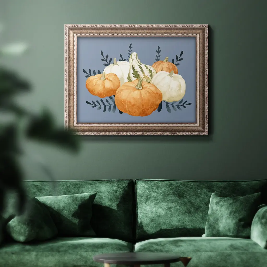 Autumn Orange & Blues II Premium Framed Canvas- Ready to Hang A Premium Framed Canvas created to last. Framed in distressed wood and available in an array of sizes and colors Featuring a beveled a solid wood stretcher bar, each piece comes ready to hand 3 SIZES AVAILABLE 16''X20'' - Overall Size 18'X27'' - Overall Size 24''x36'' - Overall Size Each piece is made to order. Each piece comes with hanging hardware. Made in the USA Ready to Hang Giclee Paper Print Acrylic Glass Beveled Matt Board