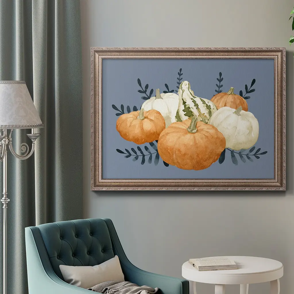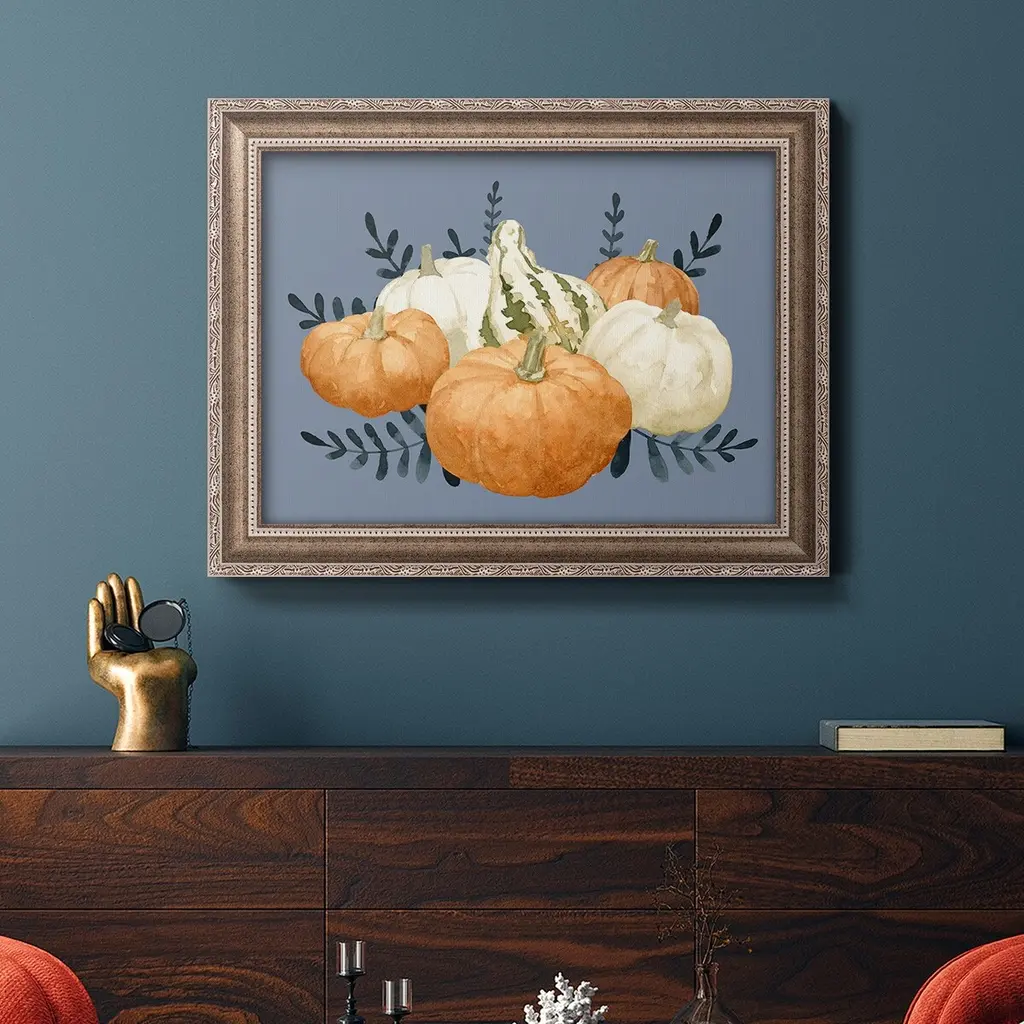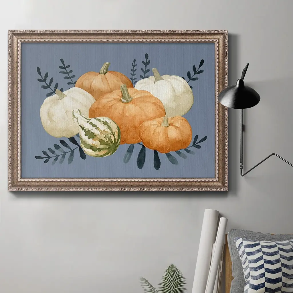 Autumn Orange & Blues II Premium Framed Canvas- Ready to Hang A Premium Framed Canvas created to last. Framed in distressed wood and available in an array of sizes and colors Featuring a beveled a solid wood stretcher bar, each piece comes ready to hand 3 SIZES AVAILABLE 16''X20'' - Overall Size 18'X27'' - Overall Size 24''x36'' - Overall Size Each piece is made to order. Each piece comes with hanging hardware. Made in the USA Ready to Hang Giclee Paper Print Acrylic Glass Beveled Matt Board