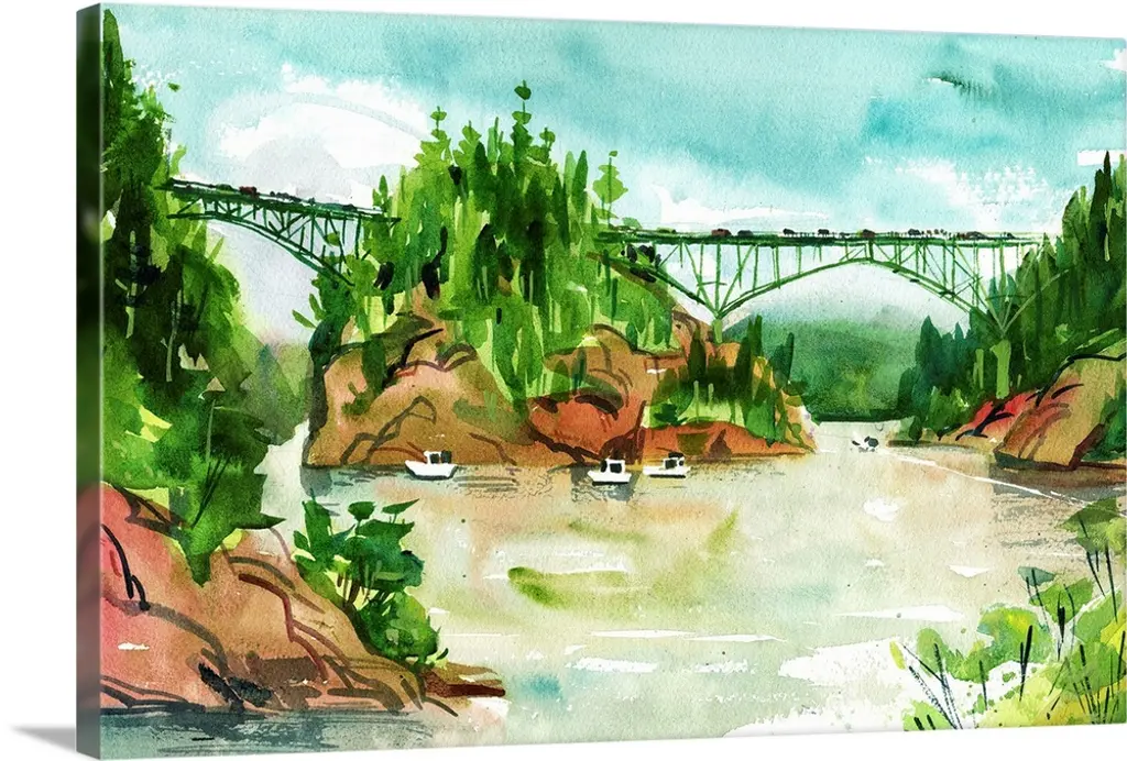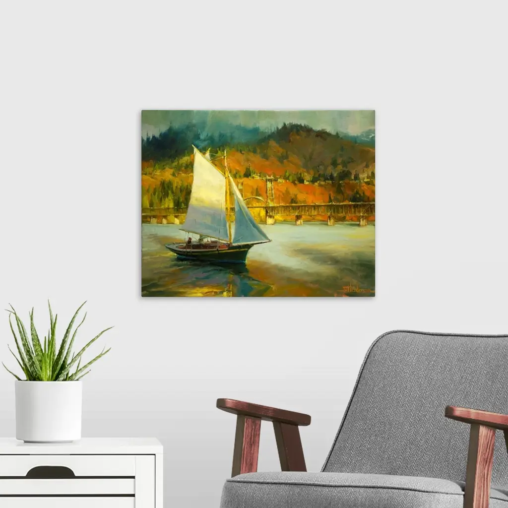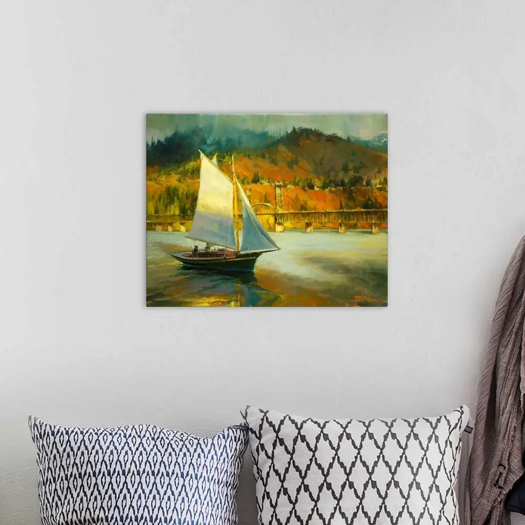 Traditional painting of a sailboat on the Columbia River Gorge river in autumn near a bridge in the evening