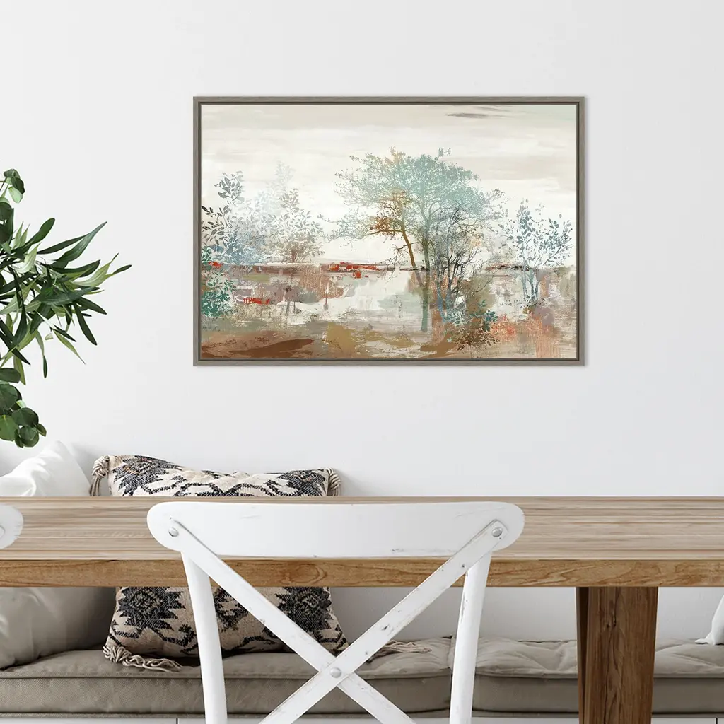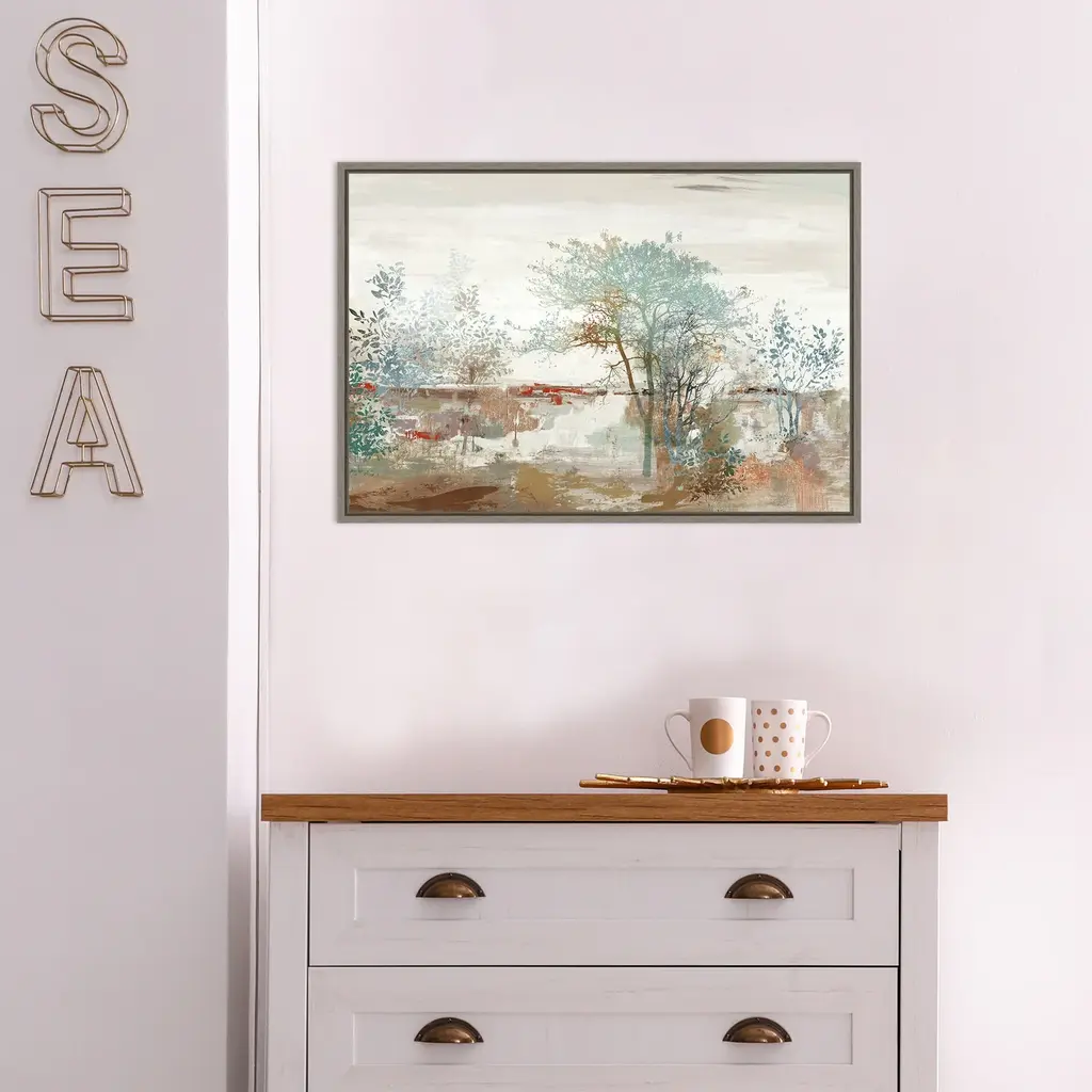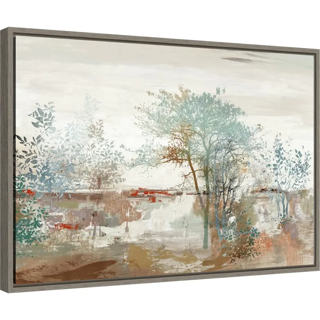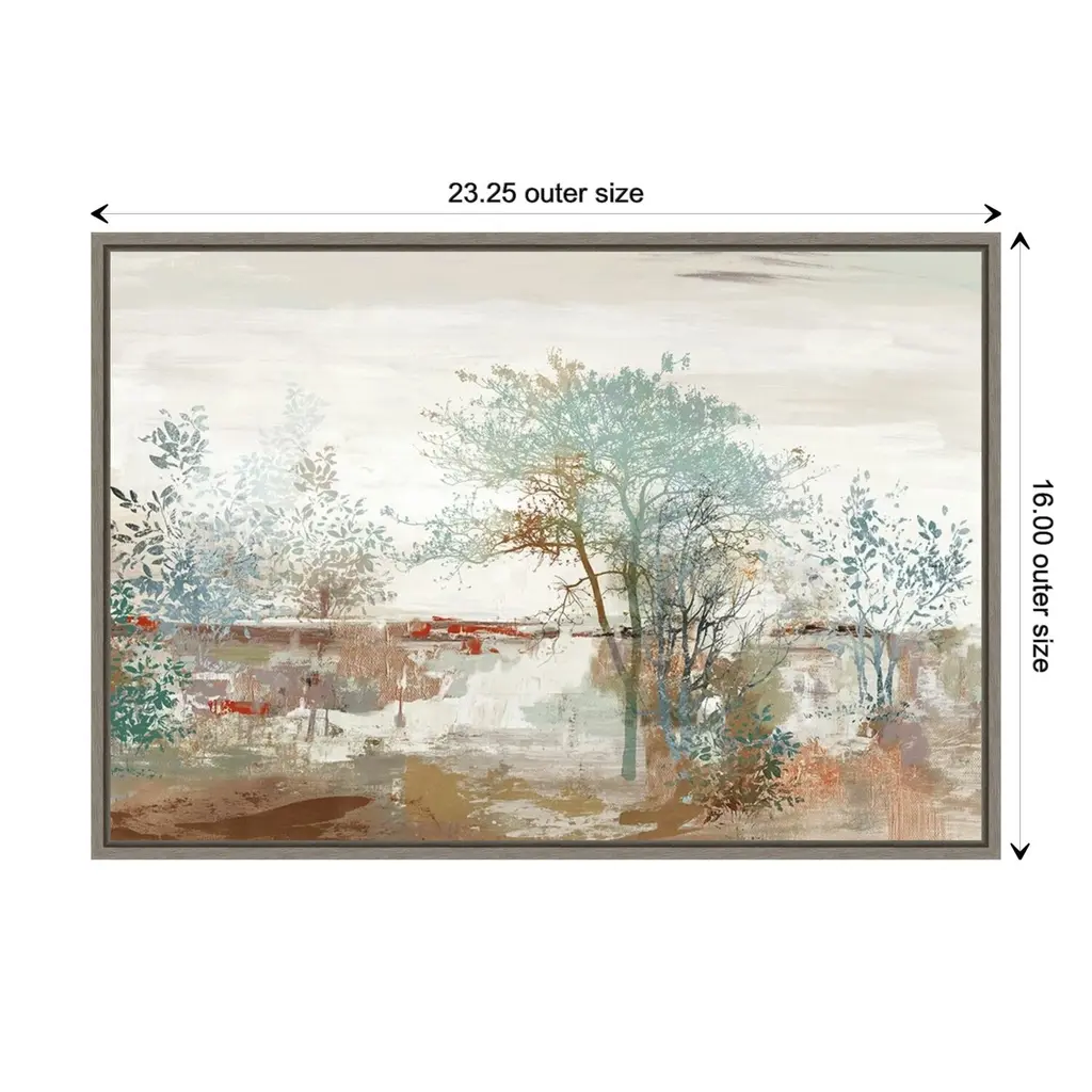 A colorful landscape spreads before you, inviting you to take in the autumn silence as leaves begin to change colors. Off-white patches suggest a quiet body of water that reflect the colors of an overcast sky.Features:FLOAT FRAMED CANVAS ART: Canvas is framed in a floated style that showcases a narrow gap between the edge of the gallery wrapped canvas and the frame. The wrapped canvas appears as if it's "floating" on the frame. The overall look is clean, modern and upscale.QUALITY: Canvas is printed with high quality, fade-resistant inks and stretched to hide corner folds. Canvas is stretched across a solid surface to resist sagging.AUTHENTICITY: Canvas is printed and professionally framed in Madison, Wisconsin USA with authentically licensed artwork.EFFORTLESS HANGING: Ready to hangfor easy installation. The metal sawtooth hangers come attached on the inset back for easy wall display.CUSTOM PACKAGED: Canvas is custom packaged for protection in shipment to arrive without damage.Details:Artist: Allison PearceTitle: Autumn Silence (Trees)Product type: Framed Canvas BoxStyle: Modern ContemporaryFormat: landscapeSize: SmallSubject: OtherFrame: Sylvie Greywash .5"Image dimensions: 14.50 inches high x 21.75 inches wideOutside dimensions: 16 inches high x 23.25 inches wide x 1.875 inches deep