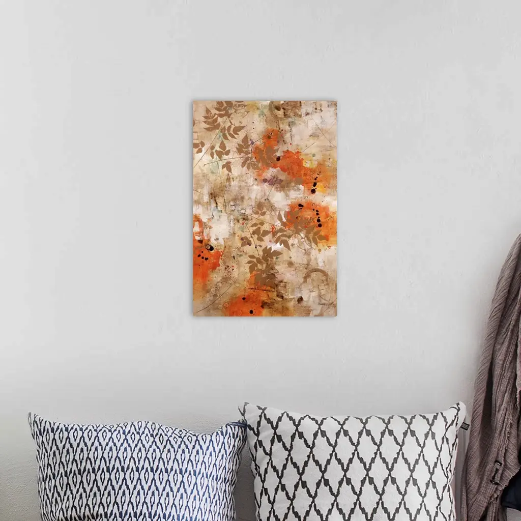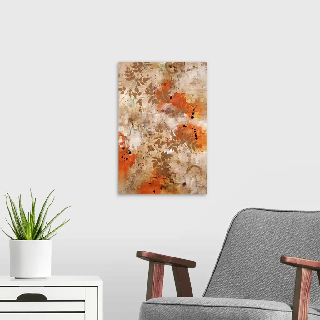 Abstract artwork that has splashes of orange and small branches with leaves painted over the print.