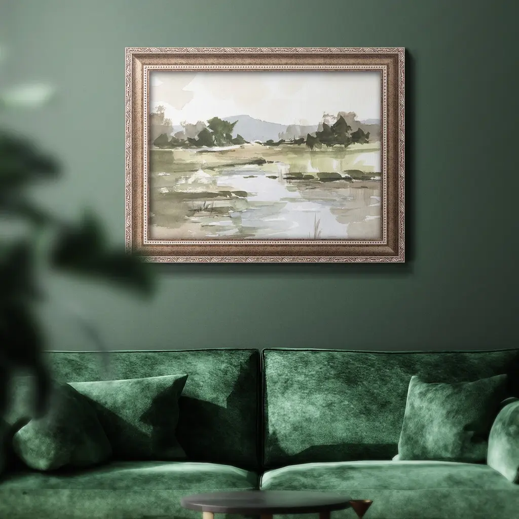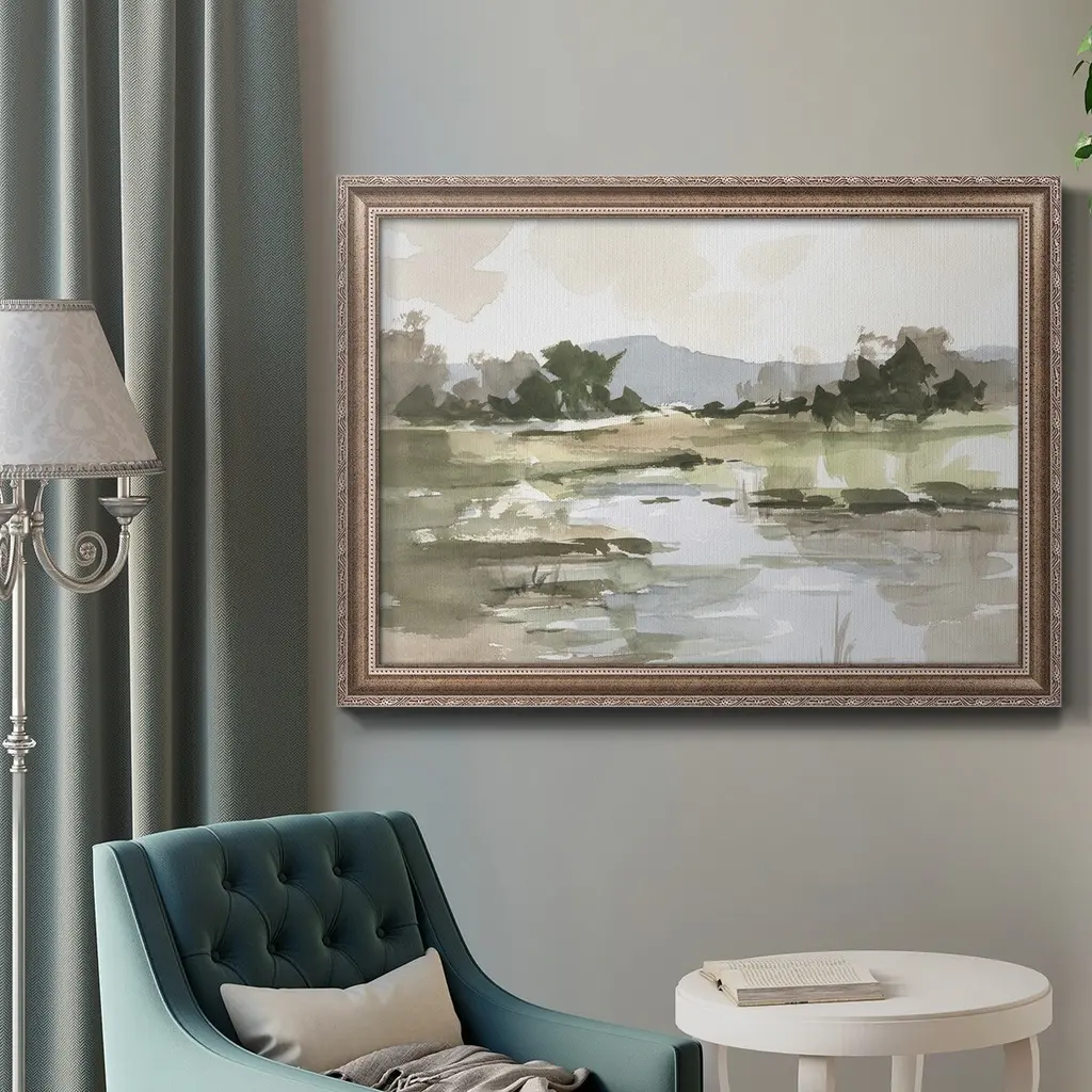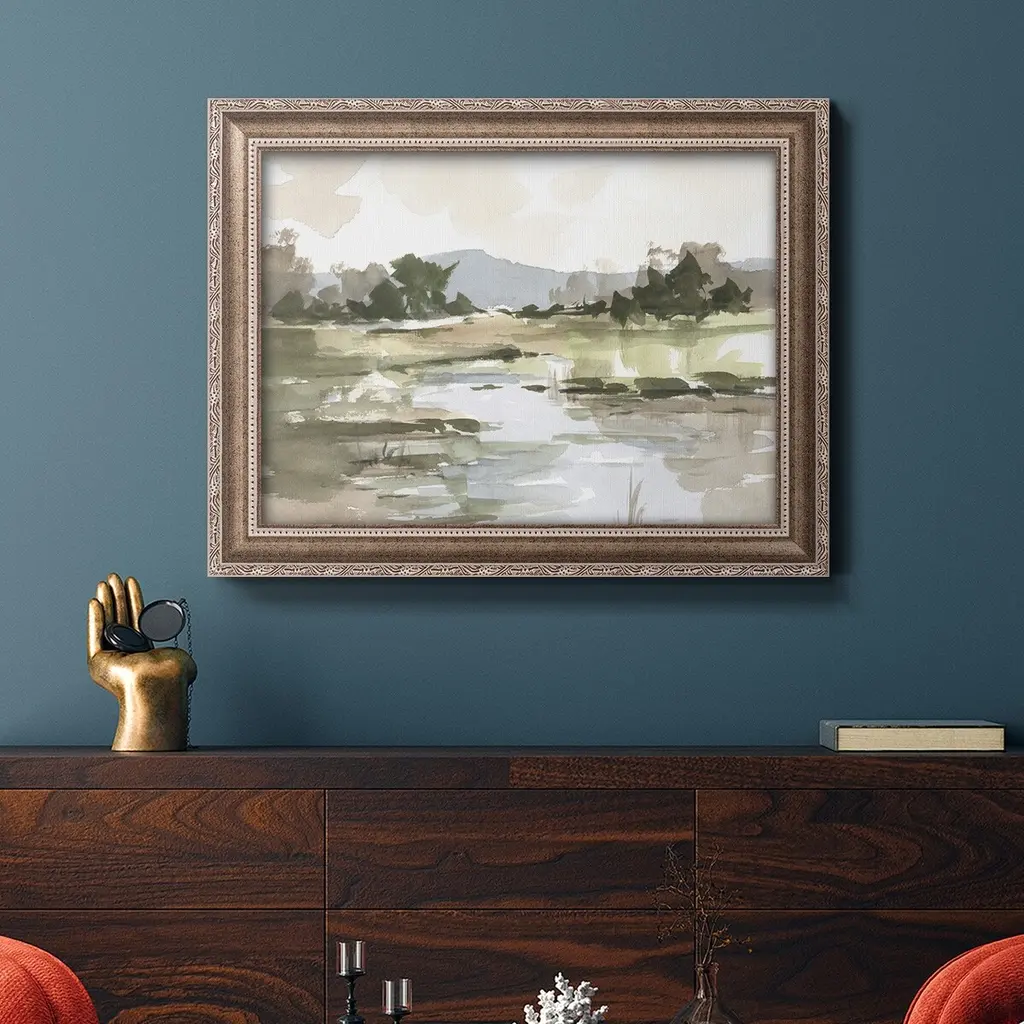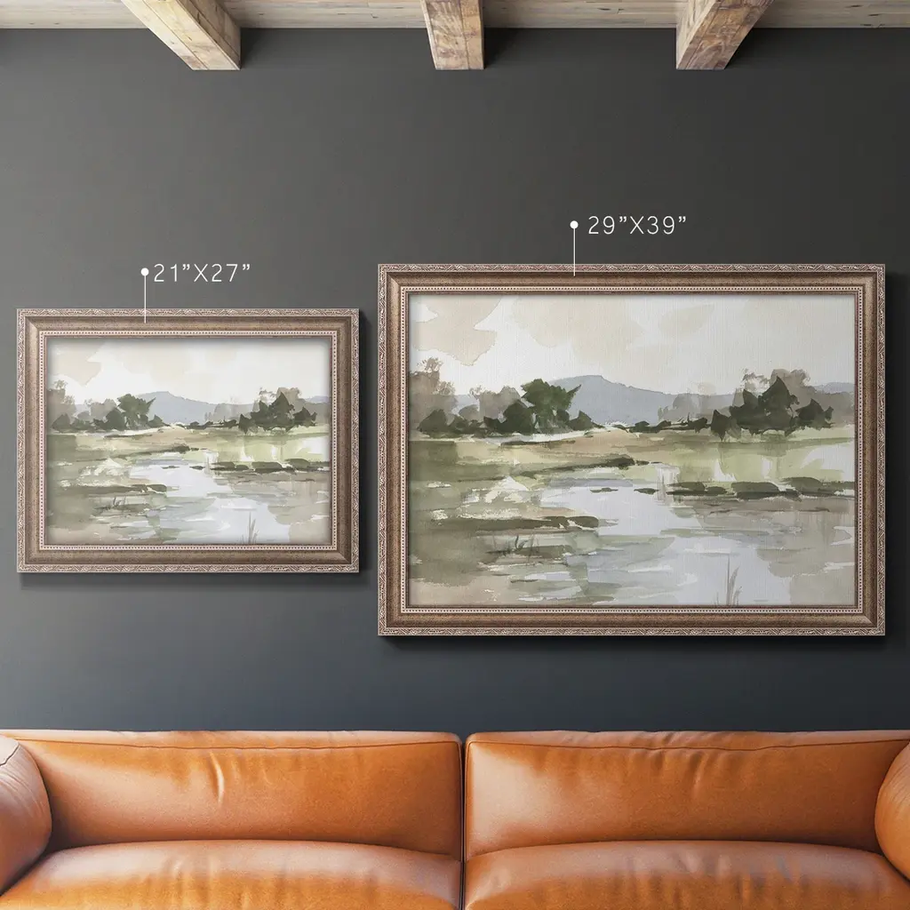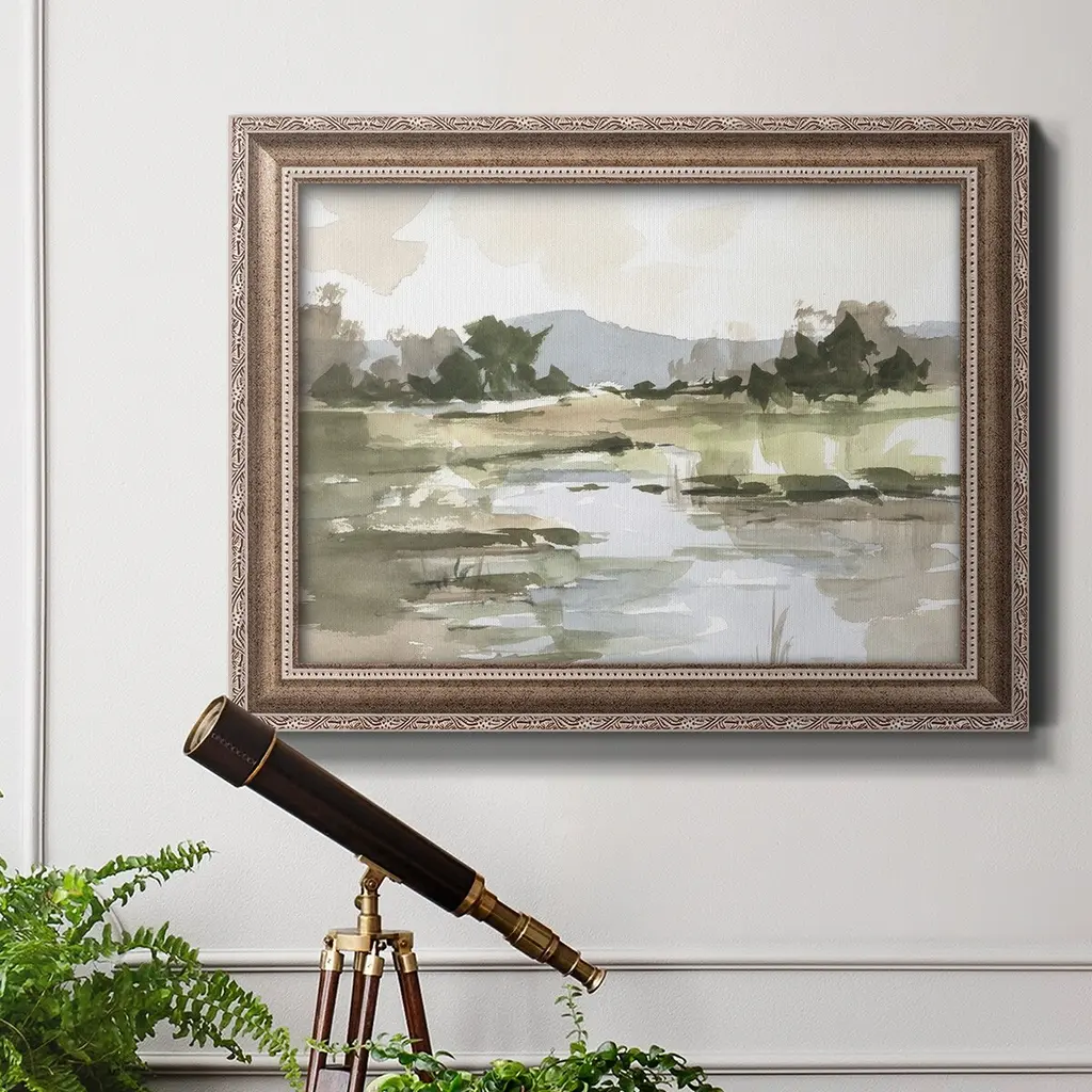 Autumn Stream I Premium Framed Canvas- Ready to Hang A Premium Framed Canvas created to last. Framed in distressed wood and available in an array of sizes and colors Featuring a beveled a solid wood stretcher bar, each piece comes ready to hand 3 SIZES AVAILABLE 16''X20'' - Overall Size 18'X27'' - Overall Size 24''x36'' - Overall Size Each piece is made to order. Each piece comes with hanging hardware. Made in the USA Ready to Hang Giclee Paper Print Acrylic Glass Beveled Matt Board