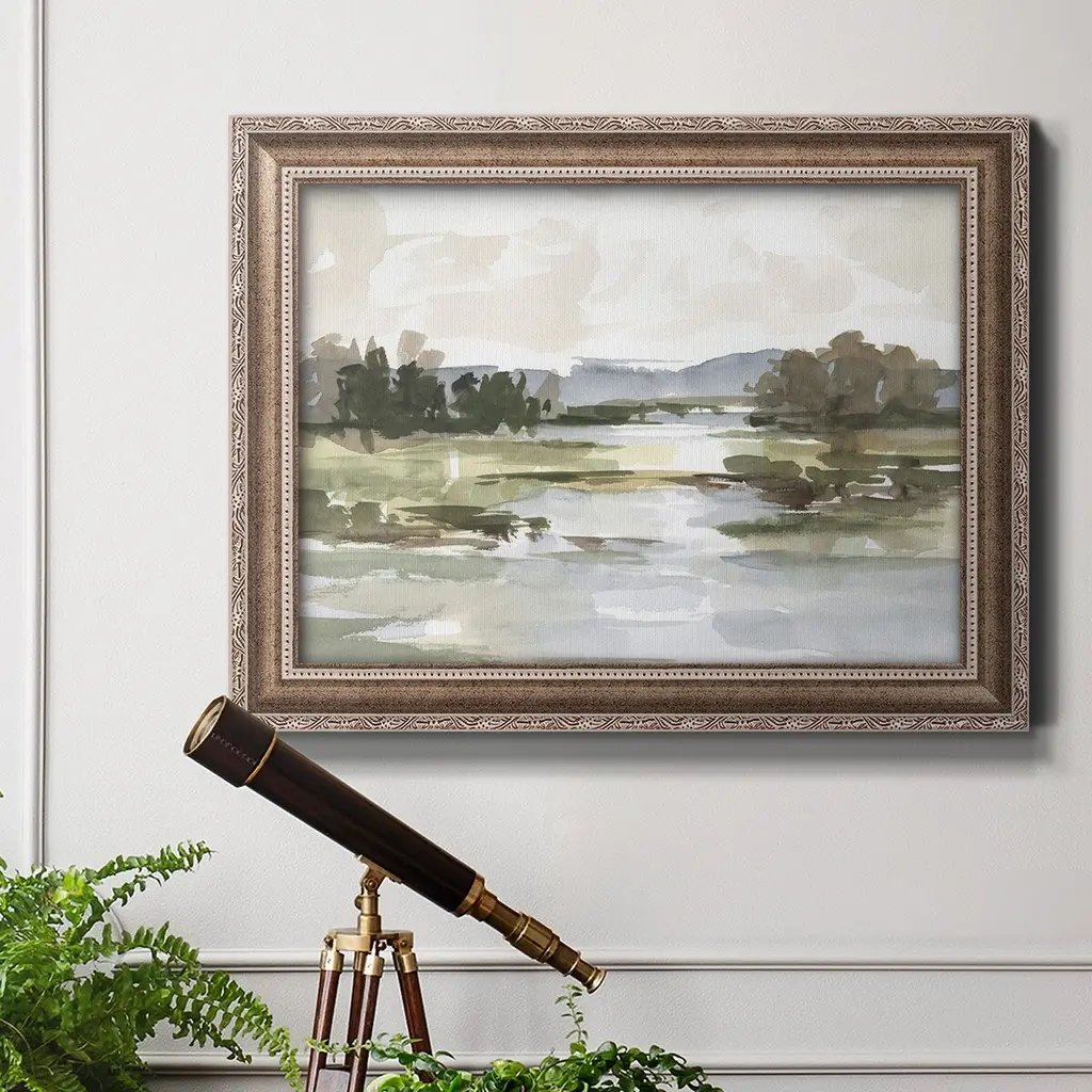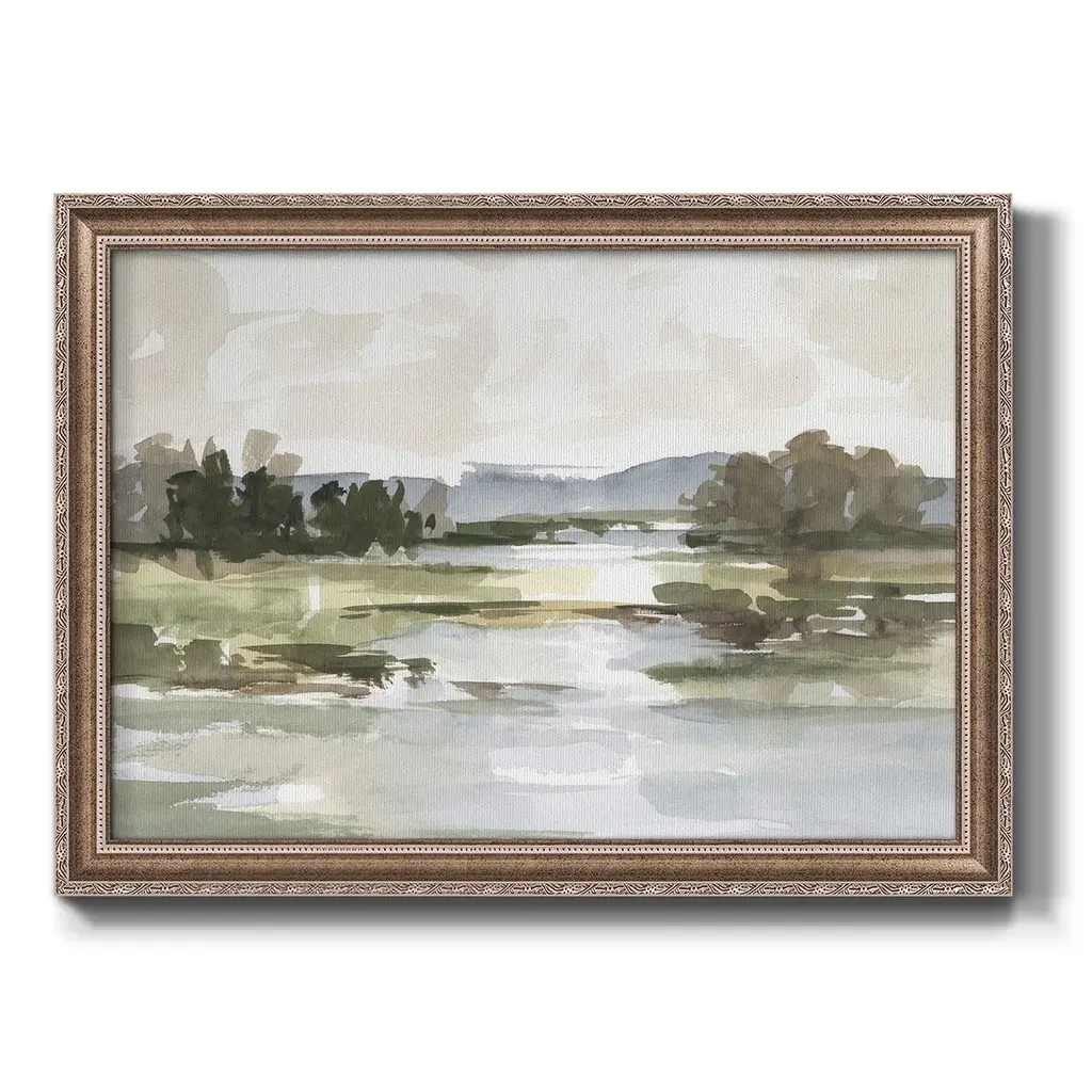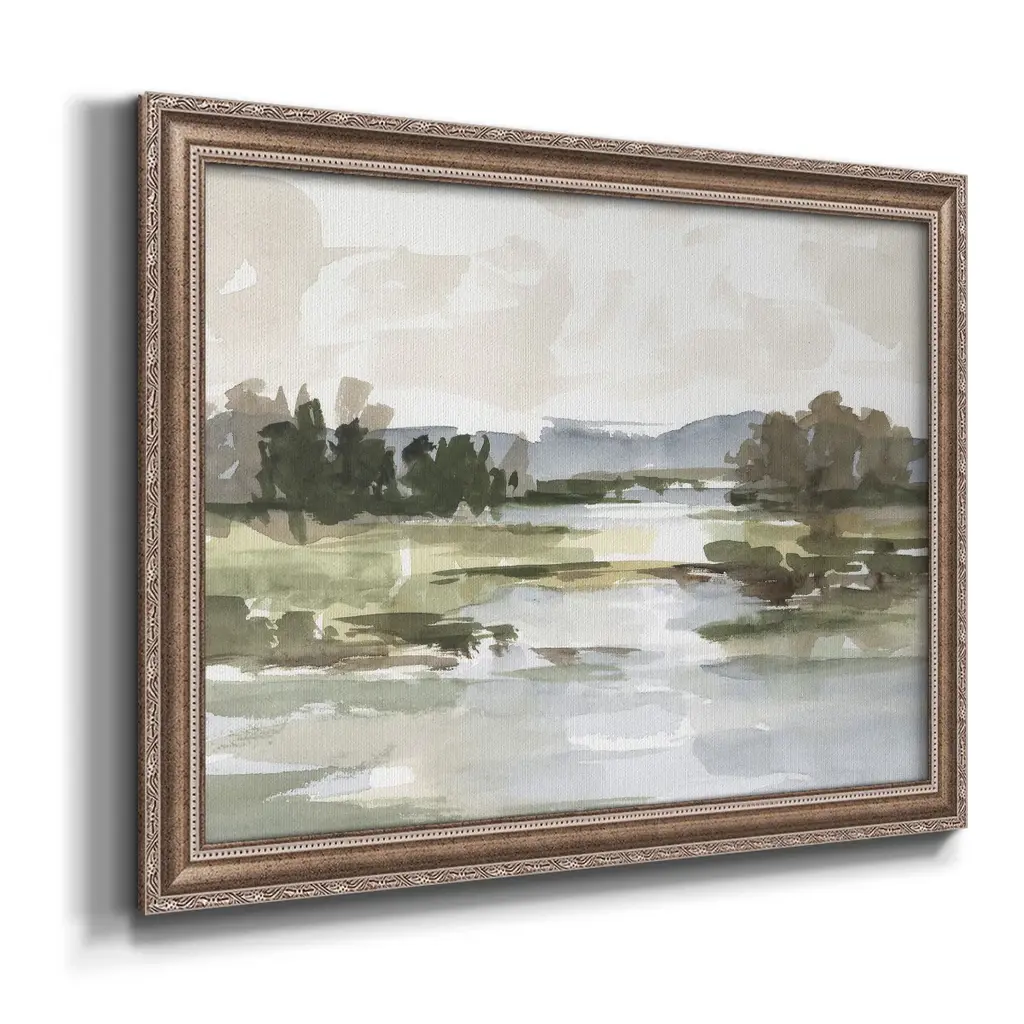Autumn Stream II Premium Framed Canvas- Ready to Hang A Premium Framed Canvas created to last. Framed in distressed wood and available in an array of sizes and colors Featuring a beveled a solid wood stretcher bar, each piece comes ready to hand 3 SIZES AVAILABLE 16''X20'' - Overall Size 18'X27'' - Overall Size 24''x36'' - Overall Size Each piece is made to order. Each piece comes with hanging hardware. Made in the USA Ready to Hang Giclee Paper Print Acrylic Glass Beveled Matt Board