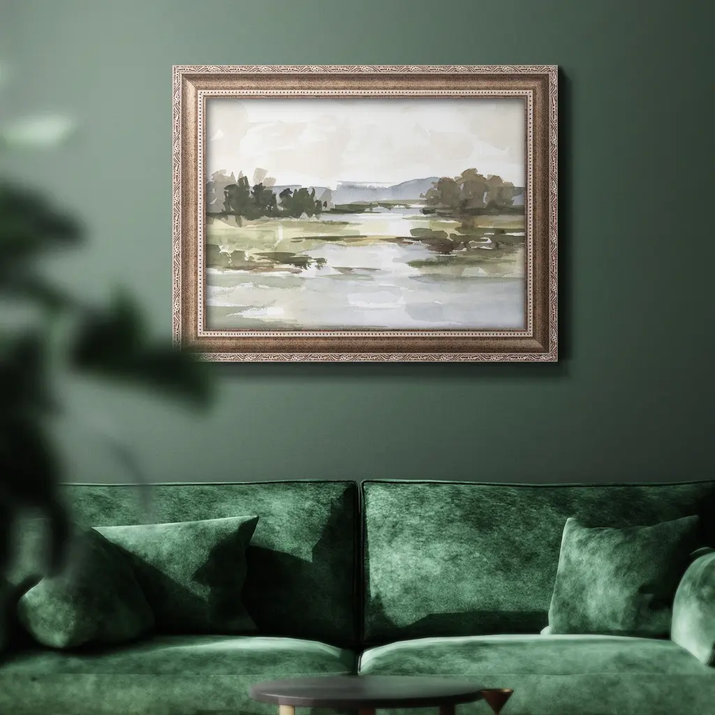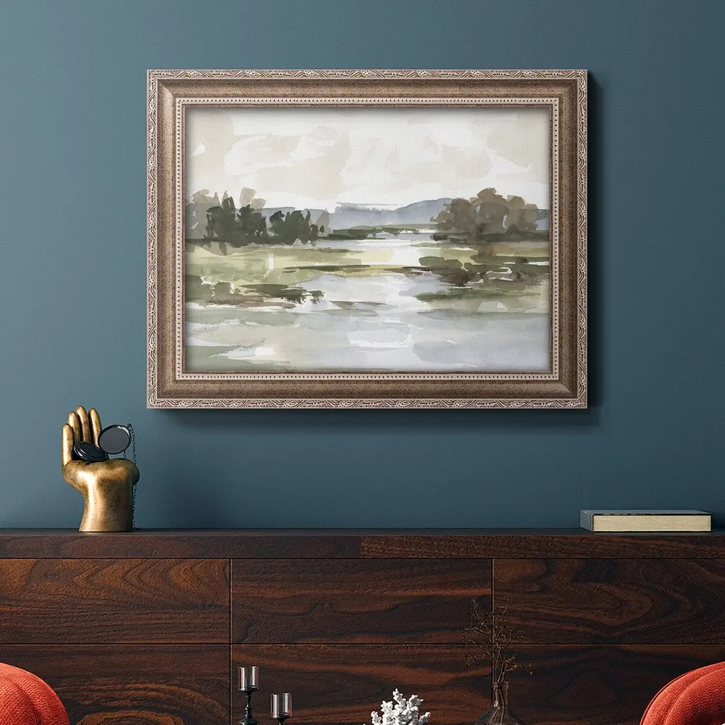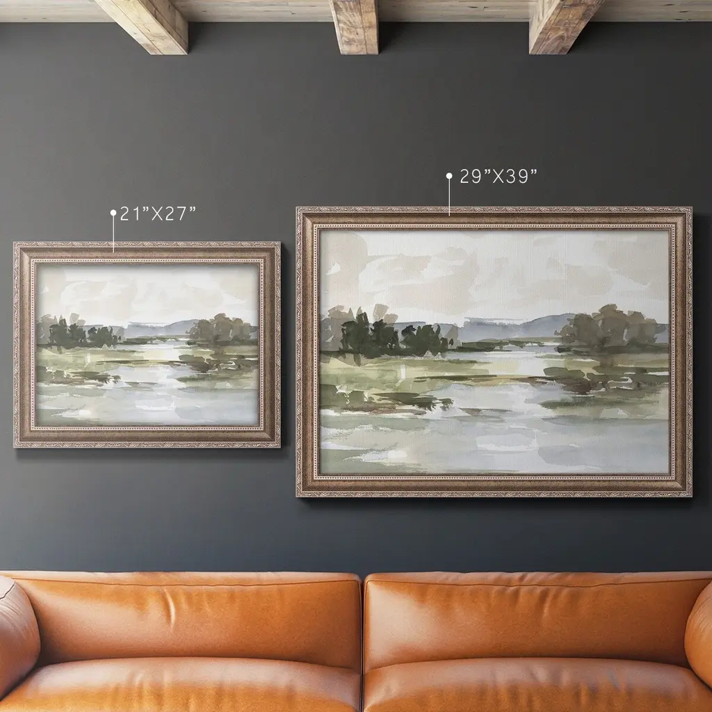 Autumn Stream II Premium Framed Canvas- Ready to Hang A Premium Framed Canvas created to last. Framed in distressed wood and available in an array of sizes and colors Featuring a beveled a solid wood stretcher bar, each piece comes ready to hand 3 SIZES AVAILABLE 16''X20'' - Overall Size 18'X27'' - Overall Size 24''x36'' - Overall Size Each piece is made to order. Each piece comes with hanging hardware. Made in the USA Ready to Hang Giclee Paper Print Acrylic Glass Beveled Matt Board