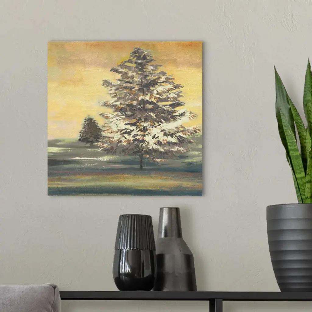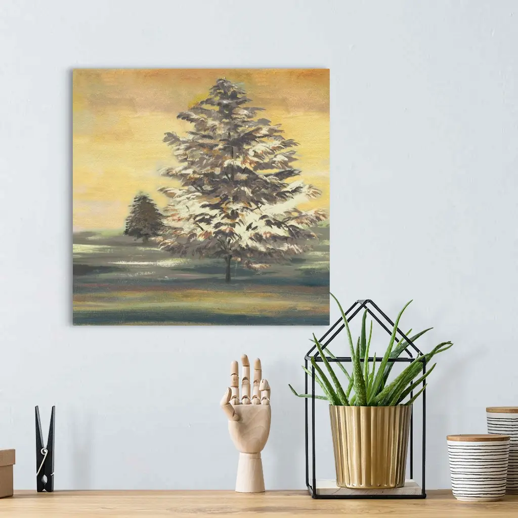 Square painting of an Autumn sunset with two large trees.