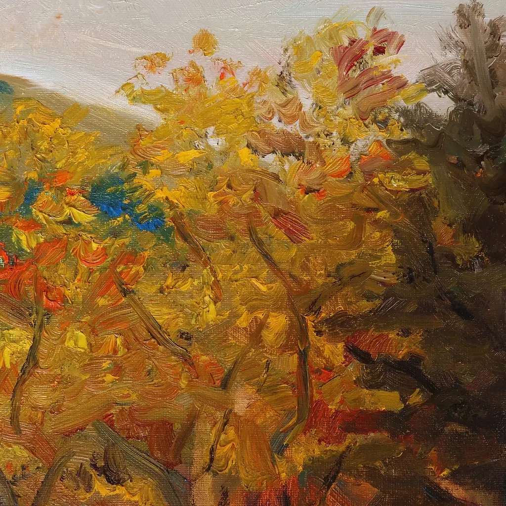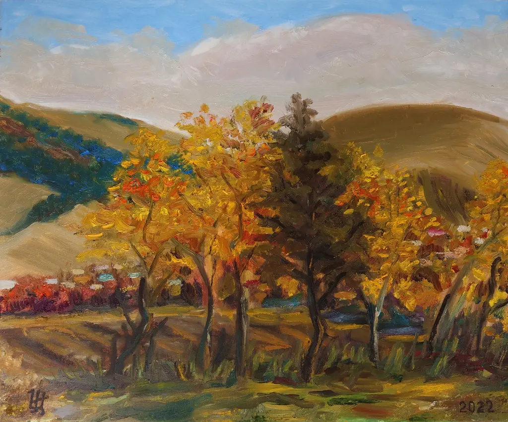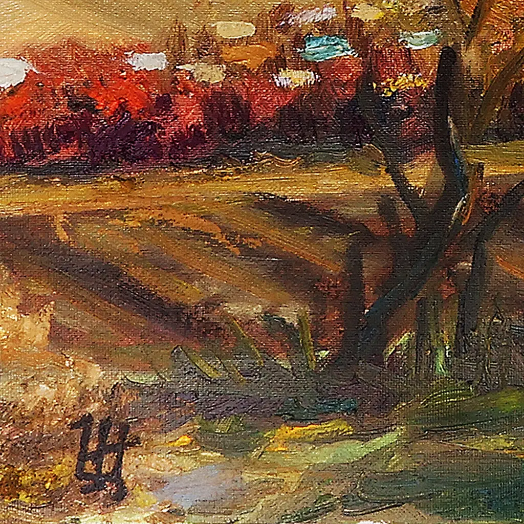 Nature dresses itself in golden hues when autumn arrives in the Armenian region. Known as the harvesting season, those windy days create a warm scene that artist Erik Alaverdyan captures with oil in an impressionist composition. Expert brushstrokes compose each element, depicting the region's classic beauty.The artwork arrives signed and stretched.