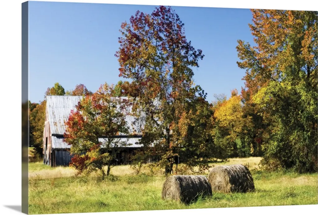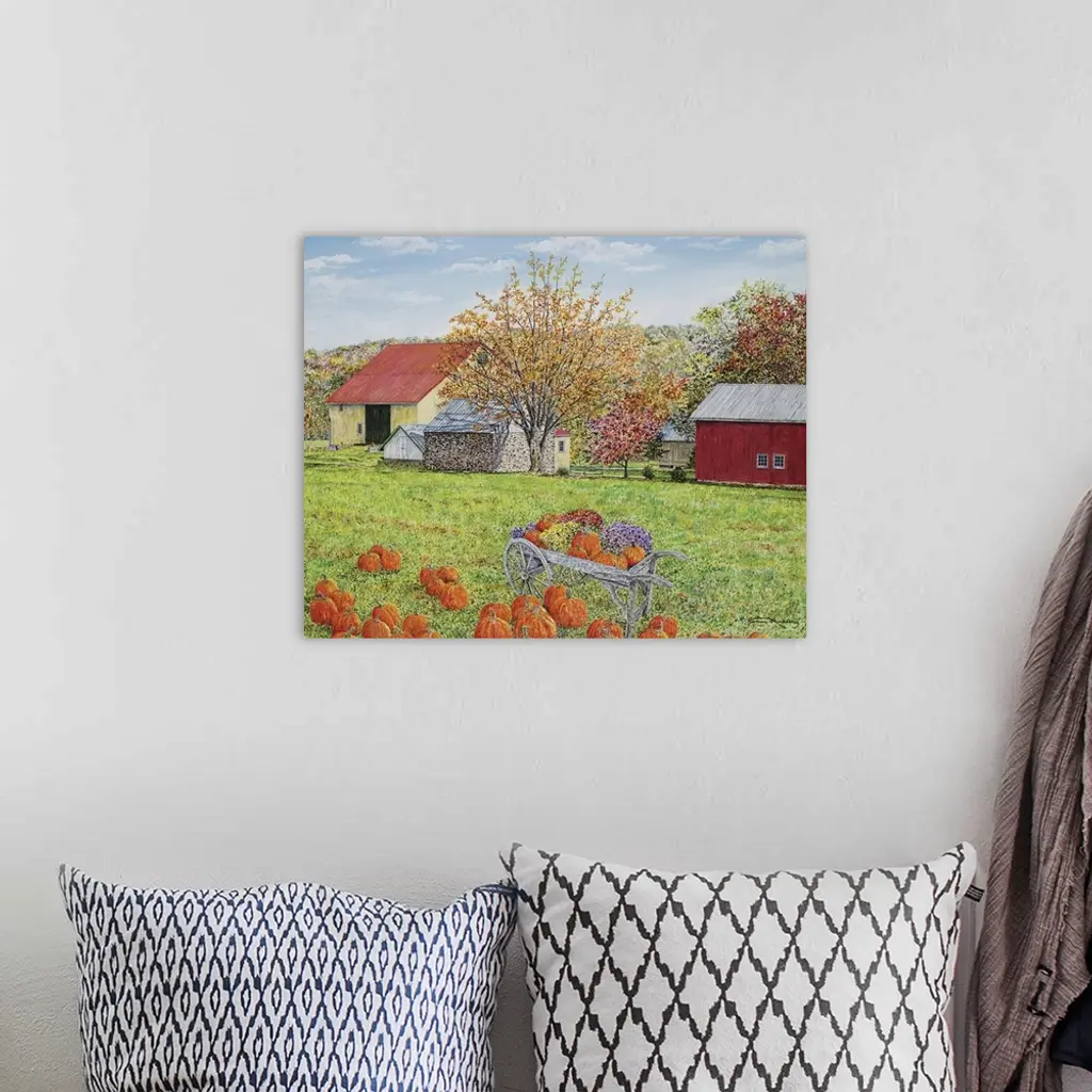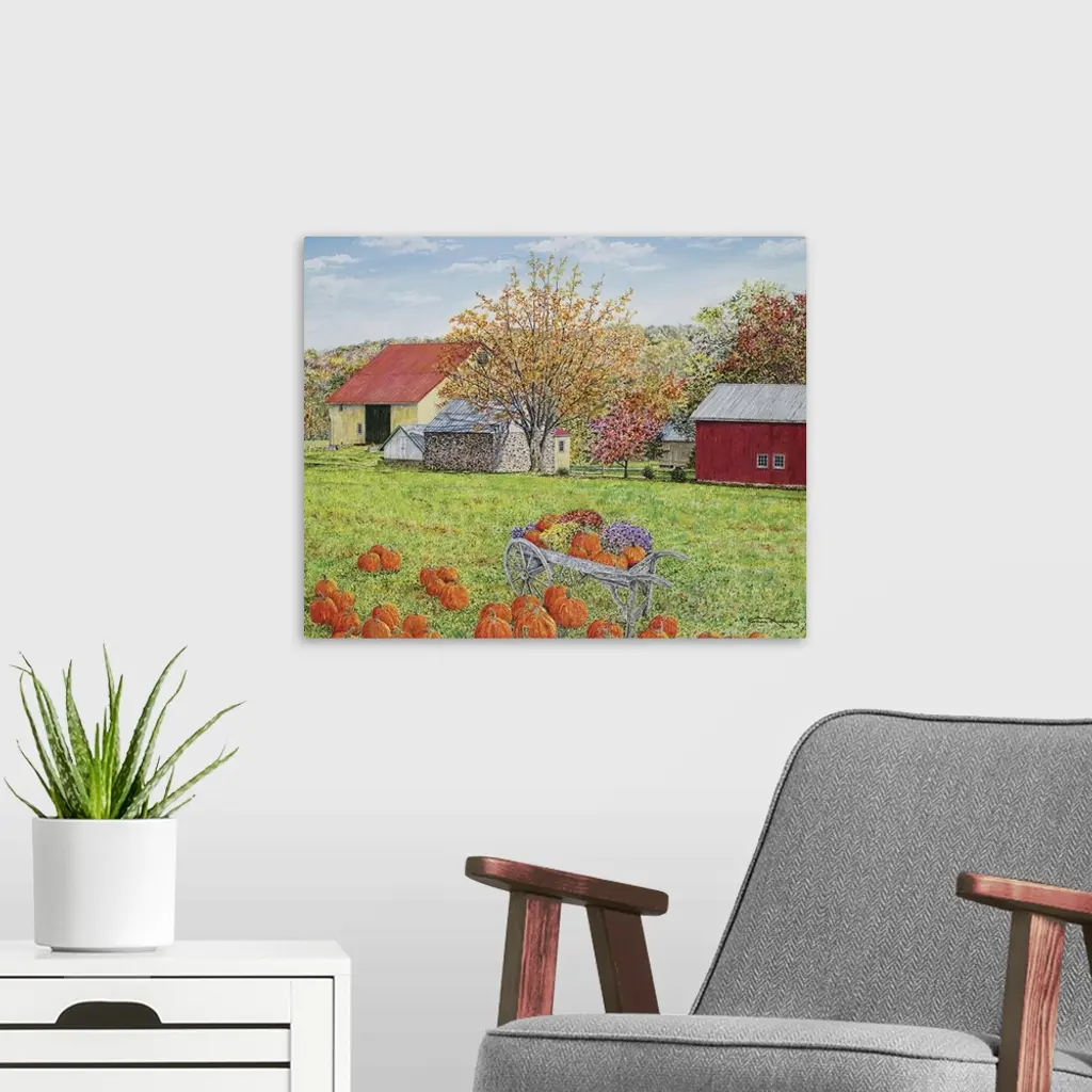 A contemporary landscape painting of a farm in autumn with pumpkins and a red barn.