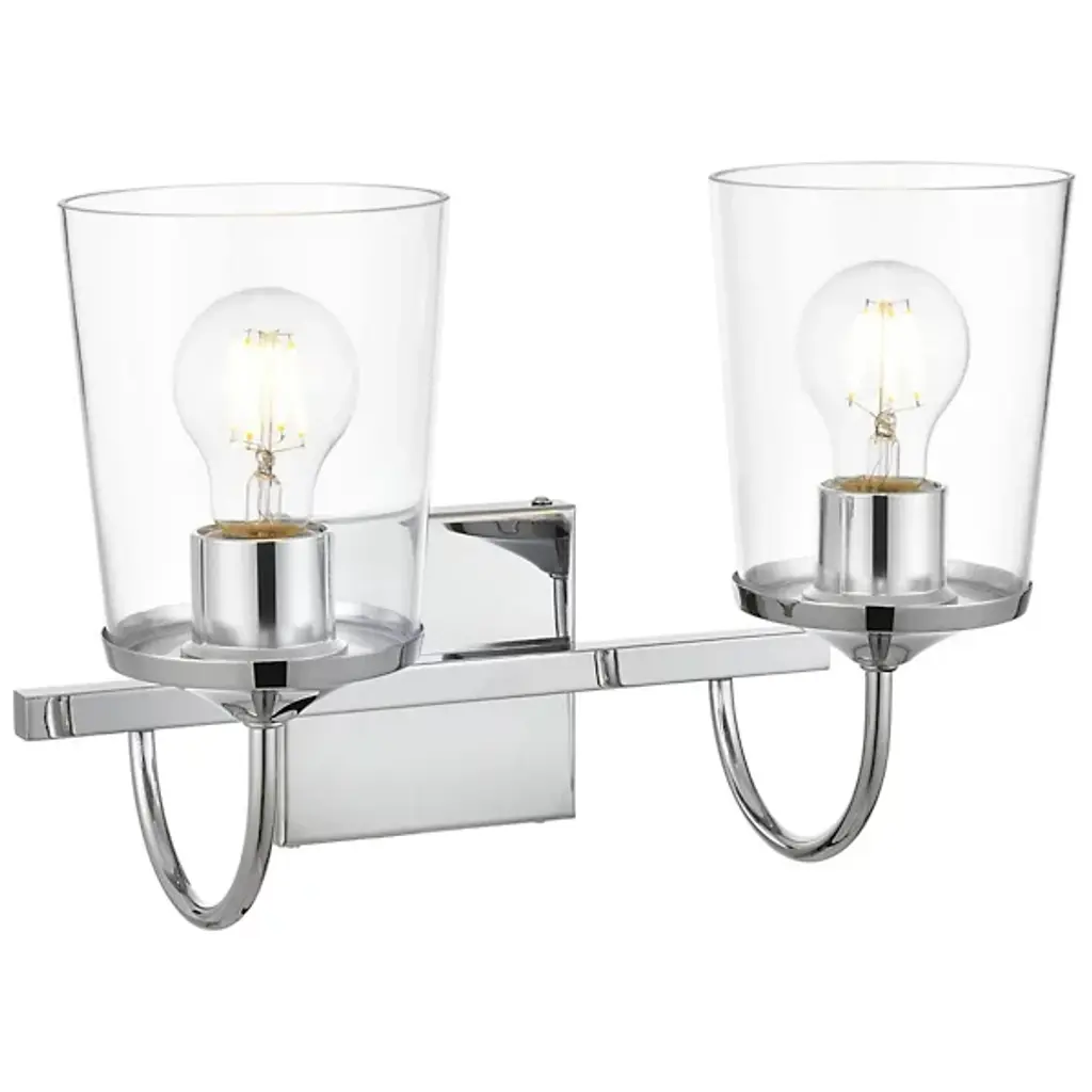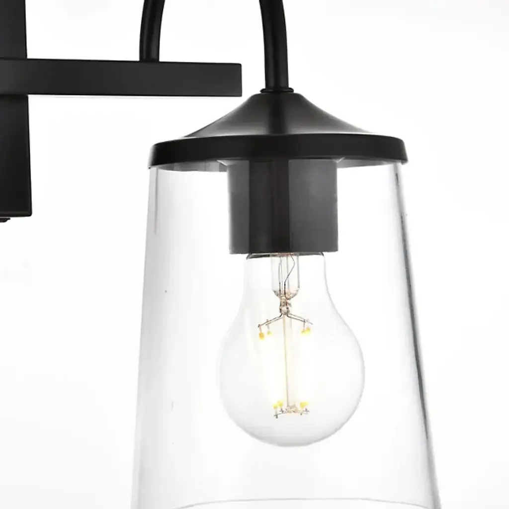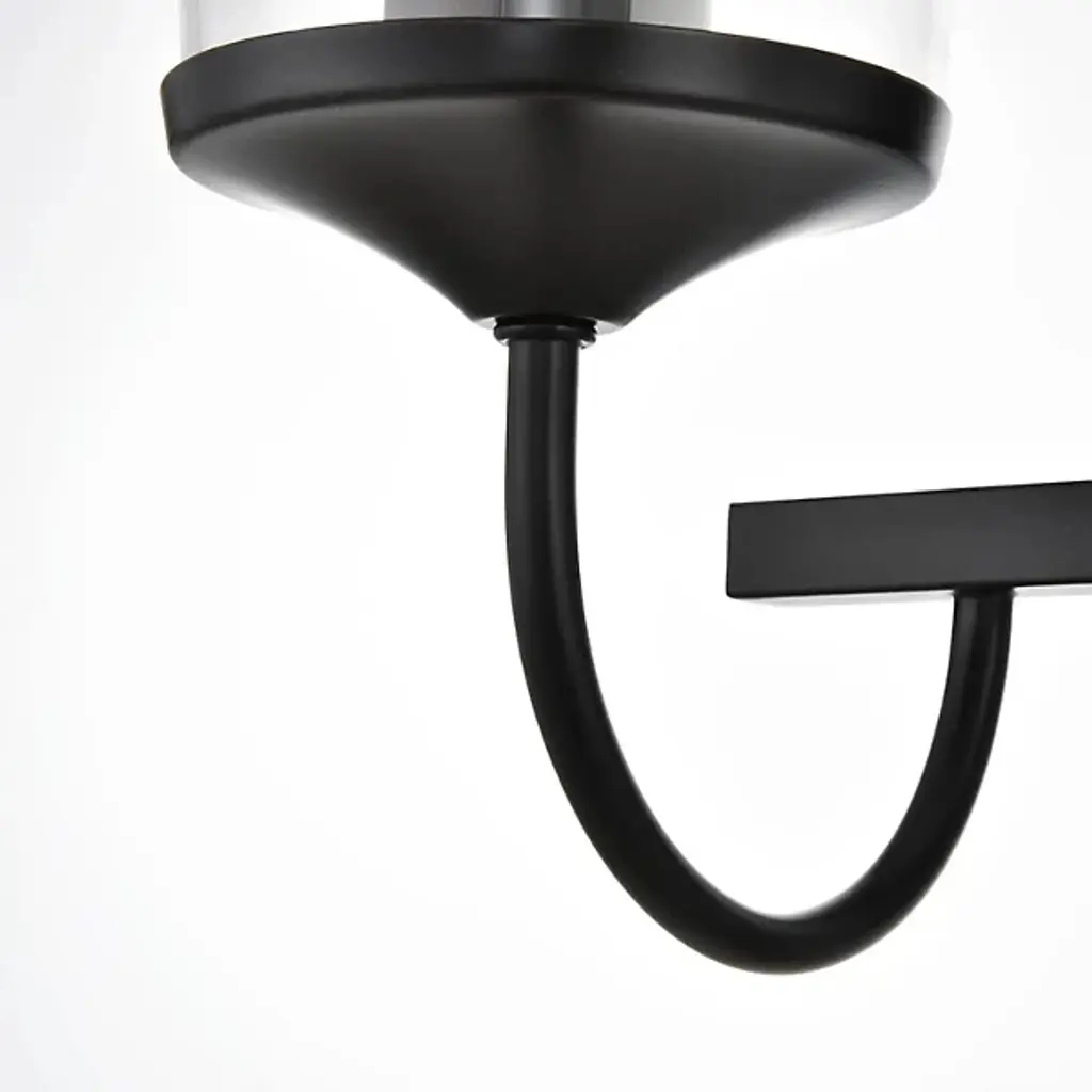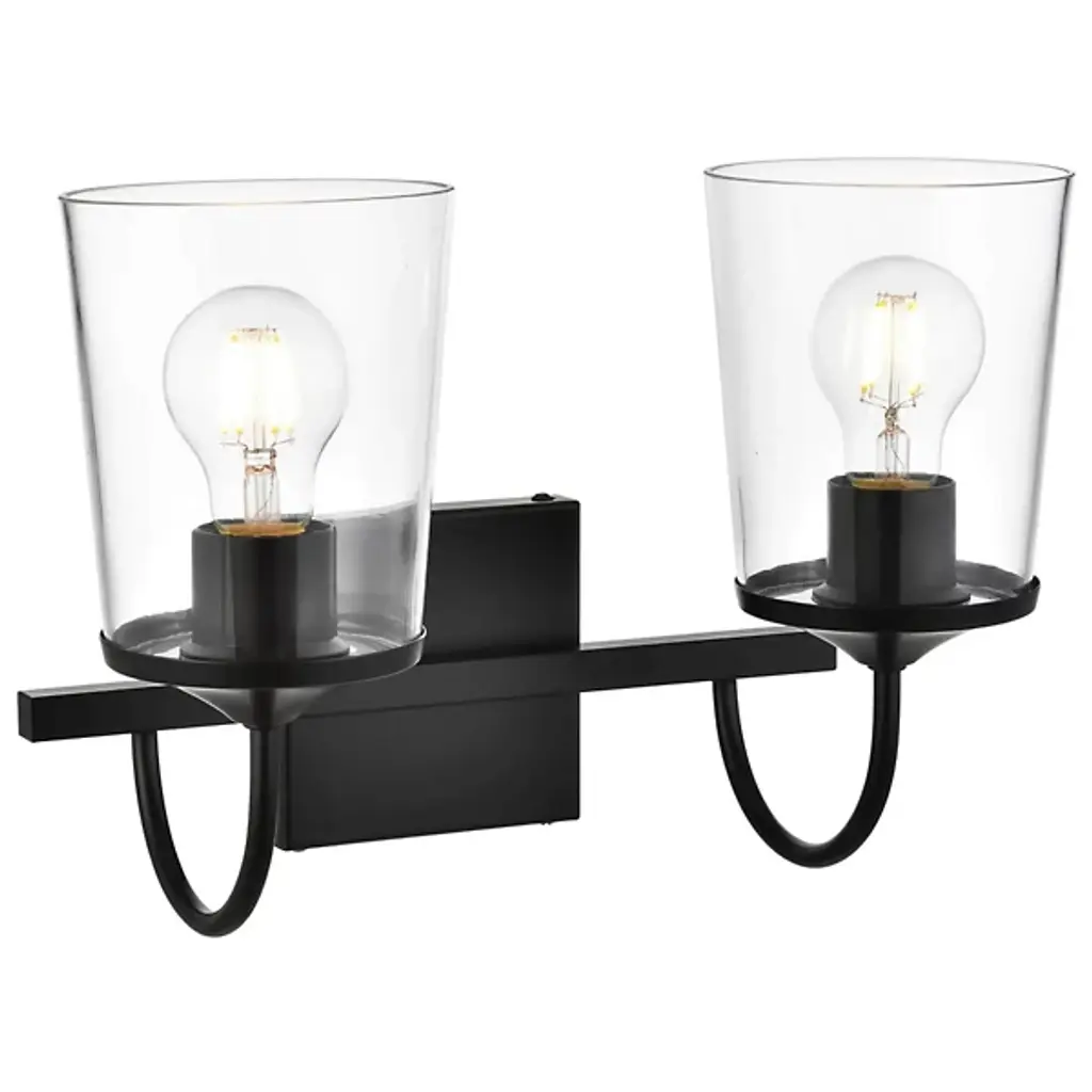 The Avani Vanity Light from Elegant Lighting features two clear bell glass shades that seem to hover naturally on curved metal arms. The transparent enclosures allow the bulbs to take center stage. A sleek horizontal bar connects the two light sources, anchored by a central backplate that adds visual weight and balance to the composition. Crafted from durable iron and glass, this luminaire can be installed as an uplight for a soft glow or flipped for more focused task lighting.