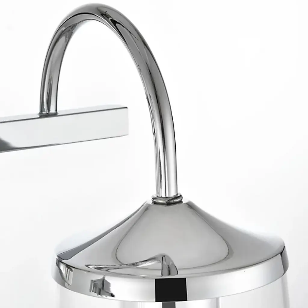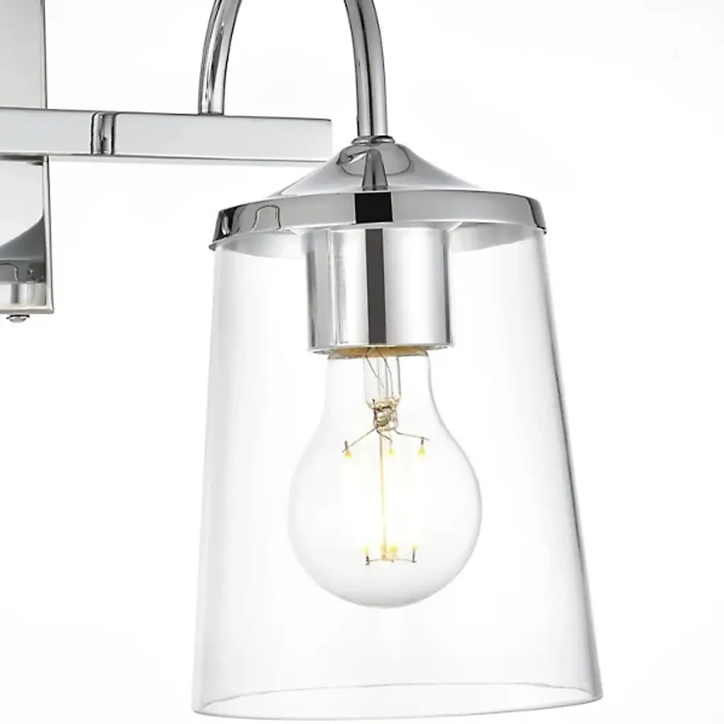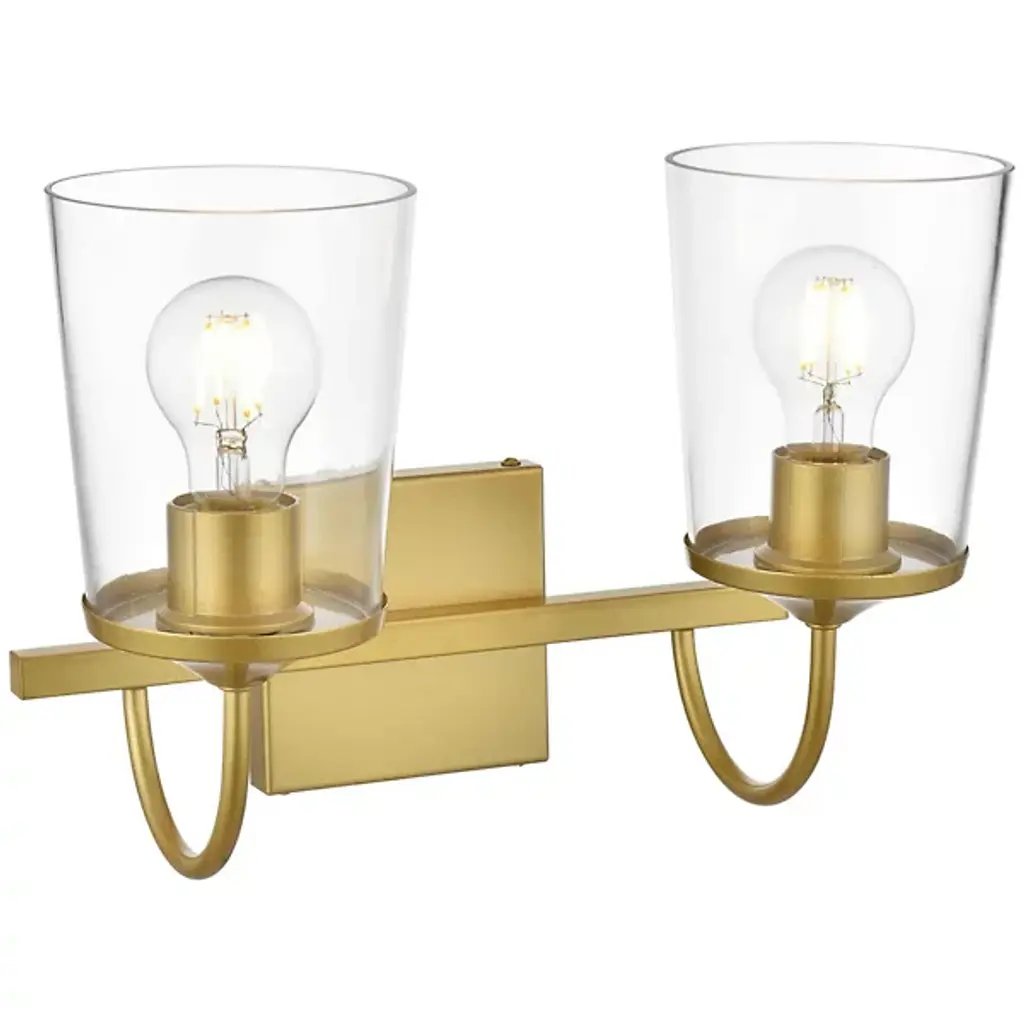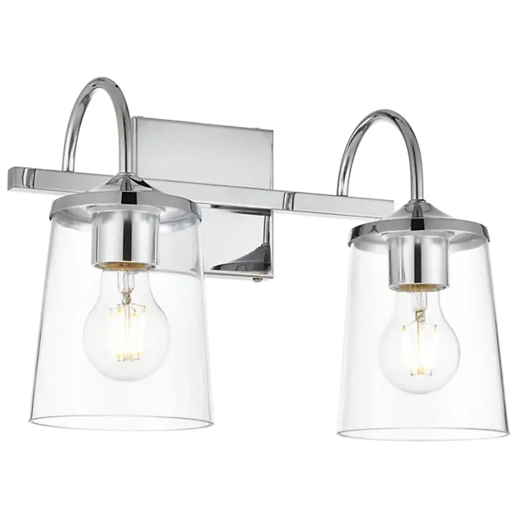 The Avani Vanity Light from Elegant Lighting features two clear bell glass shades that seem to hover naturally on curved metal arms. The transparent enclosures allow the bulbs to take center stage. A sleek horizontal bar connects the two light sources, anchored by a central backplate that adds visual weight and balance to the composition. Crafted from durable iron and glass, this luminaire can be installed as an uplight for a soft glow or flipped for more focused task lighting.