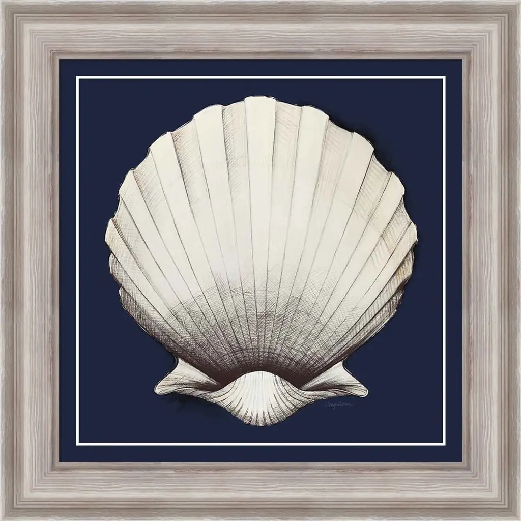 Coastal Shell II with Border Navy by Avery Tillmon is a high quality piece of framed artwork. The finished size of this piece is 20" X 20". It has a Weathered White Distressed frame and is finished with high quality Acrylic Plexiglass.. 100% Satisfaction Guaranteed.