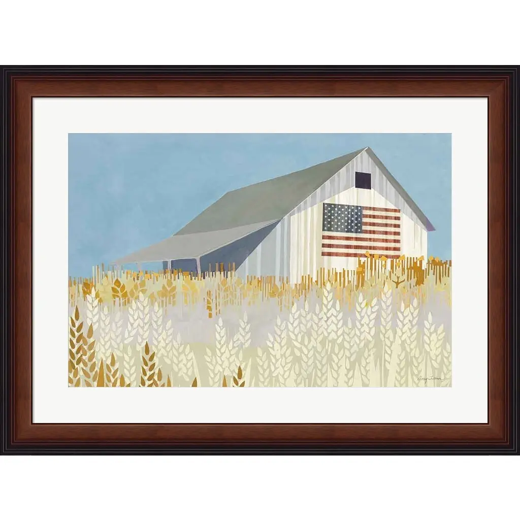 Wheat Fields Barn with Flag by Avery Tillmon is a high quality piece of framed artwork. The finished size of this piece is 32" x 24". It has a Brown Finish Stepped Front frame, White mat and is finished with high quality Acrylic Plexiglass. 100% Satisfaction Guaranteed.