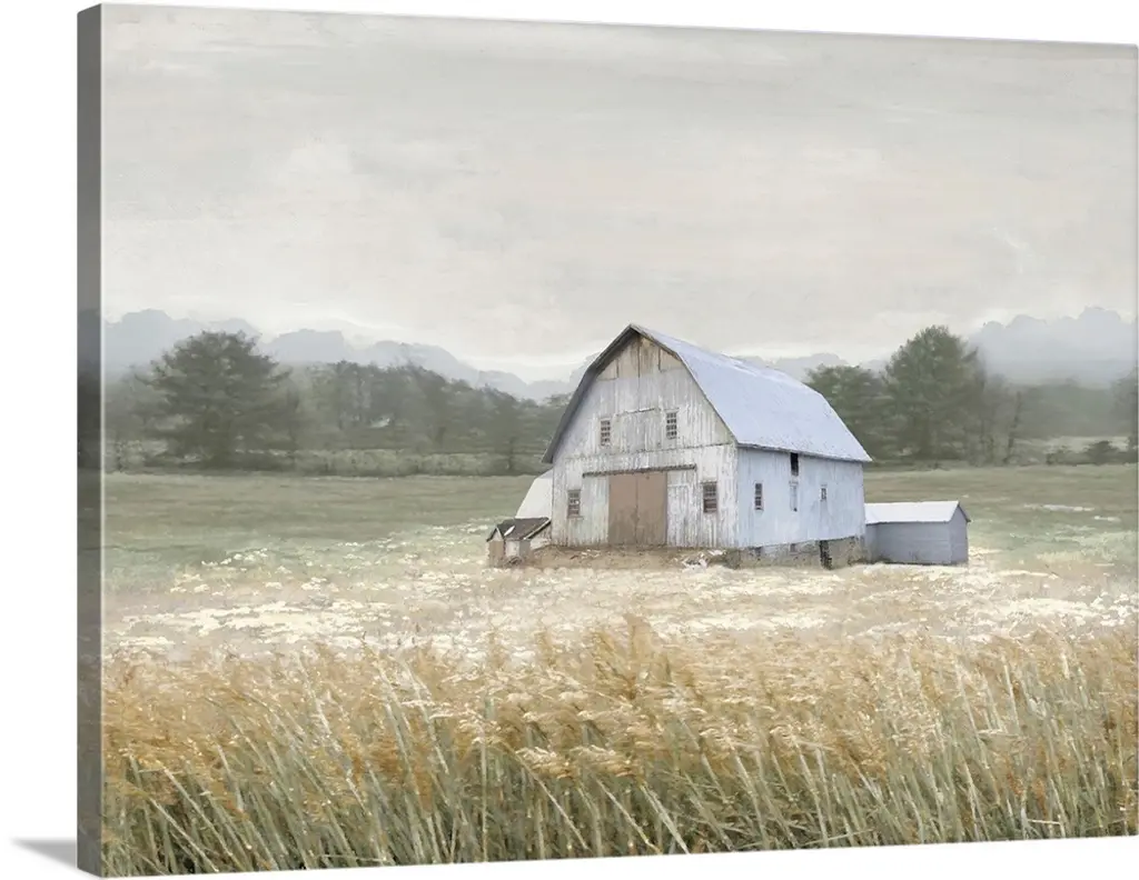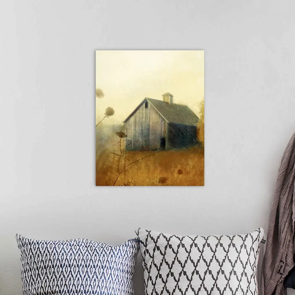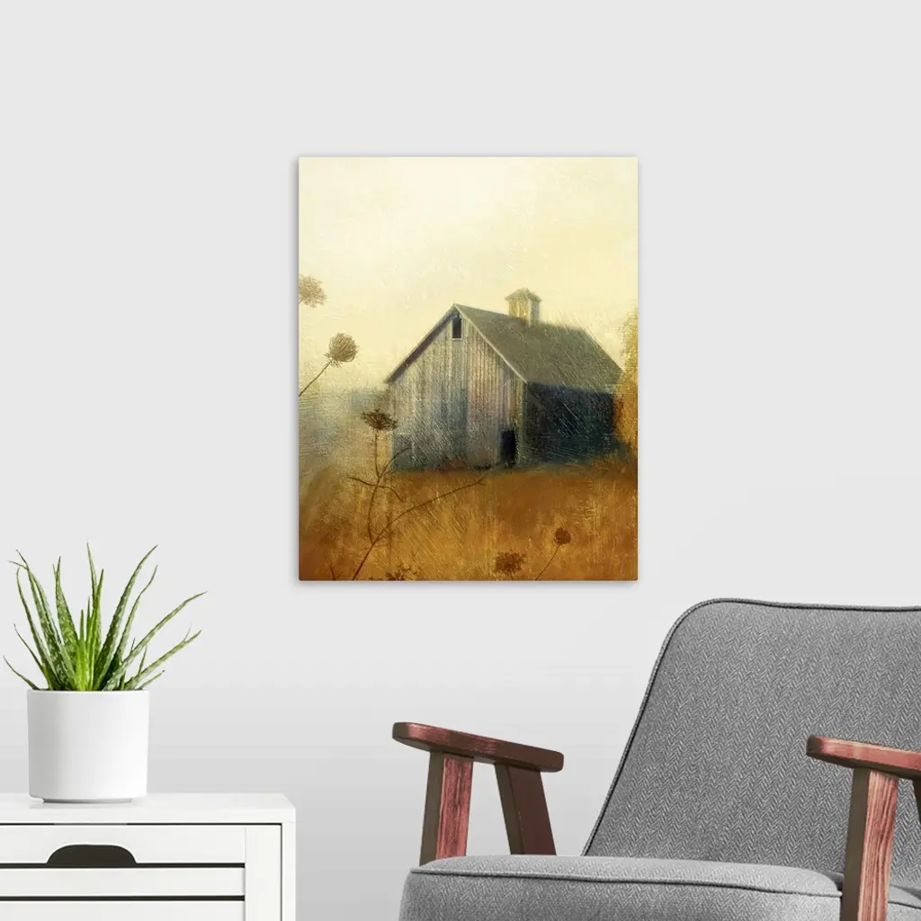 Thick bristle painting of a wooden barn sitting in the middle of a field.