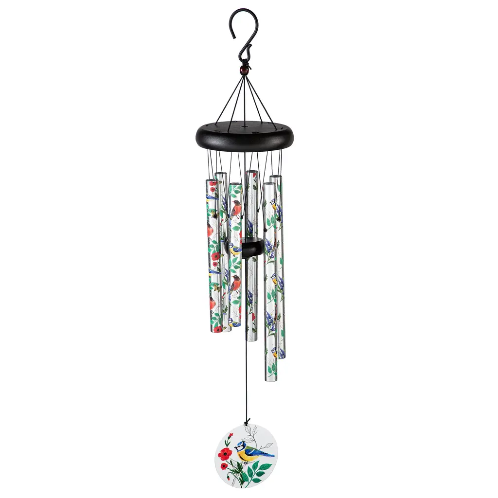 Enjoy the relaxing sounds of chimes as a gentle breeze passes through this Wind Chime. This hand-tuned wind chime is a great way to add a serene finish and soothing sounds to any outdoor space. It features sweet, feathered friends perched on branches. Easily hang this artful decoration in the garden or on the patio or porch. Made with a sturdy, aluminum construction with an industrial cord to withstand the elements and bring joy for seasons to come. It has six UV printed aluminum tubes with a wooden striker. For the longest life, we recommend bringing it indoors during harsh or extreme conditions. It’s tuned to the Scale of E and the notes include E, F#, G#, B, C#, E. UV printed tubes will need cleaning with mild soap and water. Use a damp cloth to wipe down the wind chime and protect it.