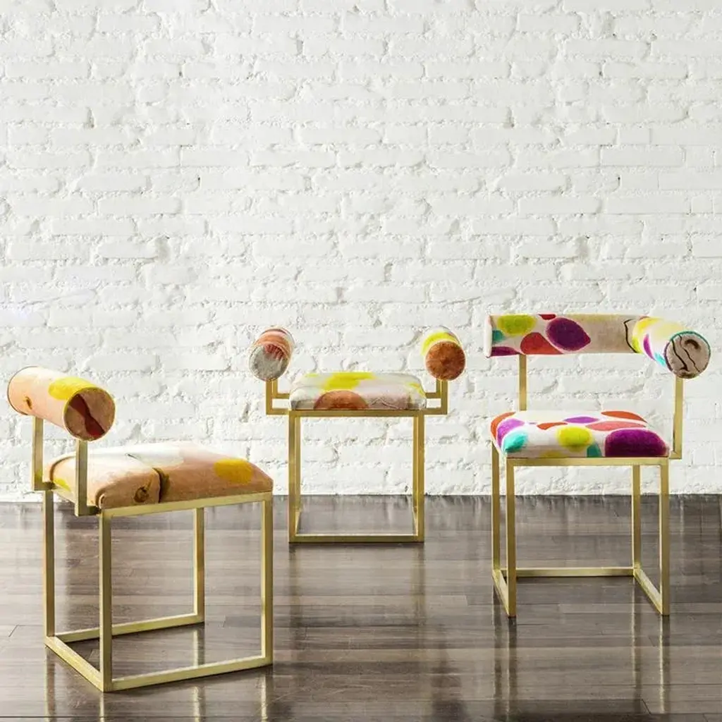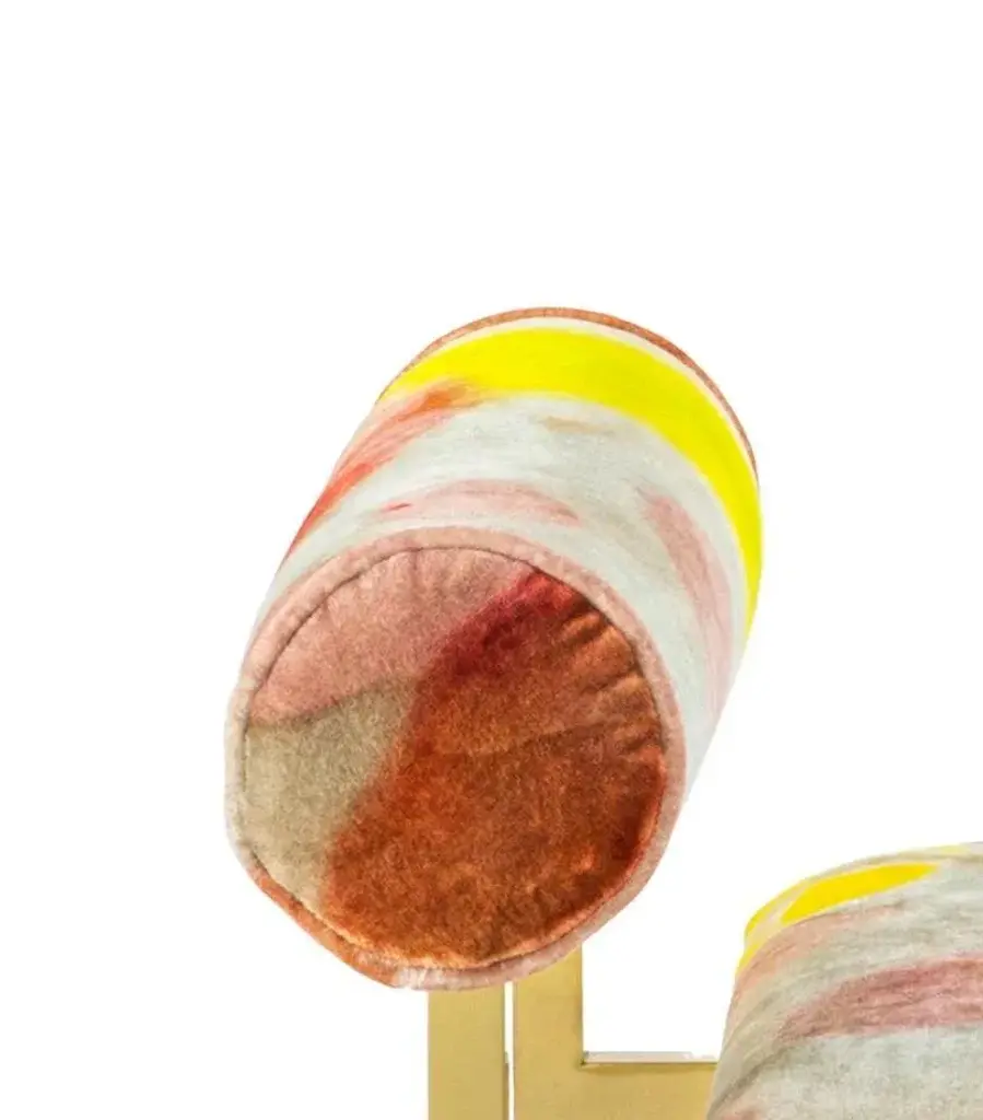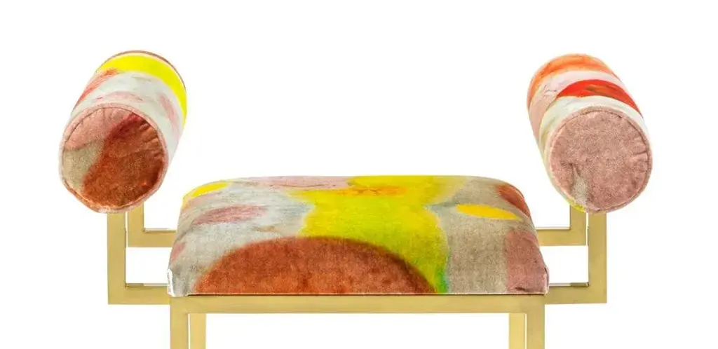 Original printed velvet awaiting h stool by secondome edizioni limited edition of 9 pieces + 3 a.p. Designer: coralla maiuri + giorgia zanellato. dimensions: d 40 x w 65 x h 60 cm. Materials: brass and original printed velvet. Collection / production: secondome. the project’s name speaks to the feeling of anticipation and excitement that precedes an encounter and it’s deeply linked to the purpose of the objects: benches, a vanity table and a room divider. The collaboration started as a game.