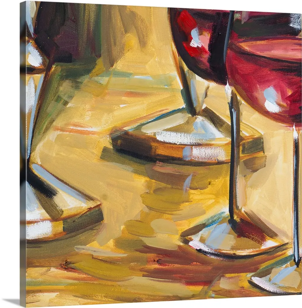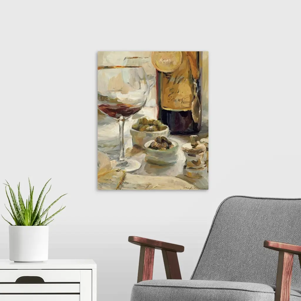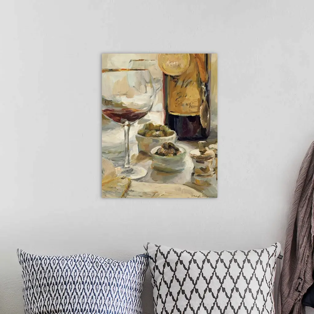 Painting depicting a nearly empty glass of wine and a wine bottle with award medals hanging around the bottle with another wine glass and assorted foods and a menu on the table.