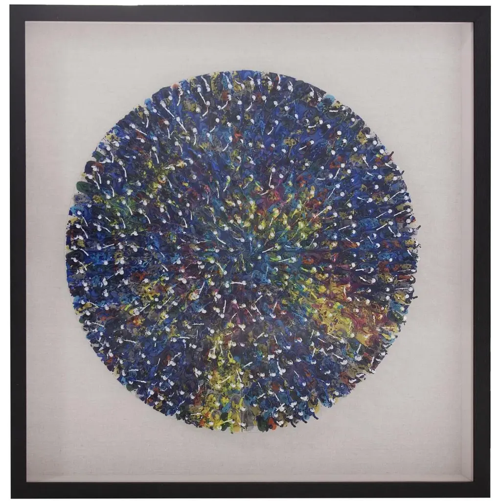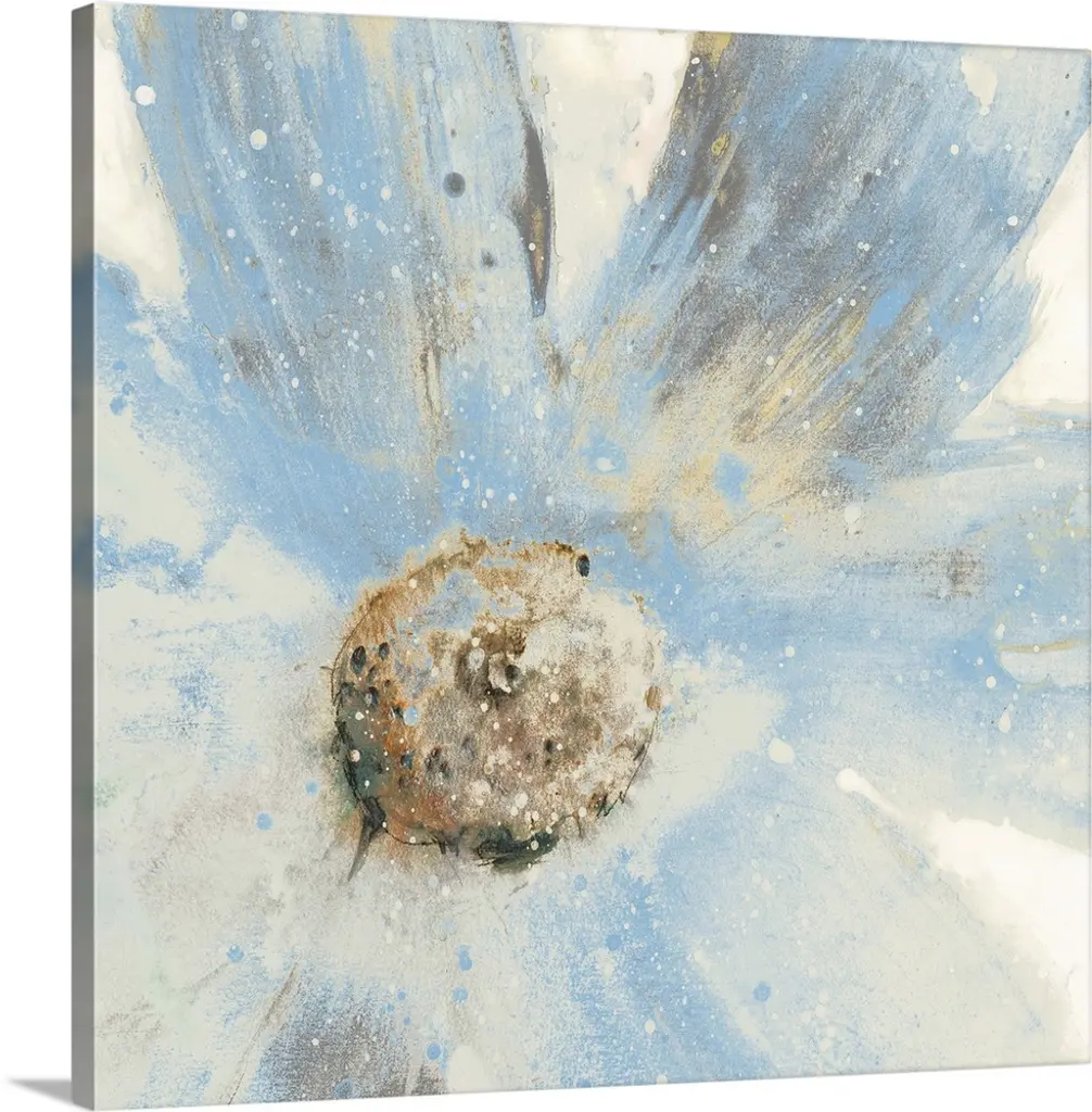 Surging Winter by artist Awu is a stunning painted work on canvas, delivering crisp winter tones to an interior space. The piece showcases a field of white, surrounded by explosive splashes of blue and black around the edges. Heavy texturing across the canvas evokes striking visual depth. The artwork is shown from an acrylic box frame, and may only be displayed in a vertical orientation.