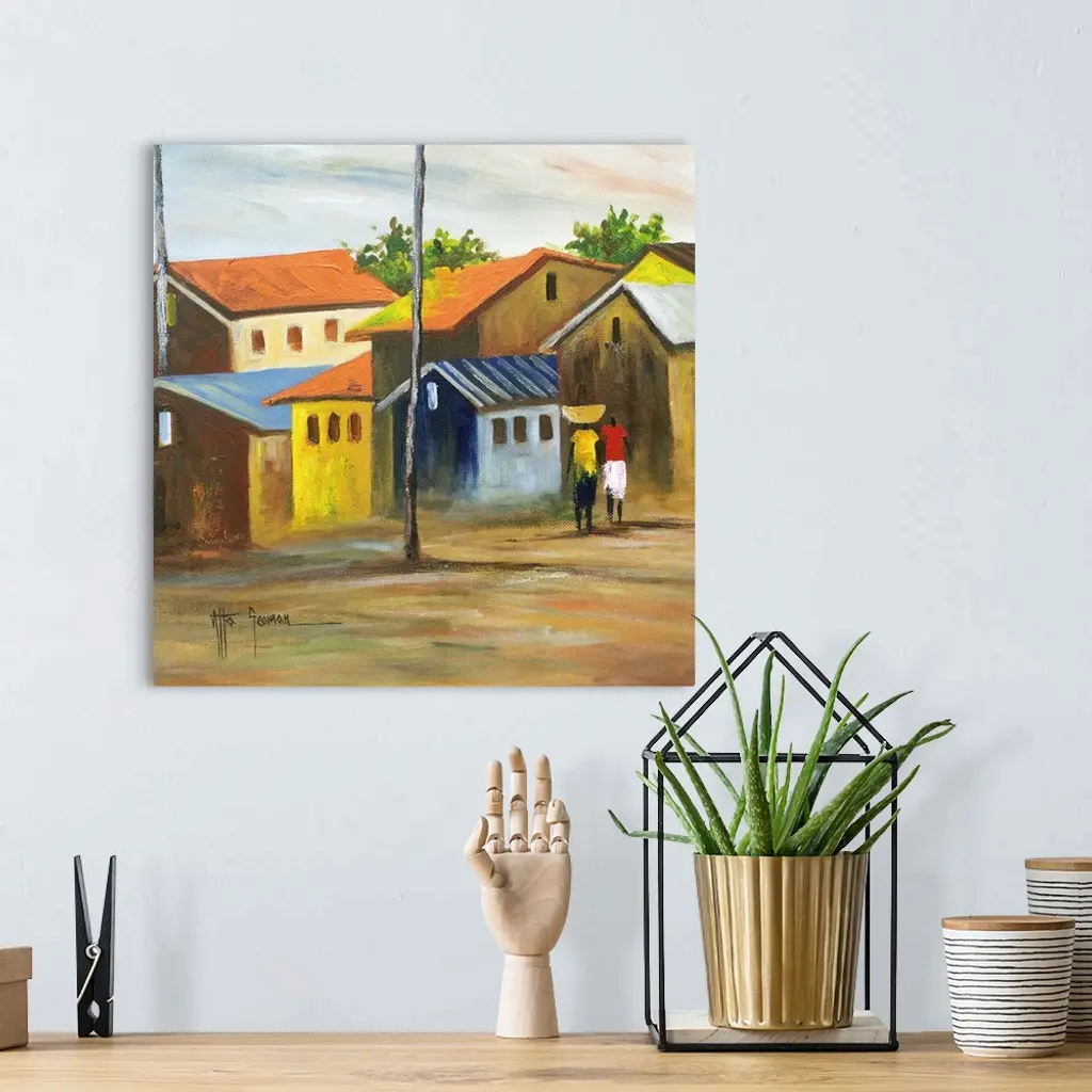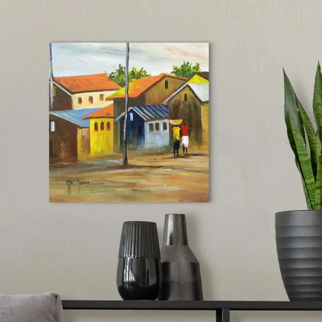 Women walk down the streets of Axim, together planning the meal they will serve their families. Axim, referring to a town, district and a kingdom, is ruled by two omanhenes (chiefs), a foreign-born king, and the political District Chief Executive of Nzema East, of Akan background. Painting with acrylics, Godwin Atta Geoman captures the calm rhythm of life of this once busy port.