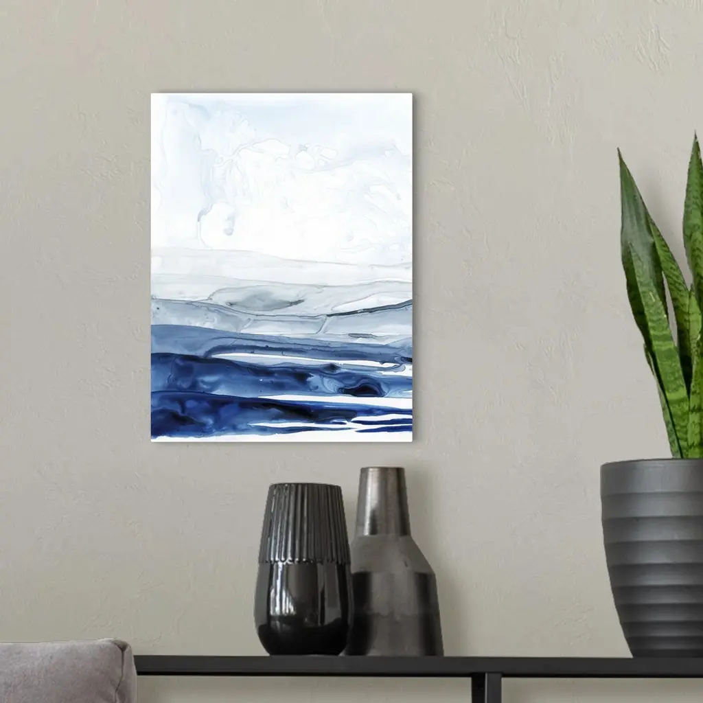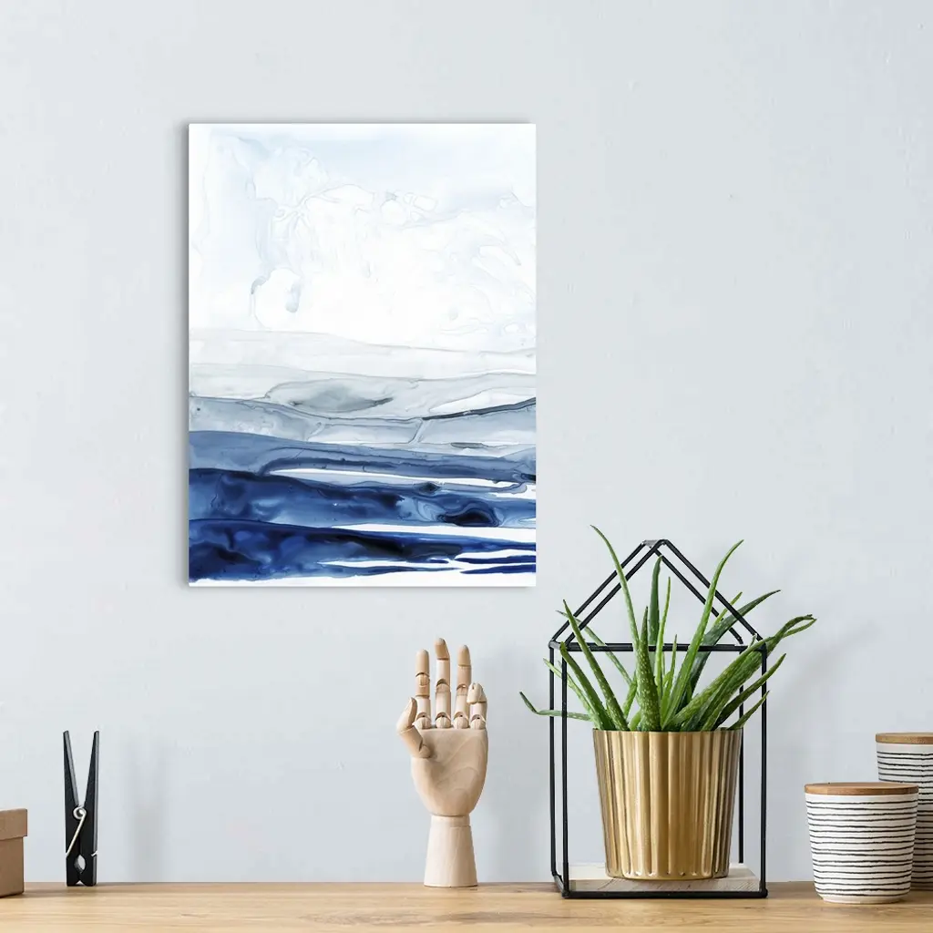 Abstract contemporary painting resembling a deep blue ocean under a pale white sky.