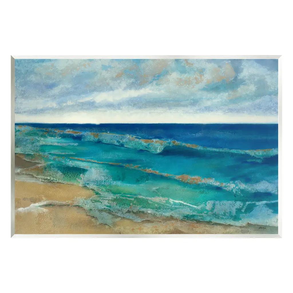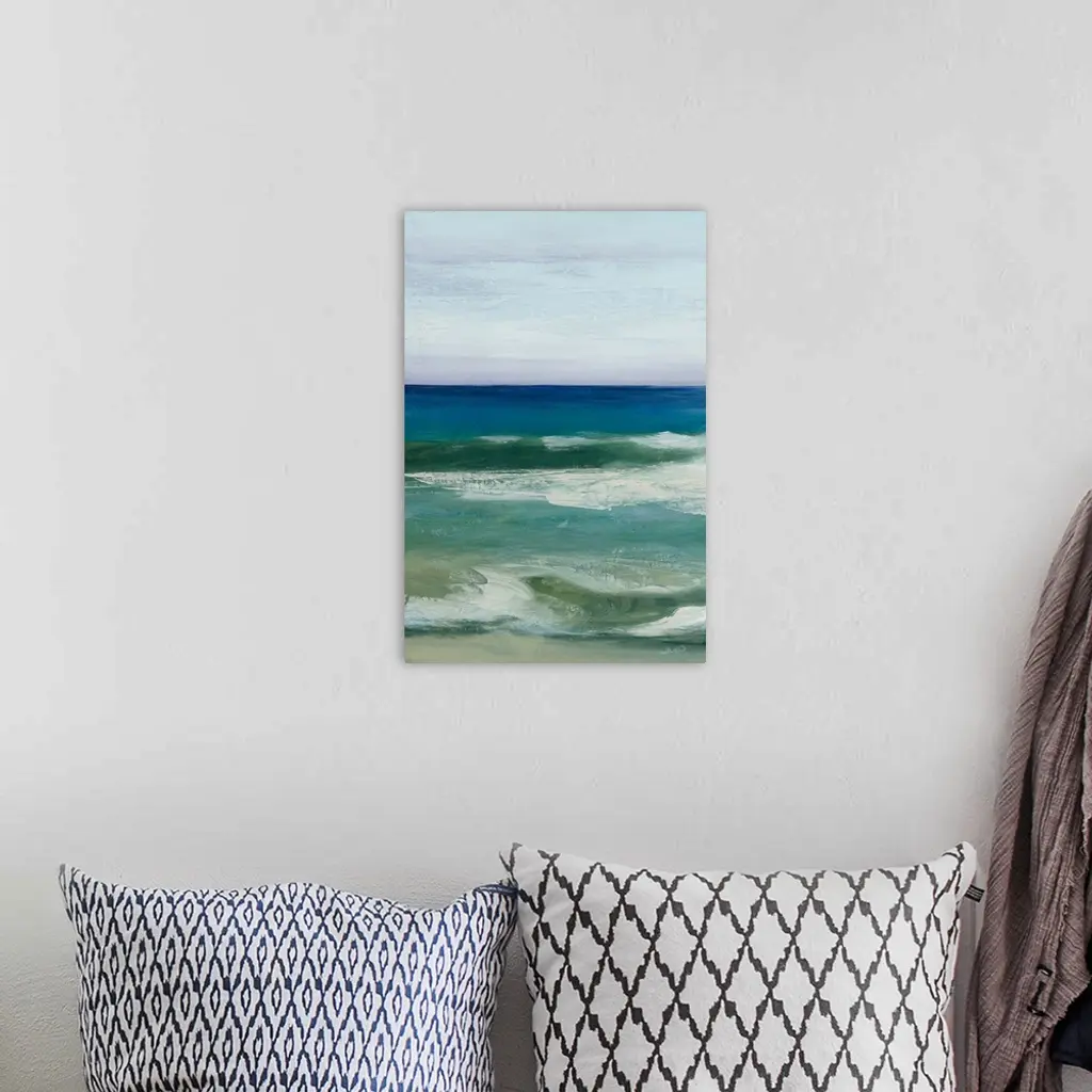 Contemporary artwork of textured brush strokes that carve out a serene ocean scene.