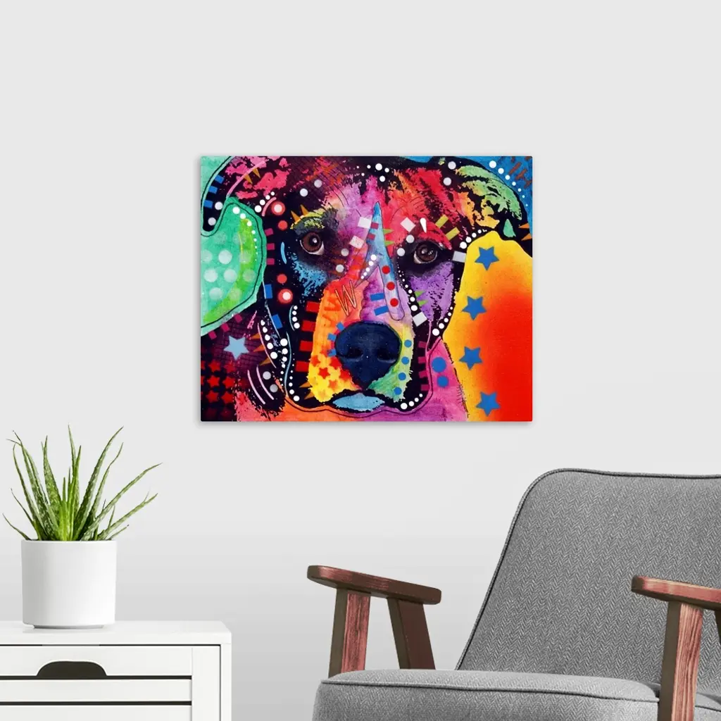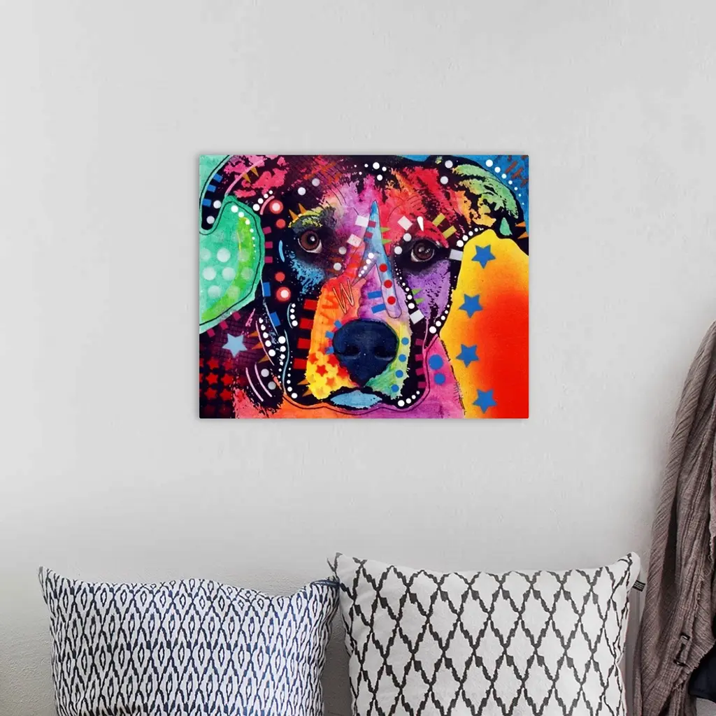 Contemporary stencil painting of a dog filled with various colors and patterns.
