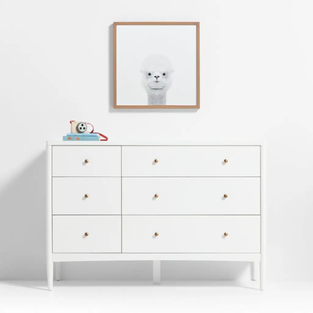 Up close and personal, our adorable photo portraits show off the undeniable "awww" factor of baby animals. Snapped against a white background, a young alpaca looks right into the camera to show off its snowy white fur and irresistibly cute facial features. This giclee print of the original photo by Monika Strigel is framed in walnut wood for a graphic and contemporary look. Hang our winsome cria wall art alone or as part of a gallery group for an enchanting menagerie.