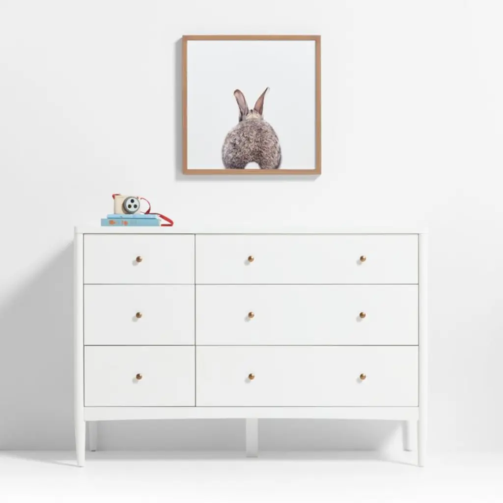 Up close and personal, our adorable photo portraits show off the undeniable "awww" factor of baby animals. Snapped against a white background, a young rabbit presents his back side to show off its brown fur and adorable cotton-ball tail. This giclee print of the original Gal Design photo is framed in walnut wood for a graphic and contemporary look. Do a fore-and-aft arrangement with the coordinating baby bunny front view or create a gallery group for an enchanting menagerie.