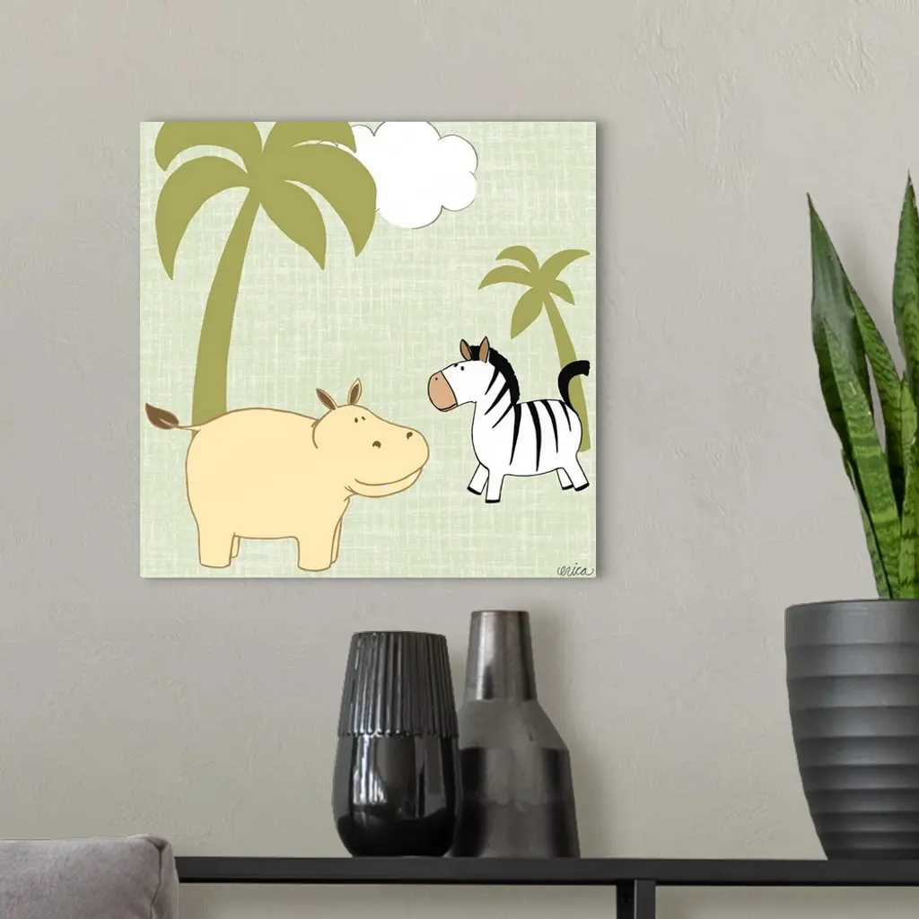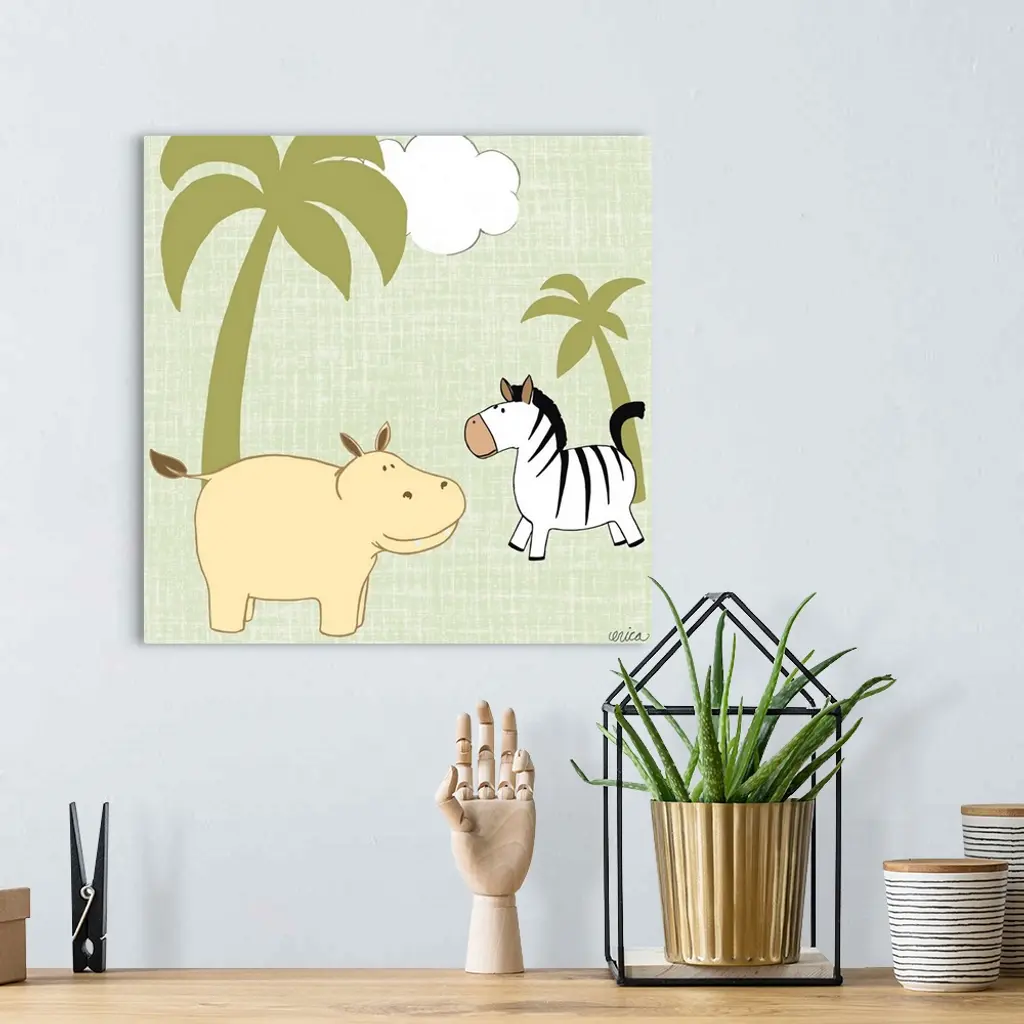 Cute children's room artwork of friendly jungle animals in yellow and green.