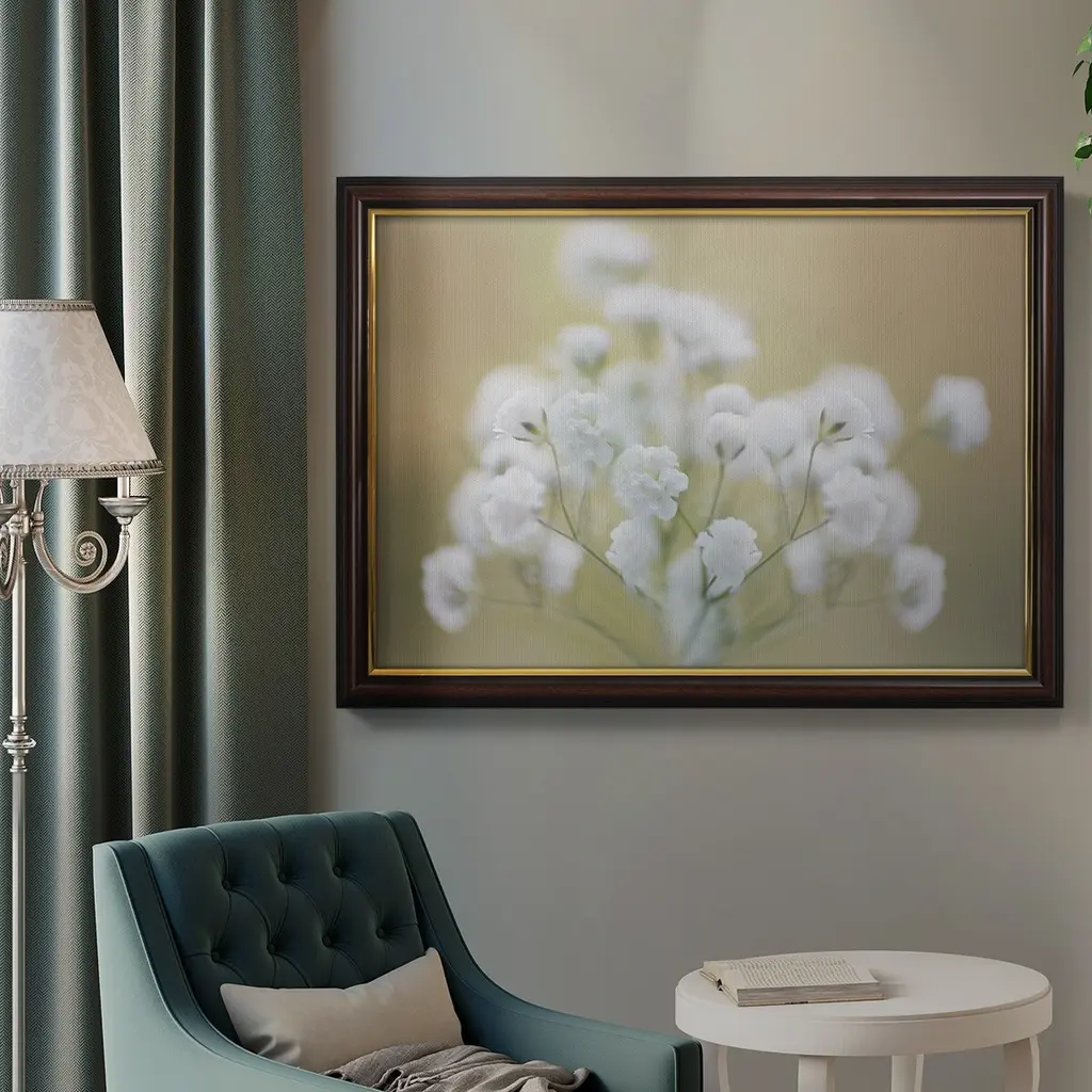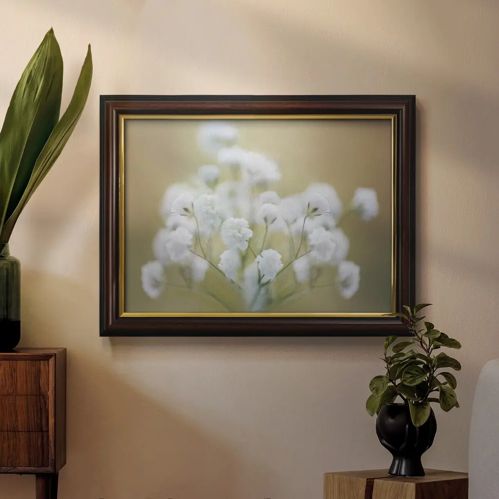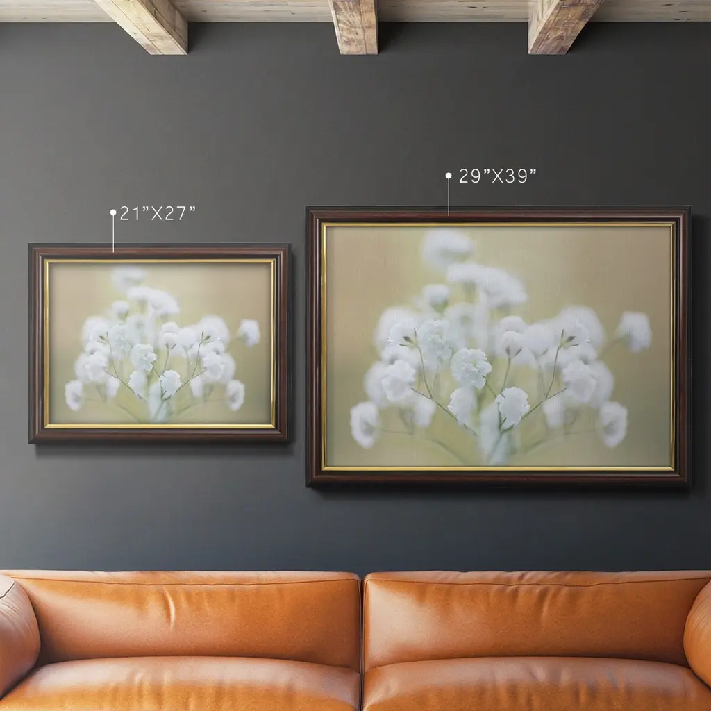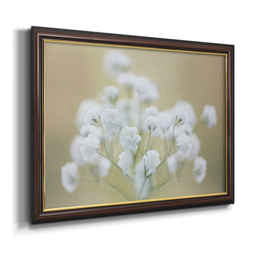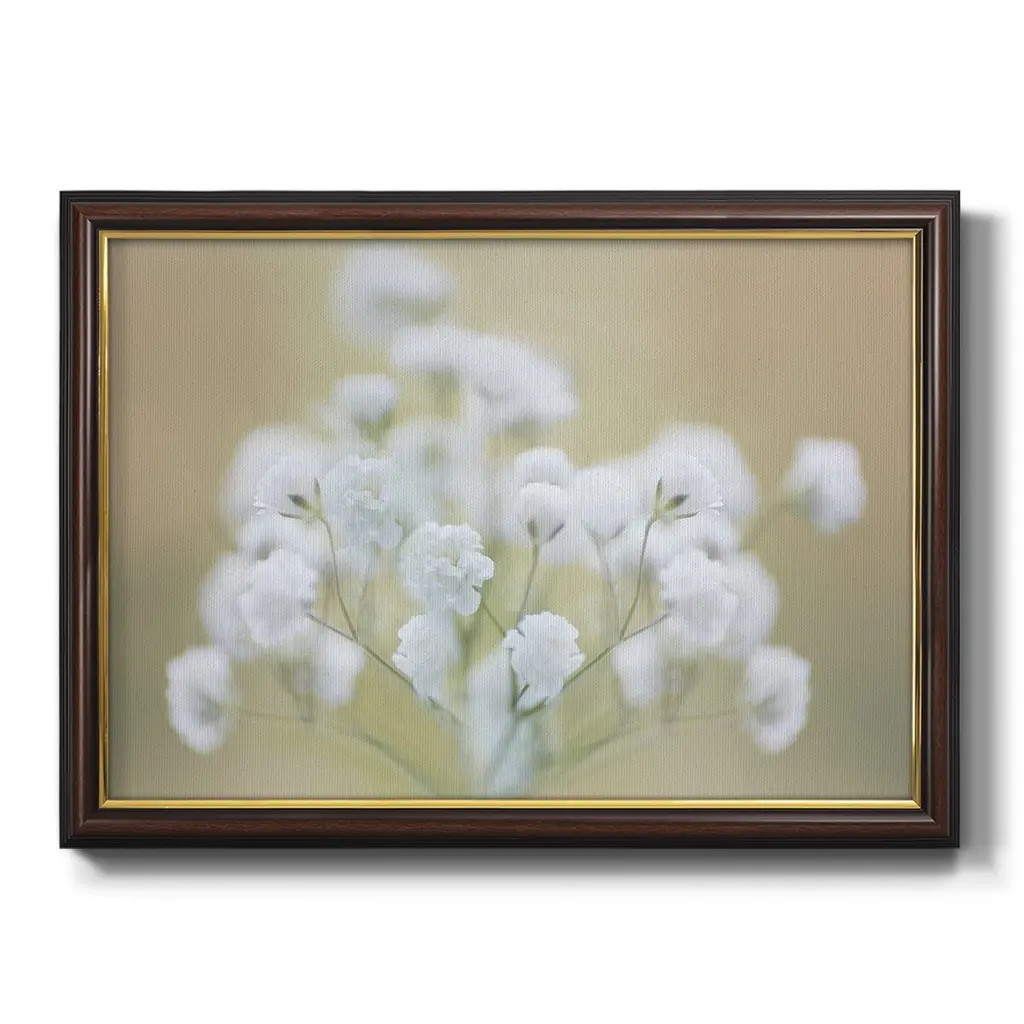 Baby's Breath Study I Premium Framed Canvas- Ready to Hang A Premium Framed Canvas created to last. Framed in distressed wood and available in an array of sizes and colors Featuring a beveled a solid wood stretcher bar, each piece comes ready to hand 3 SIZES AVAILABLE 16''X20'' - Overall Size 18'X27'' - Overall Size 24''x36'' - Overall Size Each piece is made to order. Each piece comes with hanging hardware. Made in the USA Ready to Hang Giclee Paper Print Acrylic Glass Beveled Matt Board