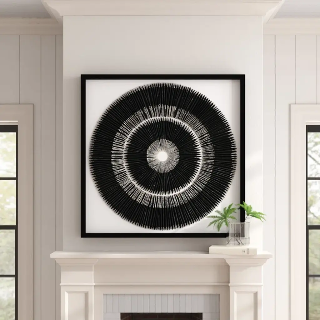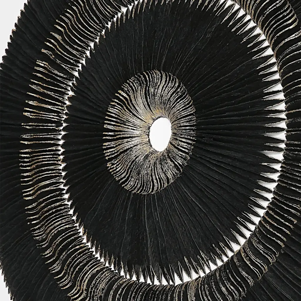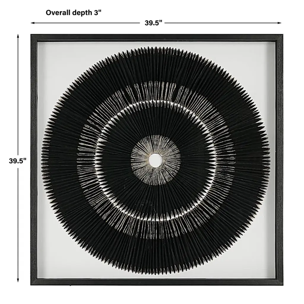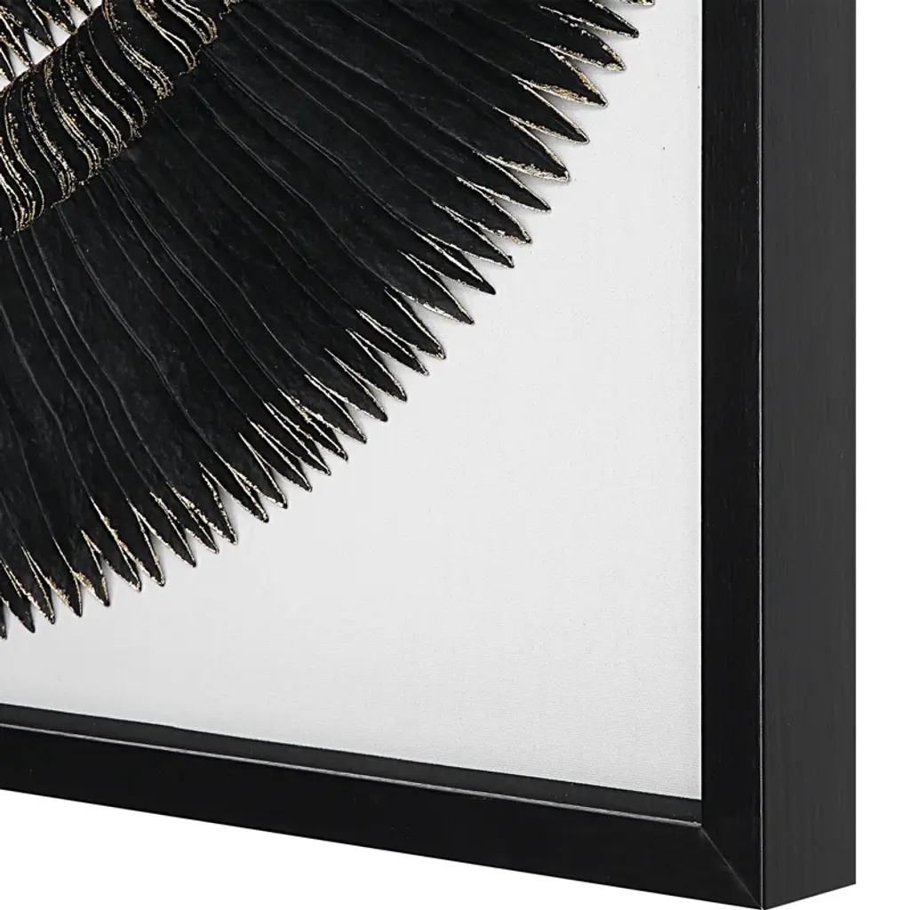 Handcrafted by skilled artisans, this wall decor features a striking leaf medallion. The artwork is set against a linen backing in a shadowbox-style pine wood frame under glass.