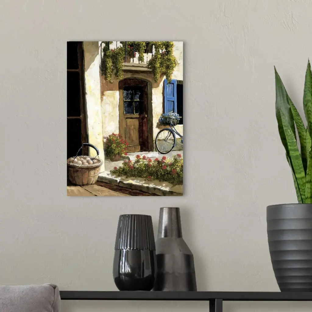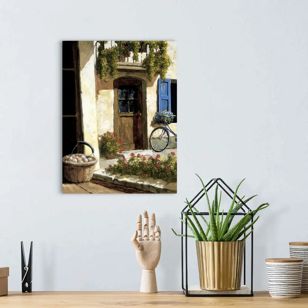 Painting of a bicycle near a door in a European village.
