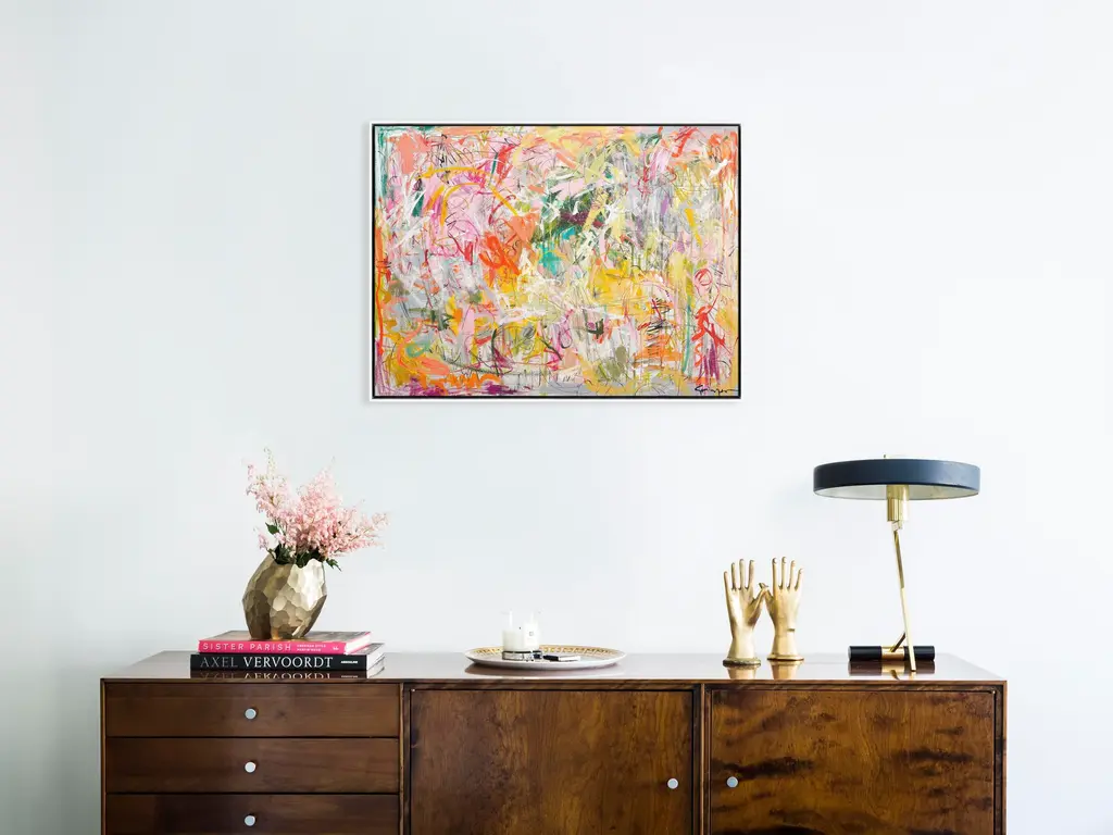 DESCRIPTION: Back to Life by Lesley Grainger in White Frame, XS SPECIFICATIONS: Type: Canvas Floater Framed. Framed Size (in): 36x27. Orientation: Horizontal. Flush/Float/Matted: Float. Frame Color: White. Hanging Hardware: Picture Perfect. FRAMING: Each art work arrives framed and ready to hang. We use handmade frames with a plexiglass glazing front, because it offers less glare than standard glass. At this time, we only offer framed prints. ARTIST BIO: Lesley Grainger was born in Yorkshire, England, where she grew up in a small Northern fishing town and currently resides in Orange County, California. She received a B.A. in Illustration and Design from the University of Lincoln. Early in her career, she worked as graphic designer and later began to produce children’s books and licensed artwork. For the last several years her main focus and passion has been abstract painting. She works intuitively and thoughtfully while discovering new and interesting colors and compositions. Painting is a reflection of experience and what Lesley has found is that each painting is translated to the next, like an ongoing story. Discovery is key in Lesley's expression, as she works with the canvas, adding and removing elements. This pushes her to new levels and brings a sense of how art can change the way we think, feel, and connect with the world.