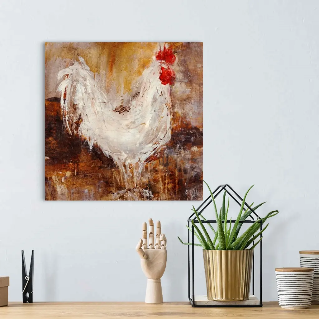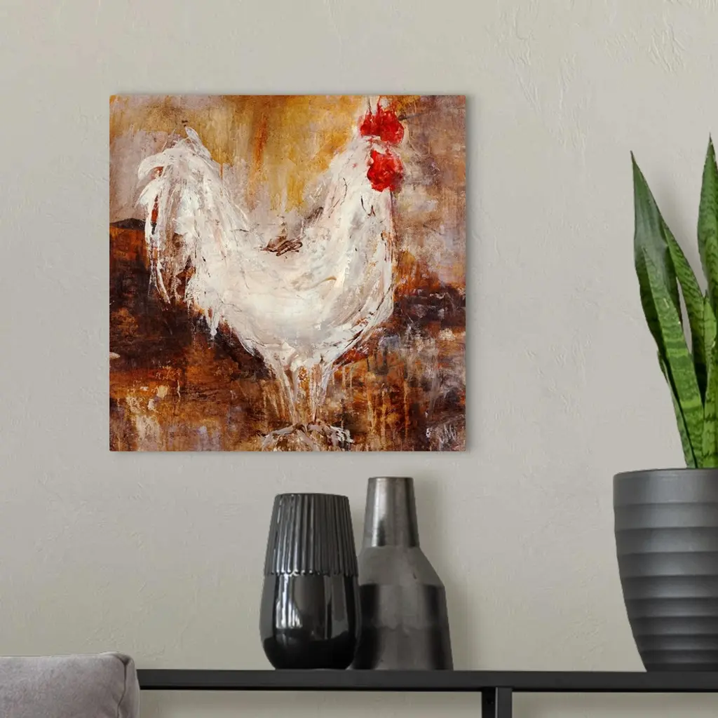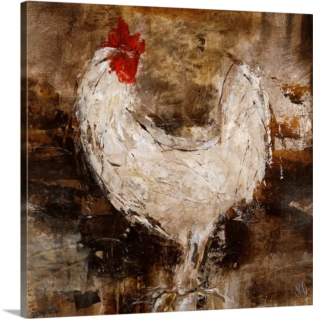 Contemporary painting of chicken up close against a dark background. The image is created using sloppy brush strokes with areas of dripping paint.