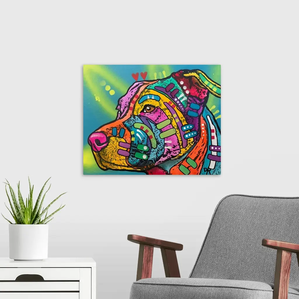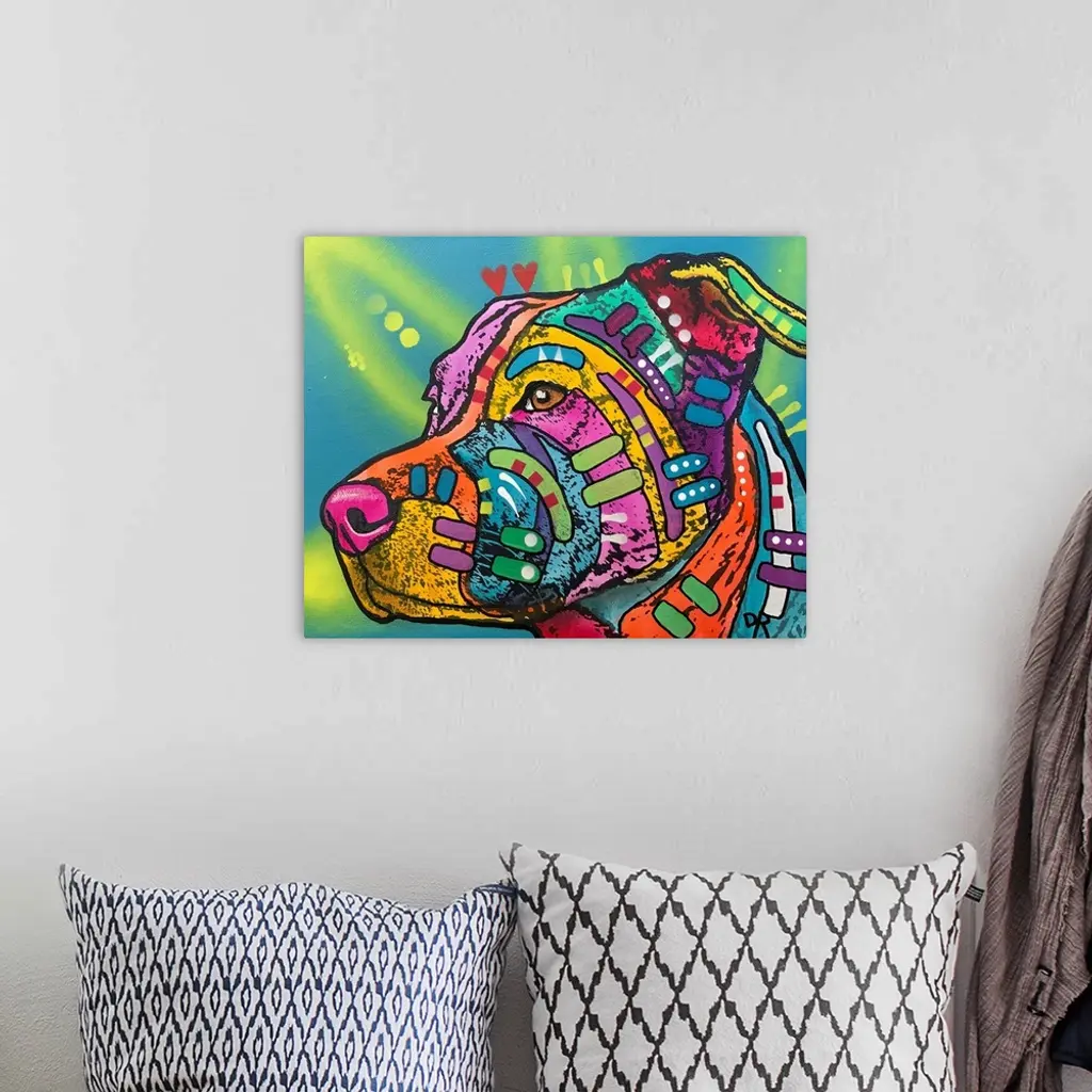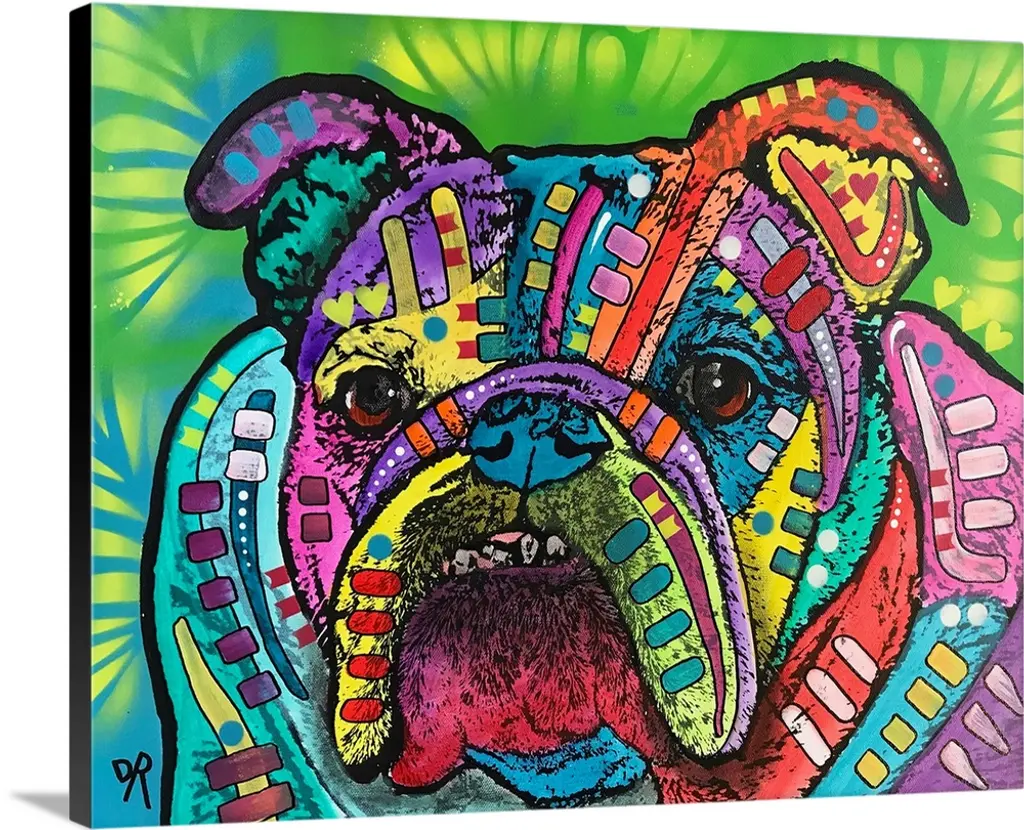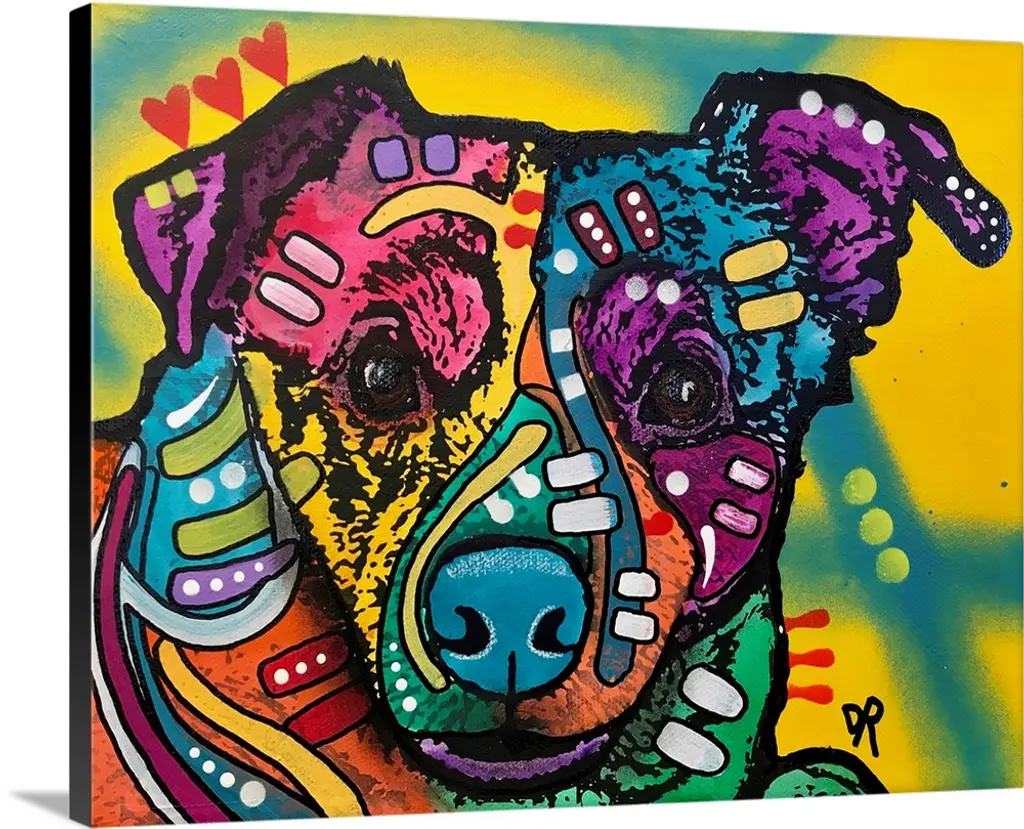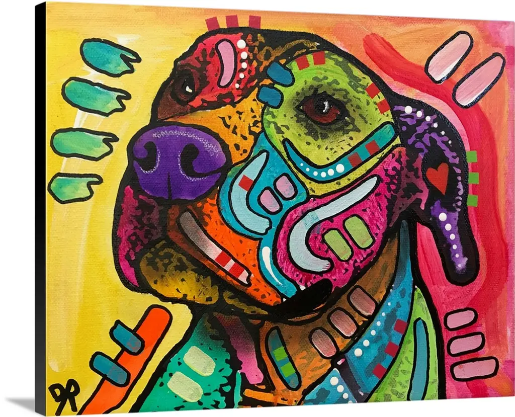 Contemporary stencil painting of a dog filled with various colors and patterns.