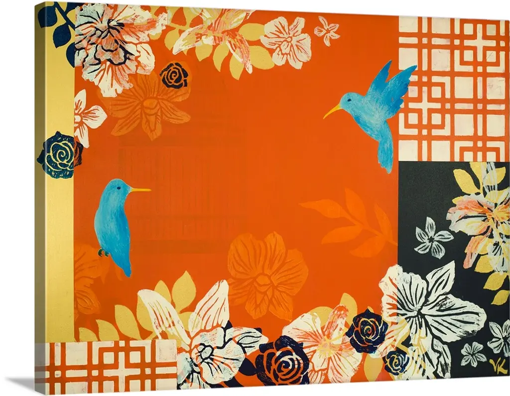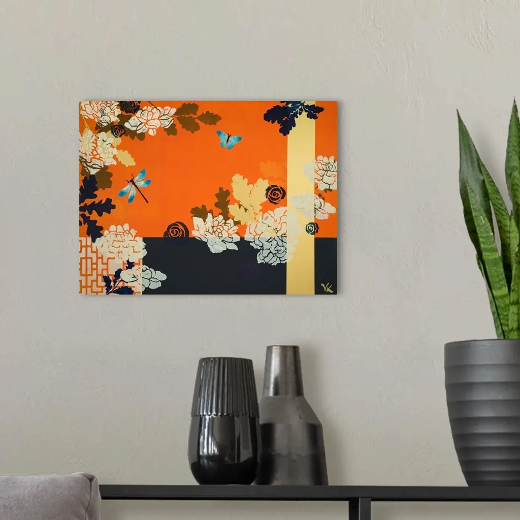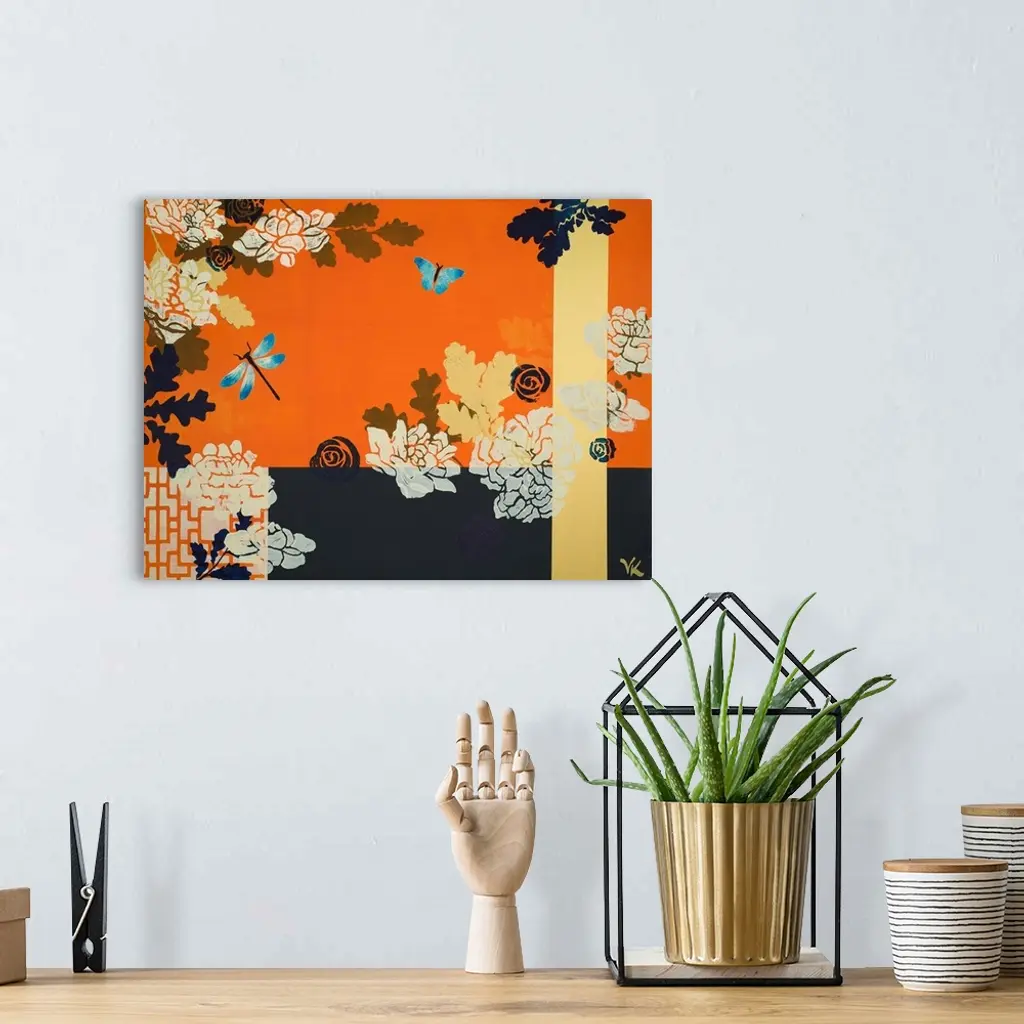 Painting of dragonfly and butterfly in peony garden with ivory and navy screen and tangerine background.