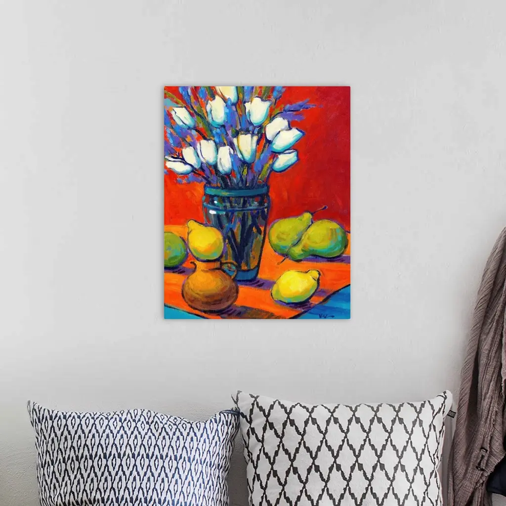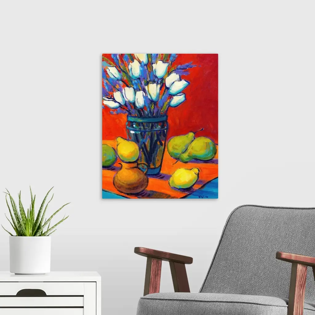 A vertical contemporary painting of a glass vase of eloquent flowers and pears.