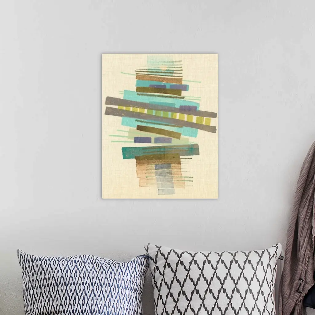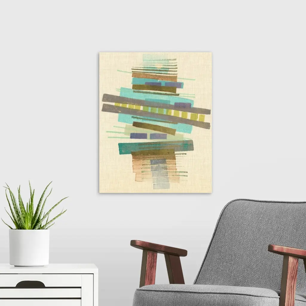 Mid-century inspired abstract artwork using muted colors in stacked rectangular shapes.