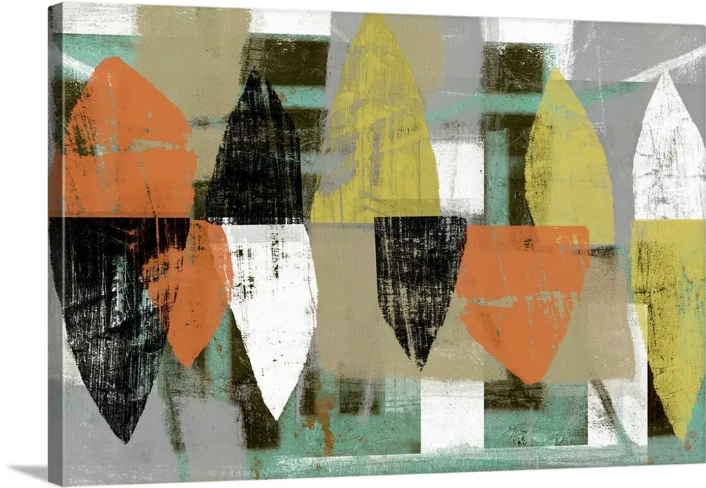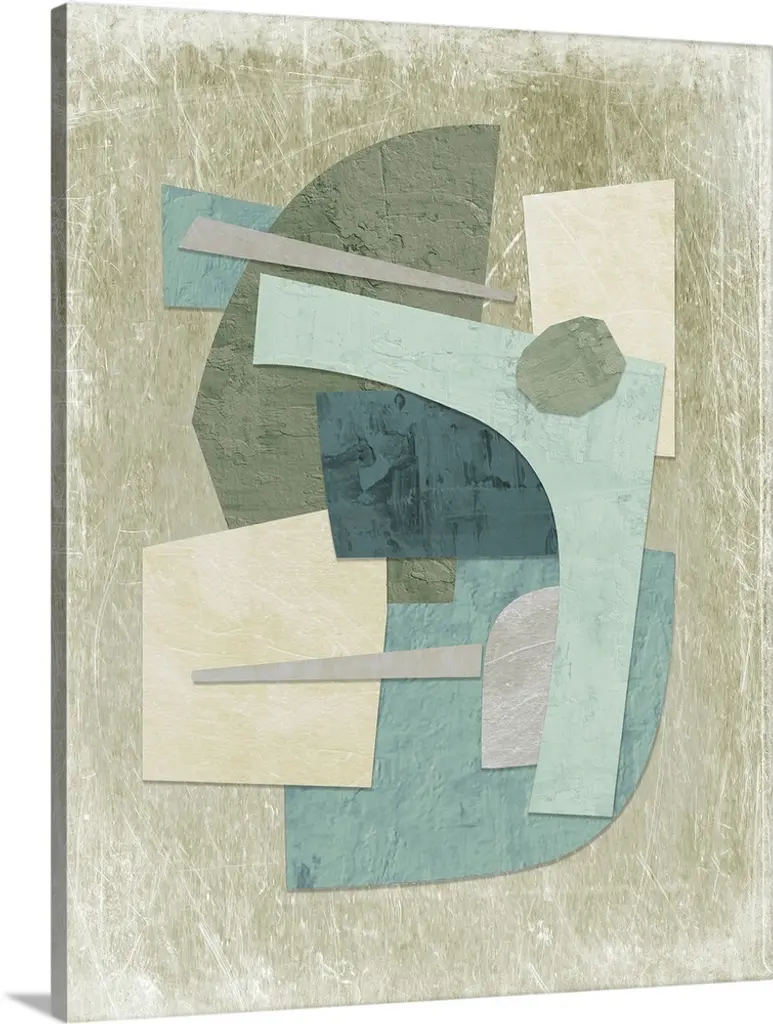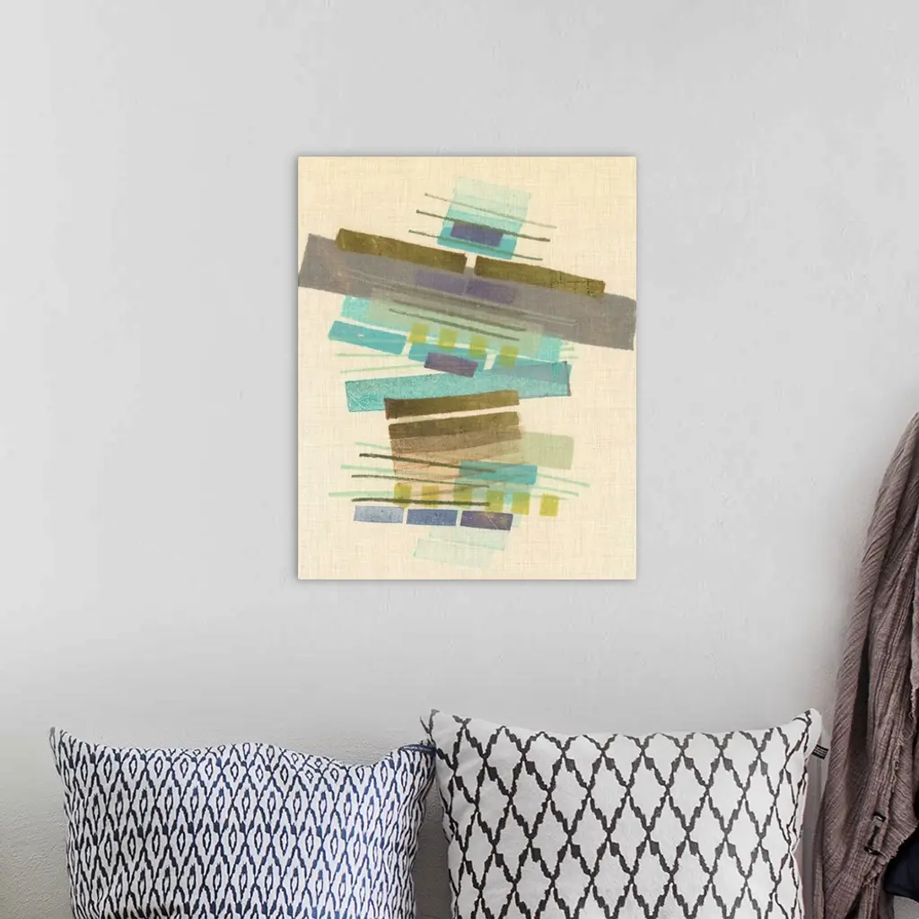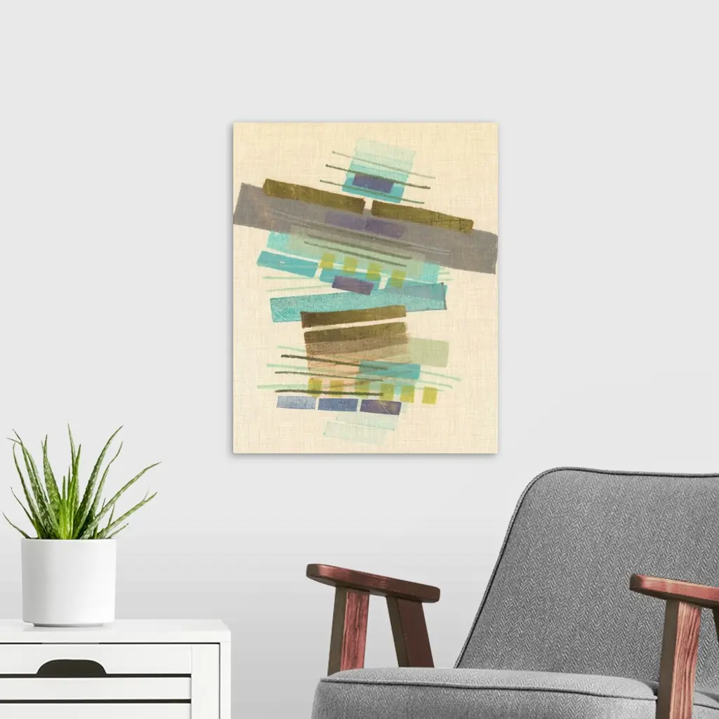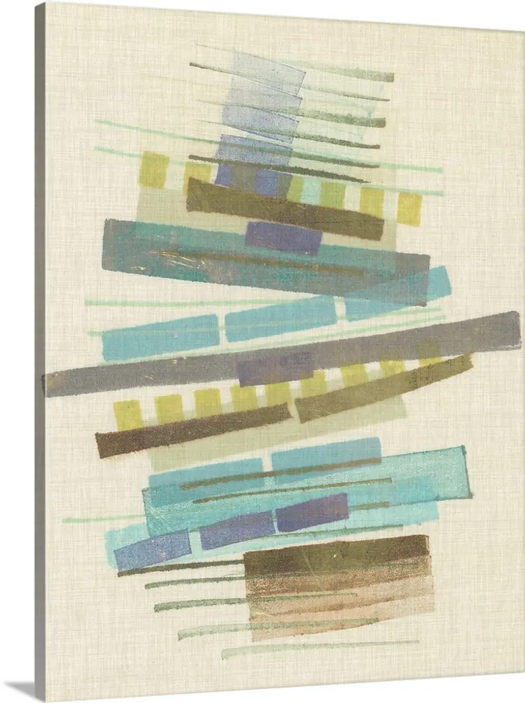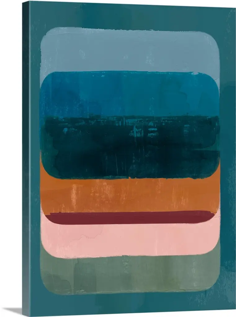 Mid-century inspired abstract artwork using muted colors in stacked rectangular shapes.