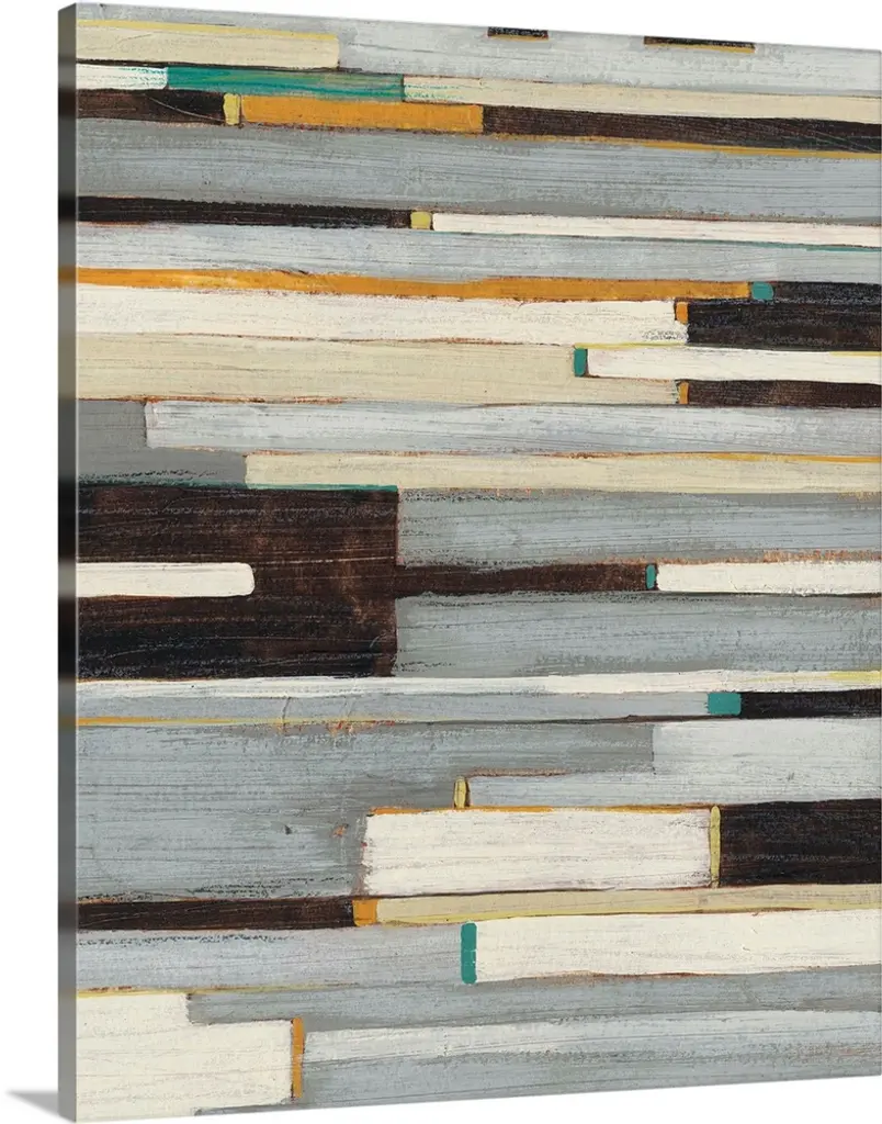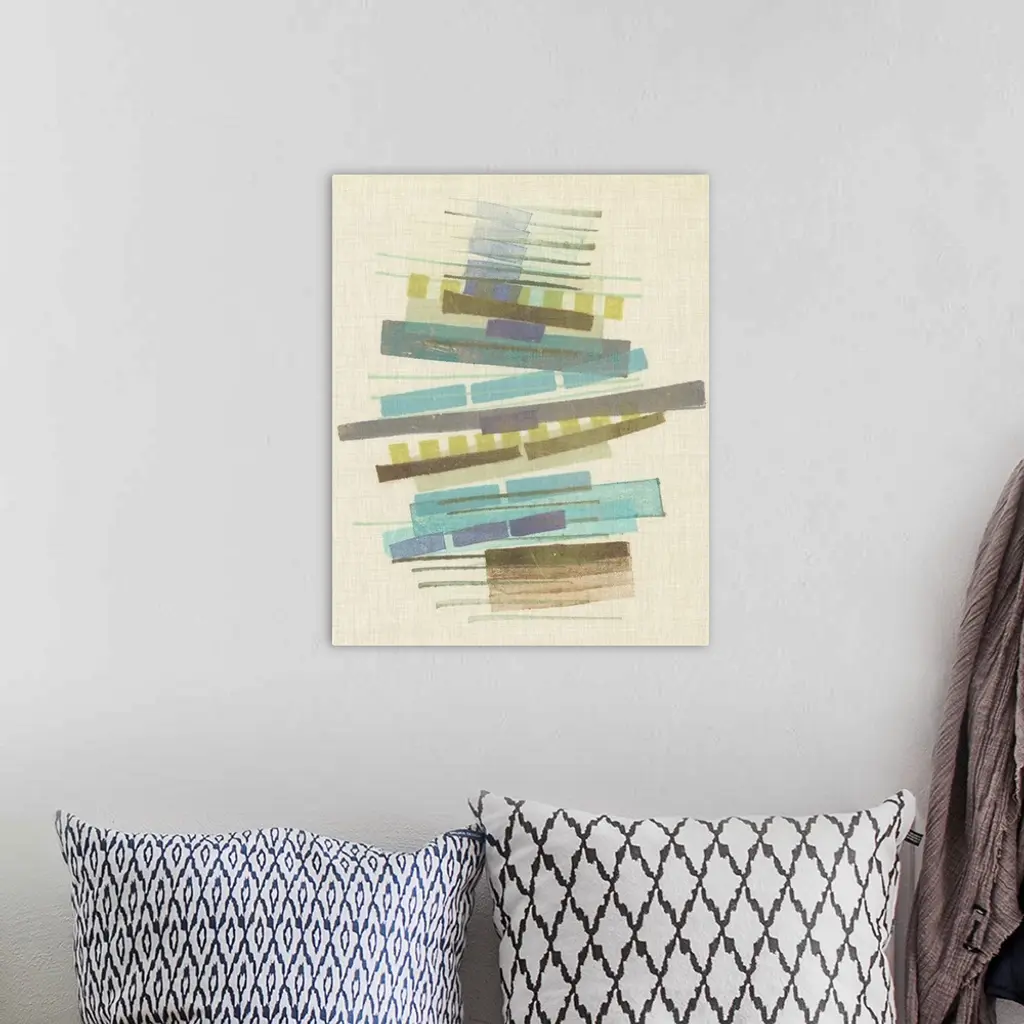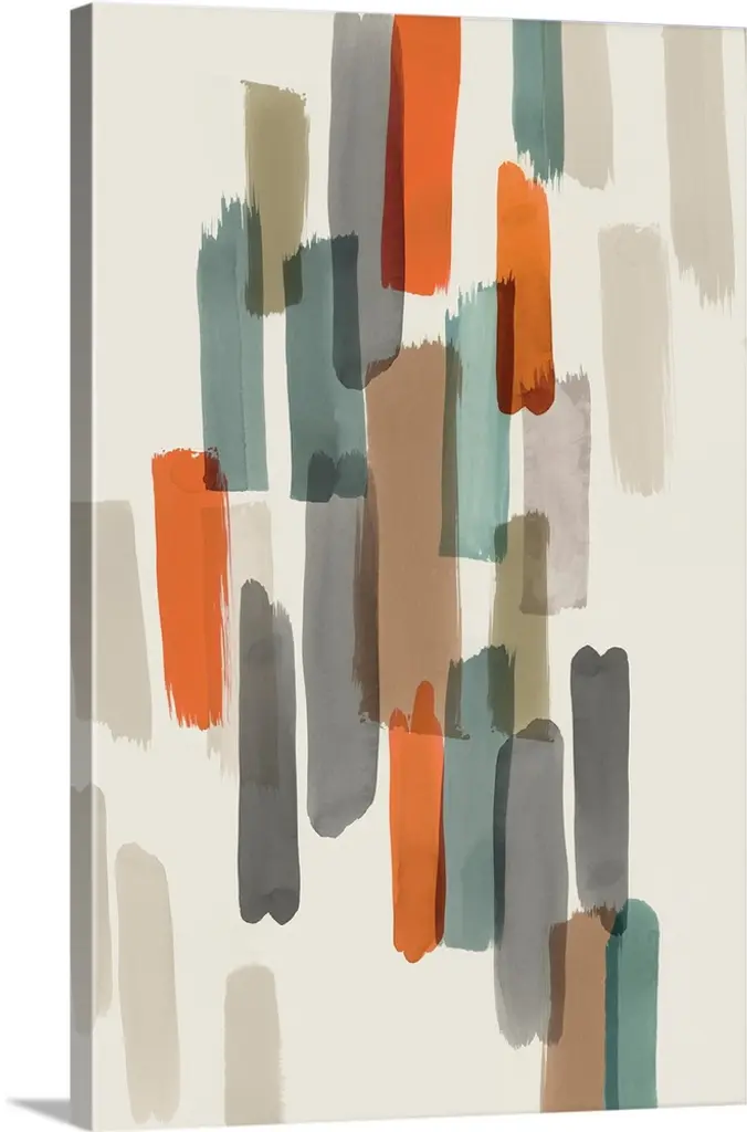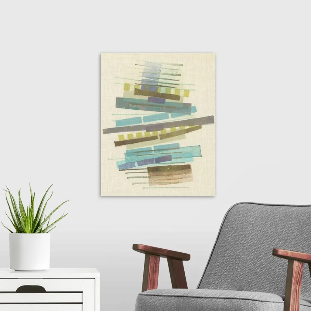 Mid-century inspired abstract artwork using muted colors in stacked rectangular shapes.