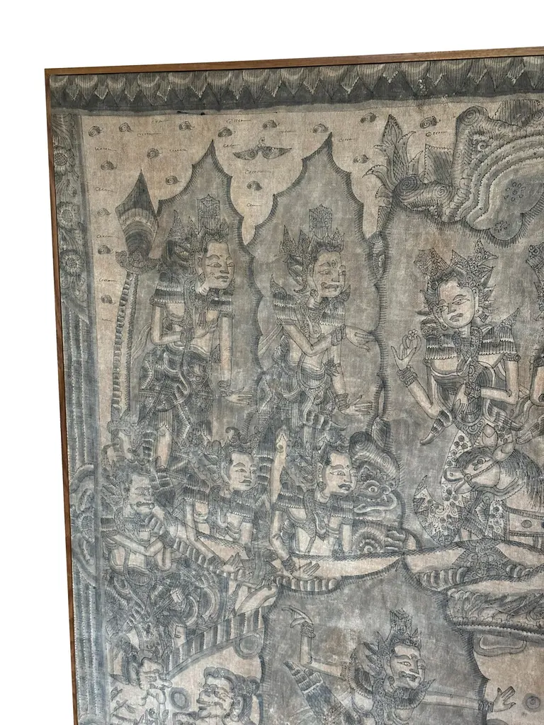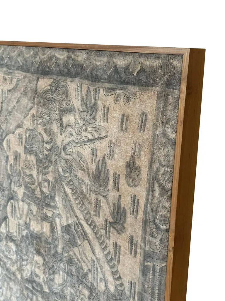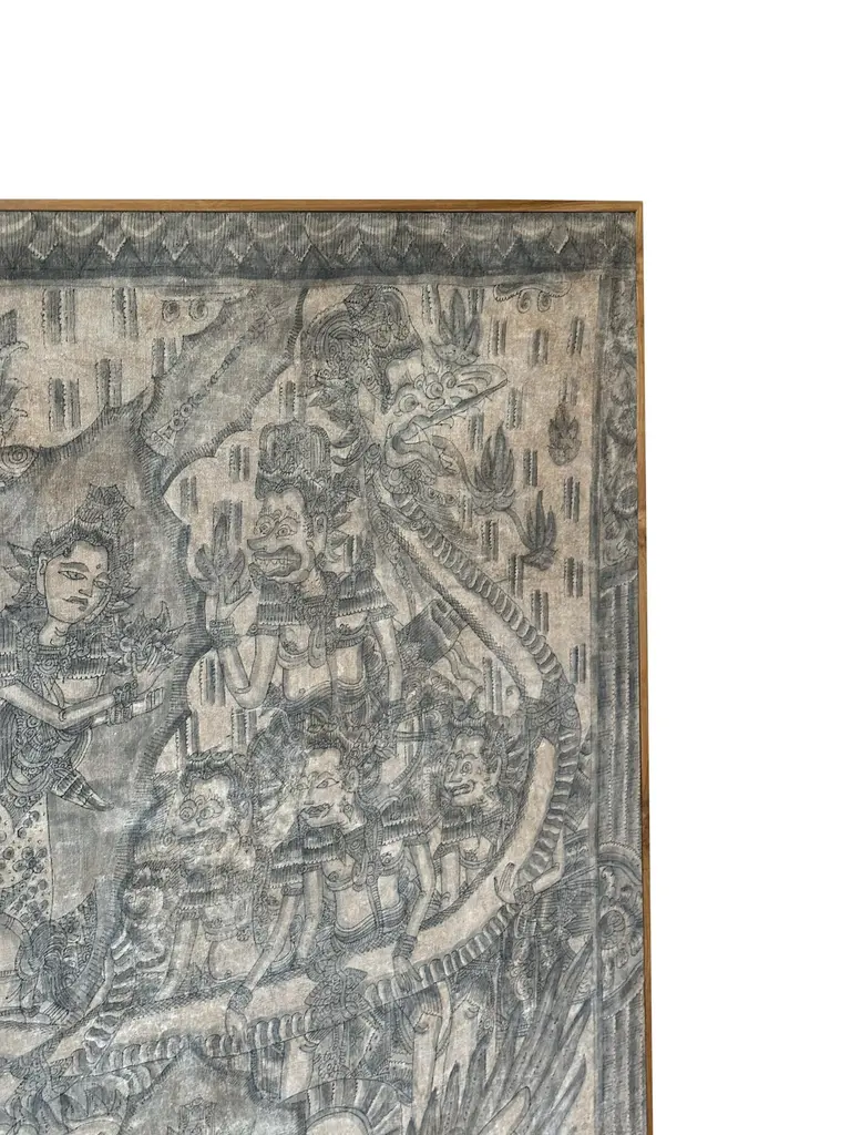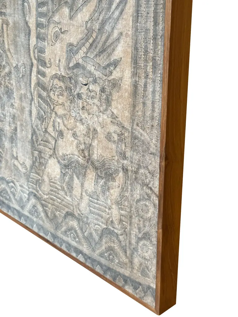 A mid-20th century 'Kamasan' cotton textile painting from Bali, Indonesia. The hand-painted image has great detail and depicts Balinese Hindu mythology. Key features of this image are the large "naga" (hindu dragon). It is stretched over a canvas, bordered by a teak wood frame and is ready to be wall mounted. Paintings such as these would often adorn the ceilings of temples or homes belonging to high cast individuals and royalty.