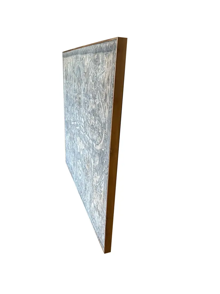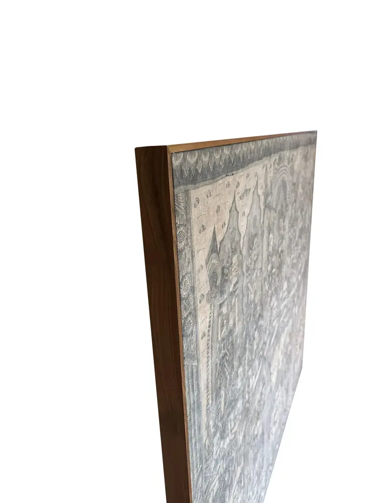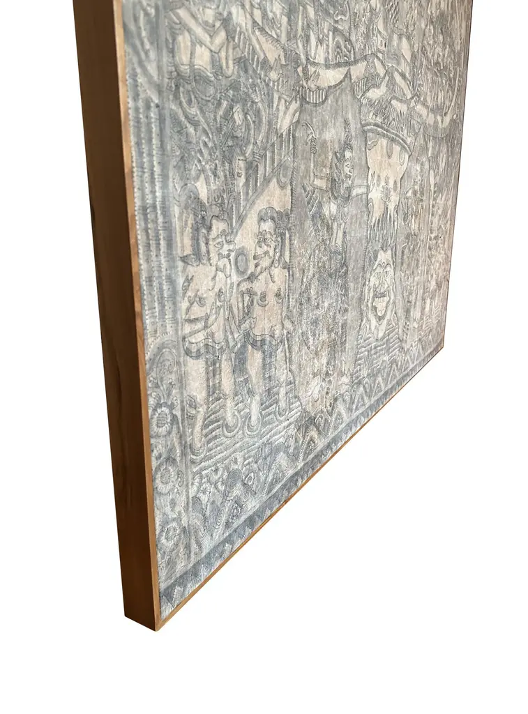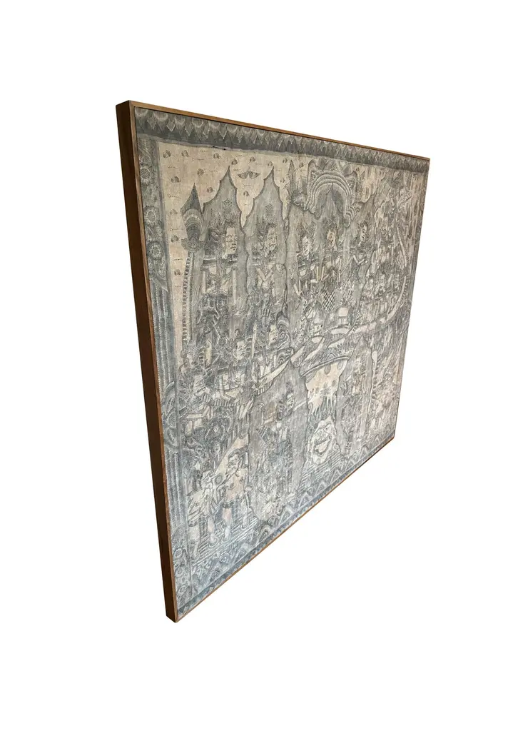 A mid-20th century 'Kamasan' cotton textile painting from Bali, Indonesia. The hand-painted image has great detail and depicts Balinese Hindu mythology. Key features of this image are the large "naga" (hindu dragon). It is stretched over a canvas, bordered by a teak wood frame and is ready to be wall mounted. Paintings such as these would often adorn the ceilings of temples or homes belonging to high cast individuals and royalty.