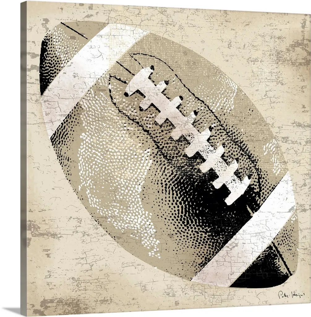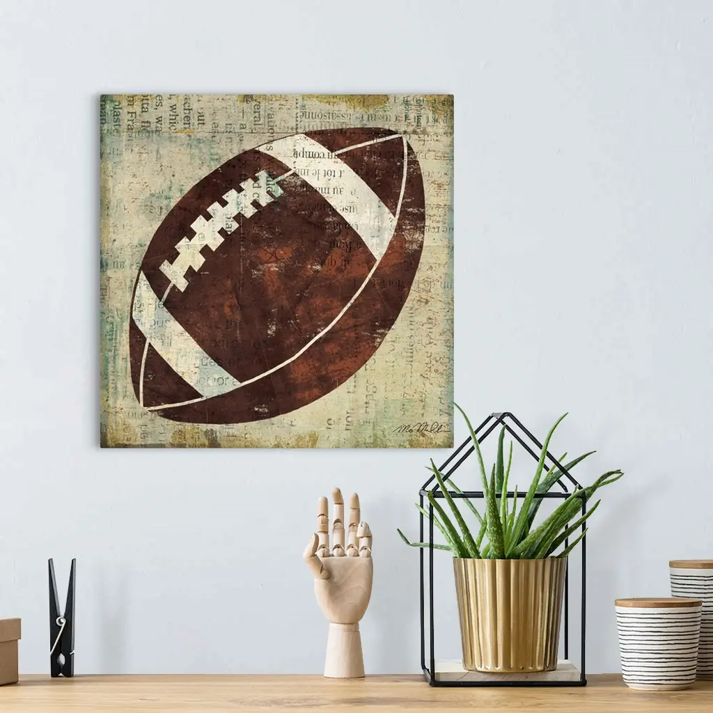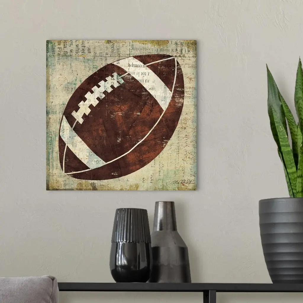 Home decor wall art that is square in shape. This artwork is a simplified American football painted over a collage of text.