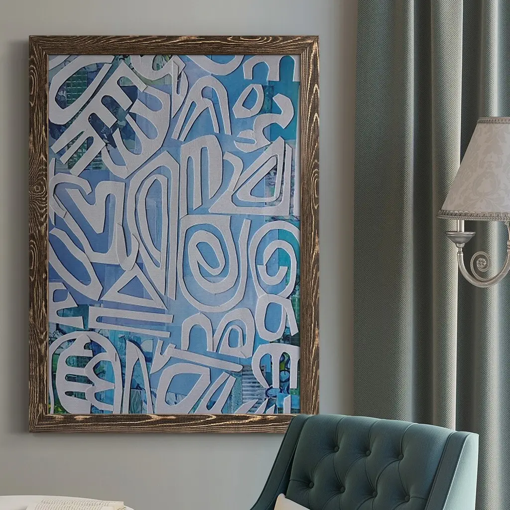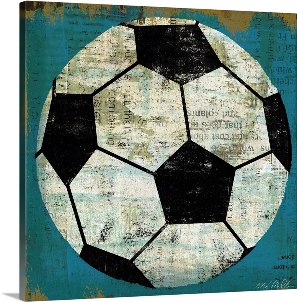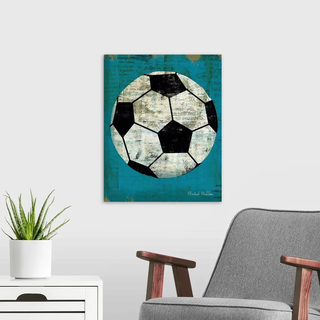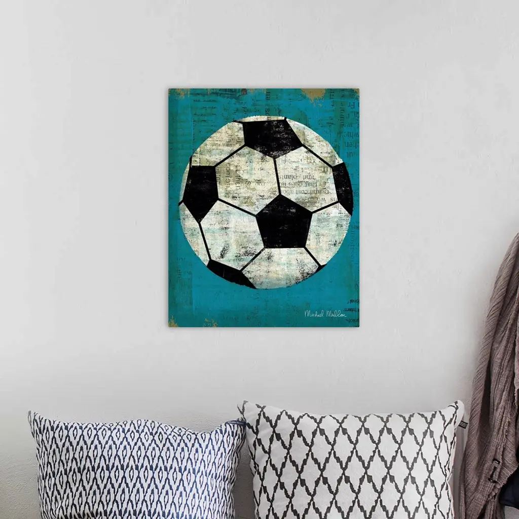 Contemporary artwork of a soccer ball against a weathered blue background.