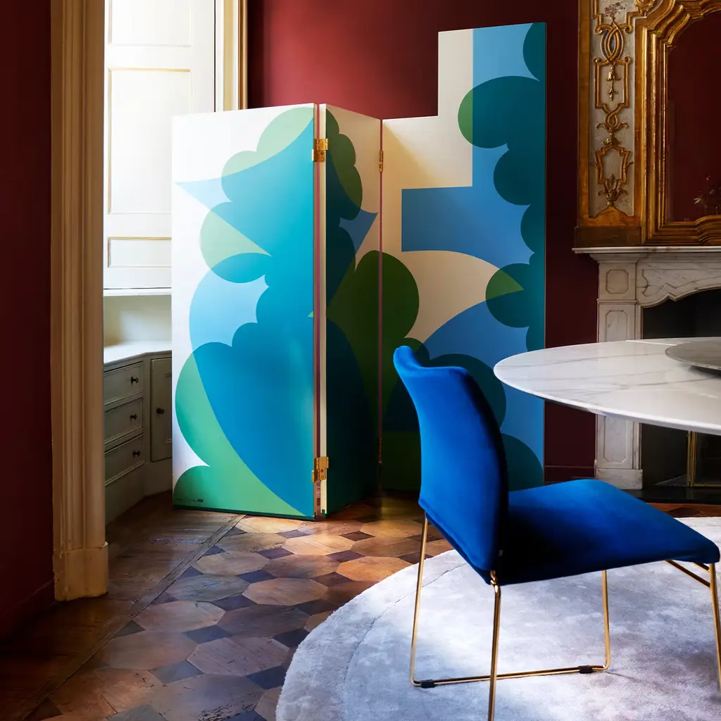 This wooden room divider is inspired by an original tempera and pencil sketch by Giacomo Balla. Revived by Cassina, it brings a bold artistic touch to any space. The Balla Room Divider features three honeycomb panels of varying sizes, joined by brushed brass double-action hinges that honor the original design. Its silk-screen decoration comes in white/blue/green or another color option. Part of Cassina I Maestri, it bears the designer’s signature and a serial number for authenticity.