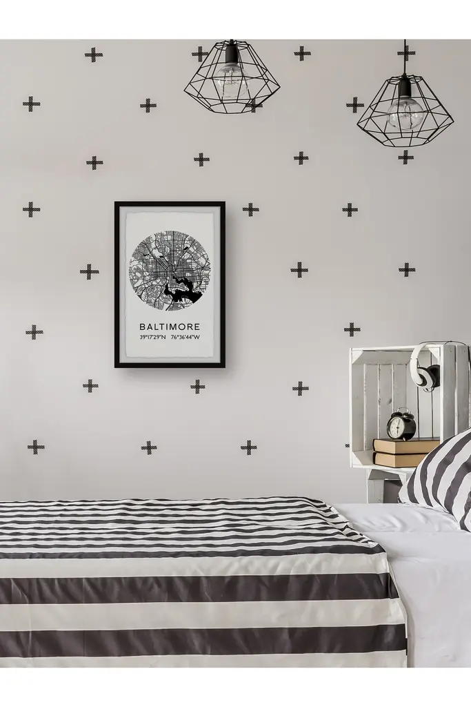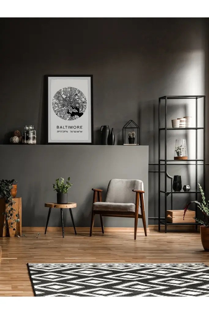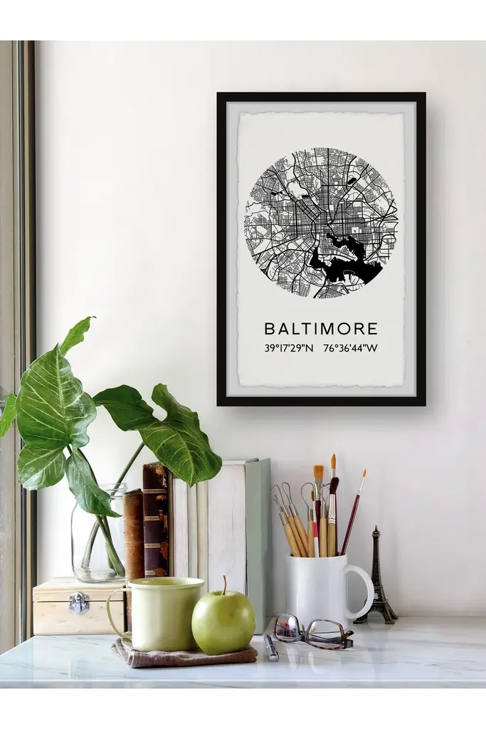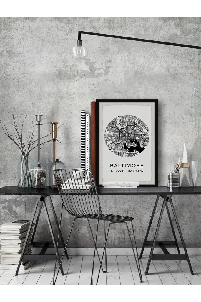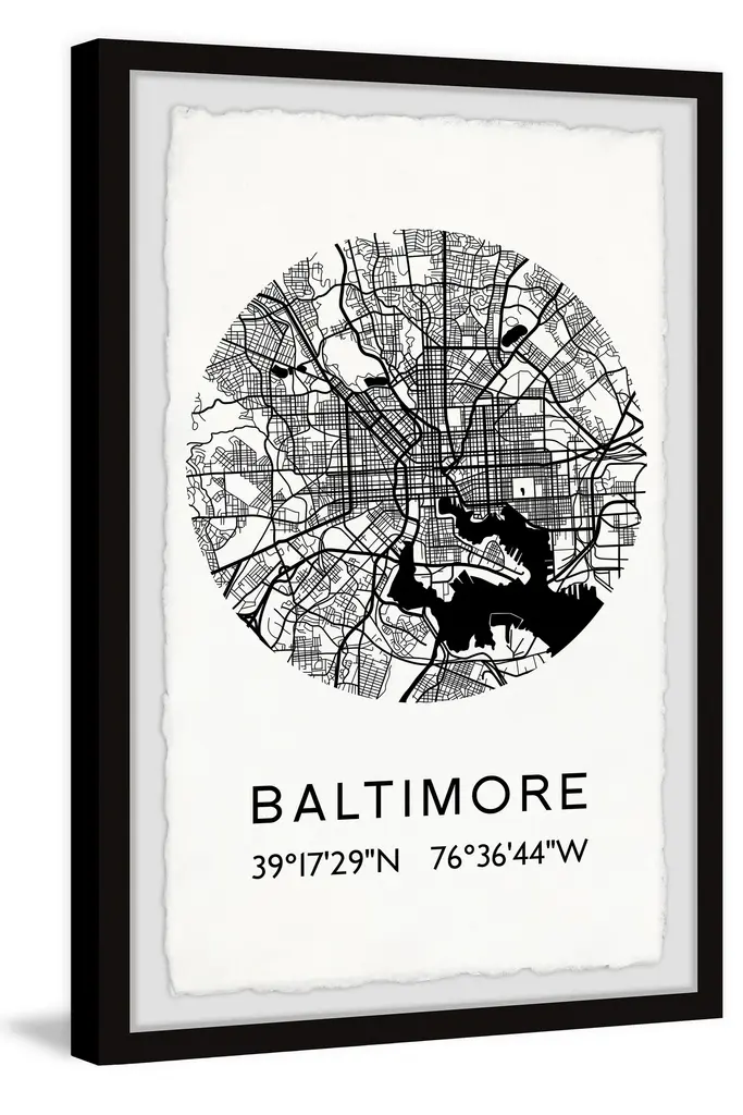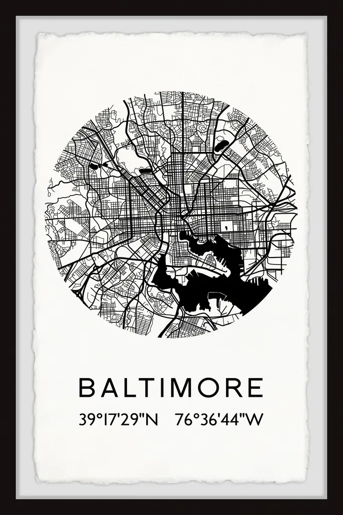 Nicknamed Charm City, this black and white print features the city of Baltimore and its coordinates on the map. Proudly printed in the USA, this piece is printed on high quality archive paper and professionally hand-framed. With wall-mounting hooks included, this artful accent is ready to hang up as soon as it reaches your front door.Top quality Gicle print on high resolution Archive PaperHand cut deckled edgesHigh quality durable non-warping frameFinished under shatter resistant plexiglassArrives ready to hangIncludes a certificate of authenticityPrinted in the USA