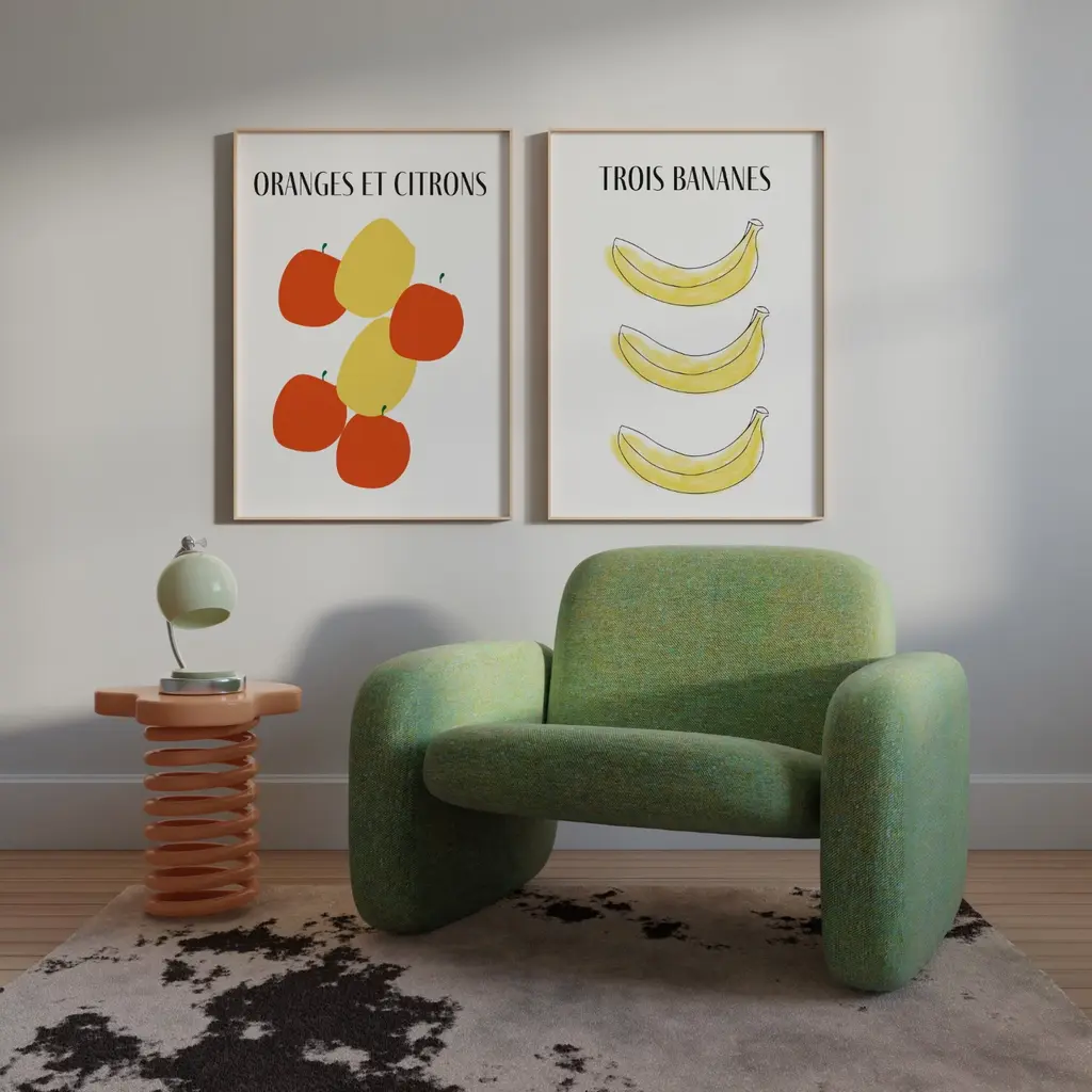 Three Bananas French art print inspired by abstract prints and retro design. Pair with green plants, mid century furniture and a dash of fresh sunlight for the ultimate chefs kiss! Sold without frameGiclée printed on Munken pure smooth cream paper which is certified by the Rainforest Alliance Program for FSC® Standards.