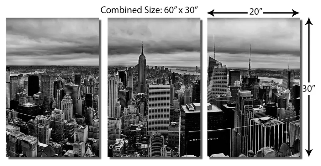60"œ x 30"œ total size. Ready To Hang! (3 pieces - 20"œ x 30"œ each). 3 Panel Split (Triptych) Beautiful New York City skyline in Black and White. Modern metal wall art for home or office wall decor & interior design. Printed on Luxurious, HD aluminum glossy metal panels. Multi panel art.. HD aluminum panels. Metal print wall art. Includes Shadow Wall Mount on the back.• Aluminum Metal Wall Art• Made in USA• Ready to hang - No assembly required• Shadow mount hardware on the back• 0.045"œ thick HD Aluminum Panels• Scratch resistant, glossy finish• Superb color clarity, luxurious prints• Epson printing process• For indoor or moisture rich environment use• Easy to clean. Gently wipe with microfiber cloth.