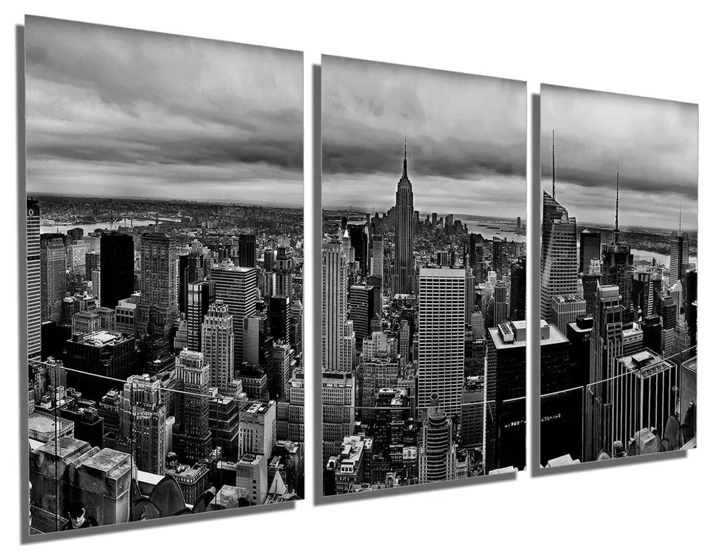 72"œ x 36"œ total size. Ready To Hang! (3 pieces - 24"œ x 36"œ each). 3 Panel Split (Triptych) Beautiful New York City skyline in Black and White. Modern metal wall art for home or office wall decor & interior design. Printed on Luxurious, HD aluminum glossy metal panels. Multi panel art.. HD aluminum panels. Metal print wall art. Includes Shadow Wall Mount on the back.• Aluminum Metal Wall Art• Made in USA• Ready to hang - No assembly required• Shadow mount hardware on the back• 0.045"œ thick HD Aluminum Panels• Scratch resistant, glossy finish• Superb color clarity, luxurious prints• Epson printing process• For indoor or moisture rich environment use• Easy to clean. Gently wipe with microfiber cloth.