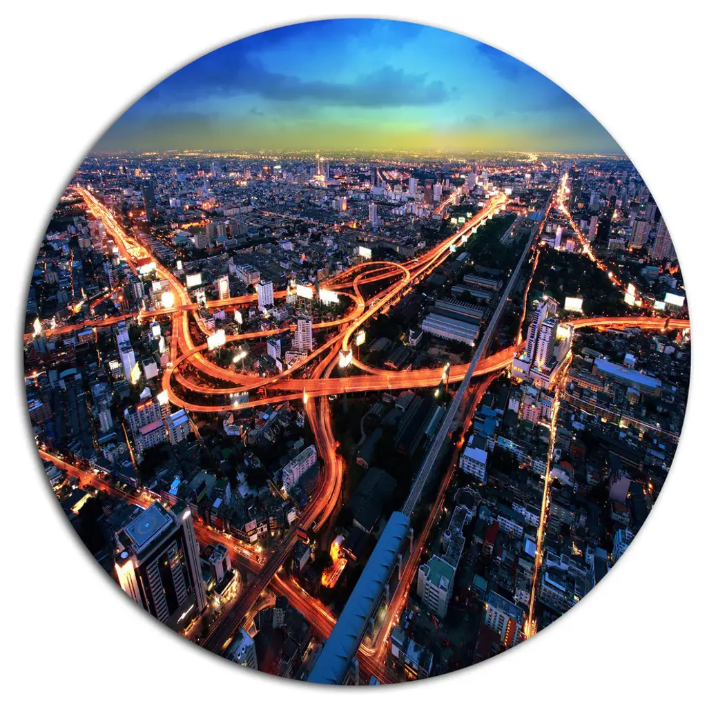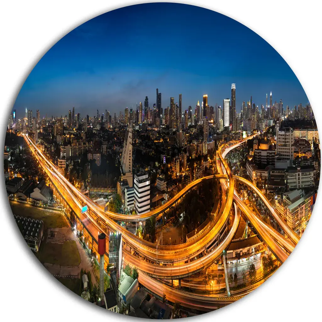 Bring Contemporary Abstraction to your home with this large Circle Metal wall art. This Bangkok Expressway Aerial View Metal Artwork makes it the focal point of any room or office. - White Gloss Coating ensures colors are extra vibrant with light reflection.- Aluminum grade Sheet Metal with 1 inch mounting frame on the back giving the illusion that the artwork is floating on the wall..- Mounting Brackets are included along with instructions.- High Quality Digital images are created directly into a glossy aluminum panel producing a stunning and captivating print into the glossy finish of the metal.- Water, Fire and Scratch resistant HD Aluminum panels.- Looks better than any photo paper and guaranteed to last at least 20 years- Easy to clean with a microfiber cloth. Colors are far superior to regular Canvas Art. - Easy to Hang