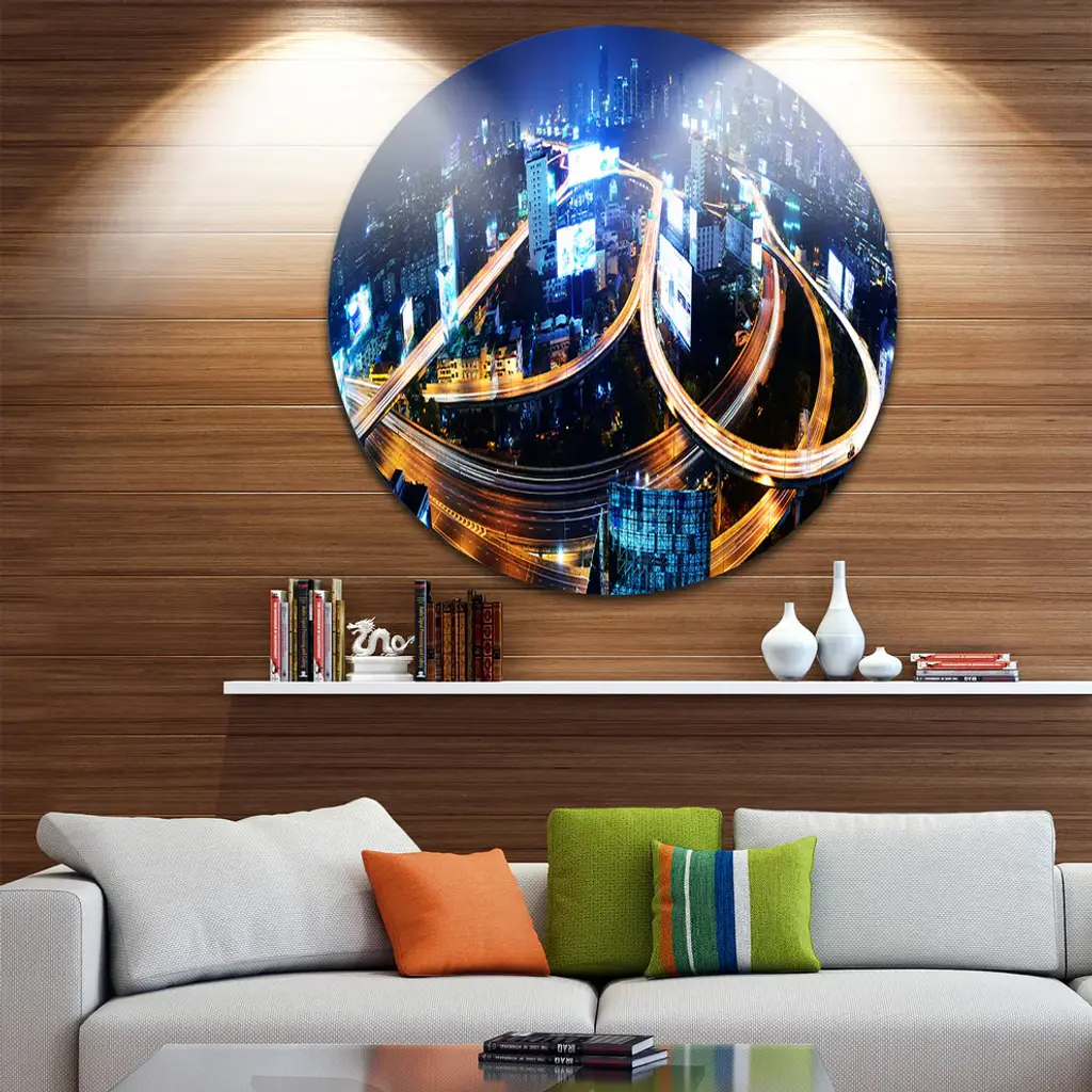 Bring Contemporary Abstraction to your home with this large Circle Metal wall art. This Bangkok Expressway Aerial View Metal Artwork makes it the focal point of any room or office. - White Gloss Coating ensures colors are extra vibrant with light reflection.- Aluminum grade Sheet Metal with 1 inch mounting frame on the back giving the illusion that the artwork is floating on the wall..- Mounting Brackets are included along with instructions.- High Quality Digital images are created directly into a glossy aluminum panel producing a stunning and captivating print into the glossy finish of the metal.- Water, Fire and Scratch resistant HD Aluminum panels.- Looks better than any photo paper and guaranteed to last at least 20 years- Easy to clean with a microfiber cloth. Colors are far superior to regular Canvas Art. - Easy to Hang